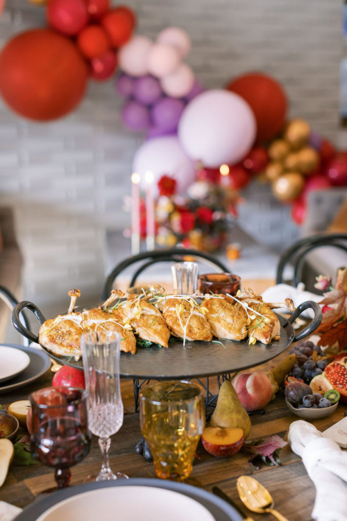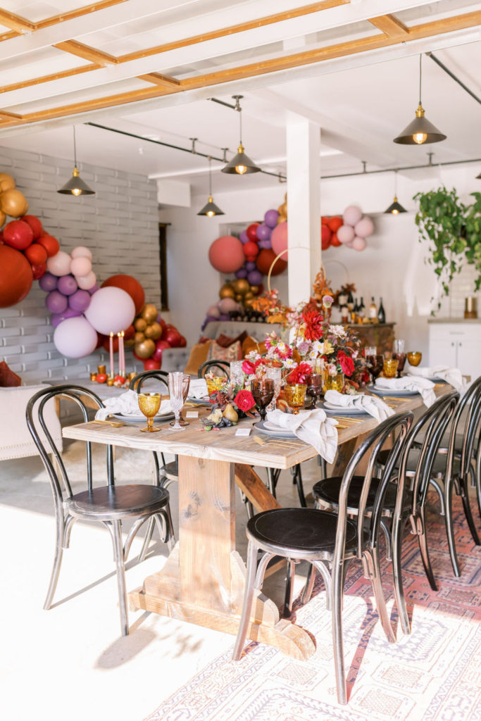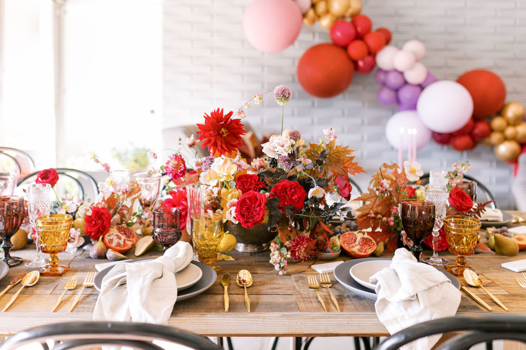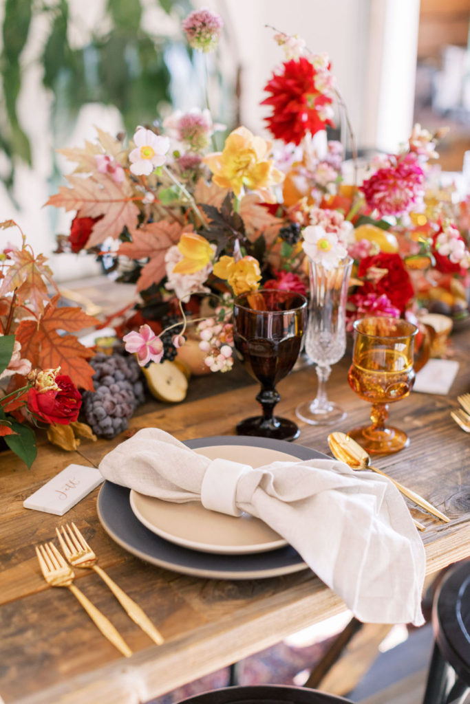 Центральным элементом торжества стал праздничный стол, сервированный с особым вкусом. От скатерти отказались, чтобы было больше природных мотивов — на деревянной поверхности стола посуда из цветного стекла смотрелась особенно здорово. А золотые столовые приборы стали классным акцентом. Живые цветы в изящных вазах создавали романтическую атмосферу, а их нежный аромат наполнял помещение.