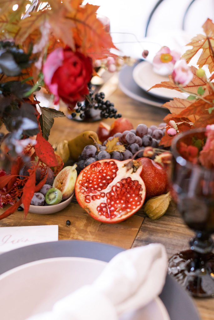 Настоящие фрукты стали главным украшением стола. Спелые гранаты, инжир, груши и виноград образовывали живописные композиции, добавляя свежести и природной красоты! Настоящее осеннее изобилие и праздник урожая!