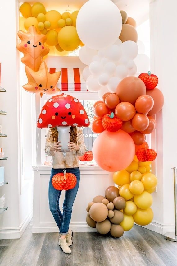День благодарения, отмечаемый в США — это неиссякаемый источник вдохновения для осенних дней рождения :) А все потому, что детские вечеринки на тему Дня благодарения декораторы оформляют милыми осенними элементами. Например, как этот праздник! Лесная посуда в виде грибочков, много оранжевых, желтых и зеленых тонов, тыковки во всех проявлениях, воздушные шары. Идеальное оформление для осени, которое подойдет и мальчикам и девочкам, особенно малышам. Оформление было очень минималистичным — весь декор на фоне белых стен, из самых больших и пышных элементов были гирлянды из шаров, а мелочи — угощения в осеннем стиле. Декораторы подобрали осенние шарики в форме листьев и грибов, а гирлянду украсили тыквами-сотами. Тортик вышел просто чудесным — три простых яруса, но зато украшенные грибами, как лесной пенек! Подставка заслуживает отдельного внимания :) Сделать такой же праздник дома — очень легко! Мы подберем вам подходящие шарики и посуду, а наш декоратор Женя сможет сделать дизайнерские украшения, например, гирлянды, этикетки для бутылок, плакаты и многое другое. Листайте ниже, мы собрали для вас подходящую посуду и декор, которые украсят ваш осенний день рождения!