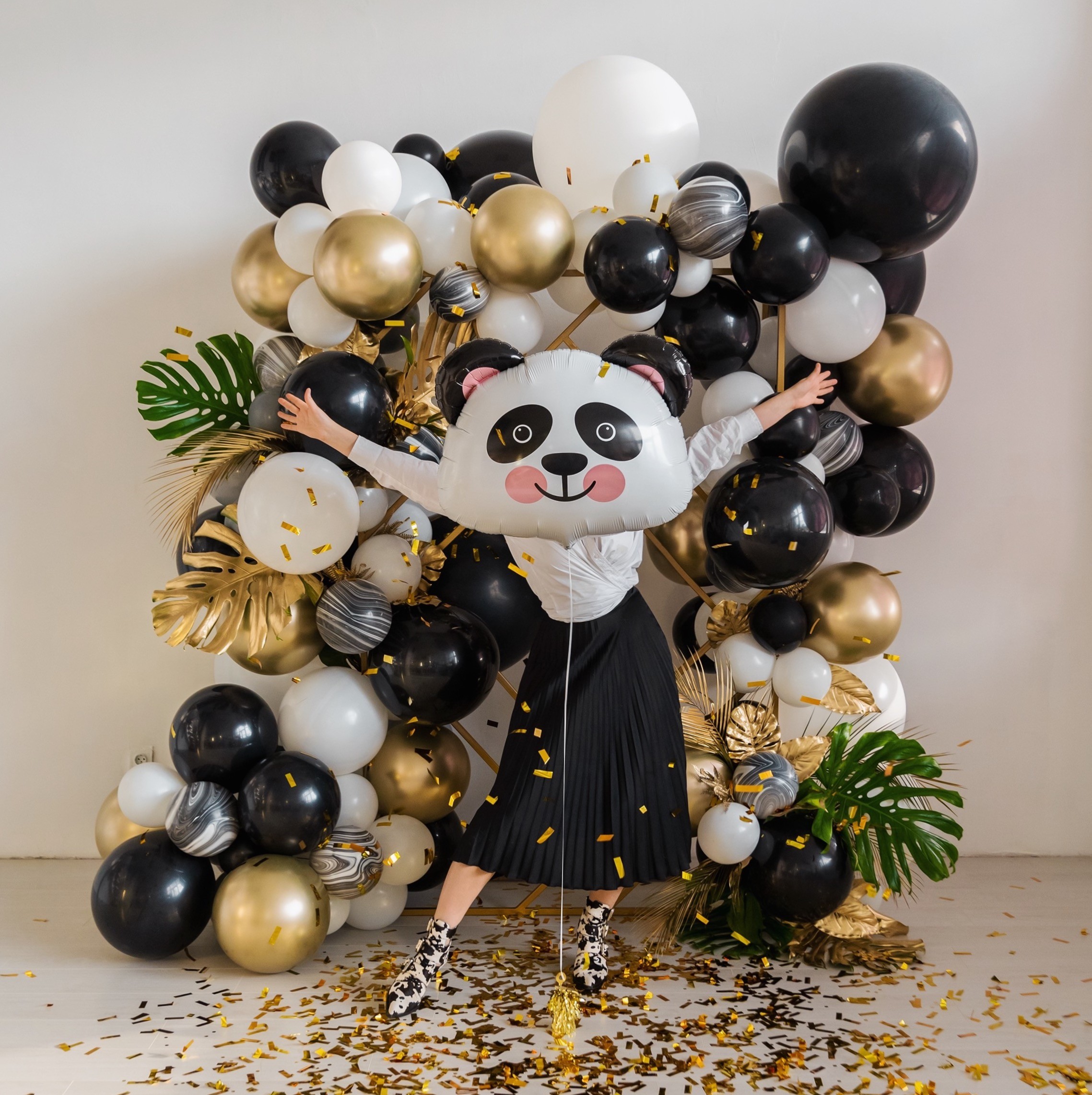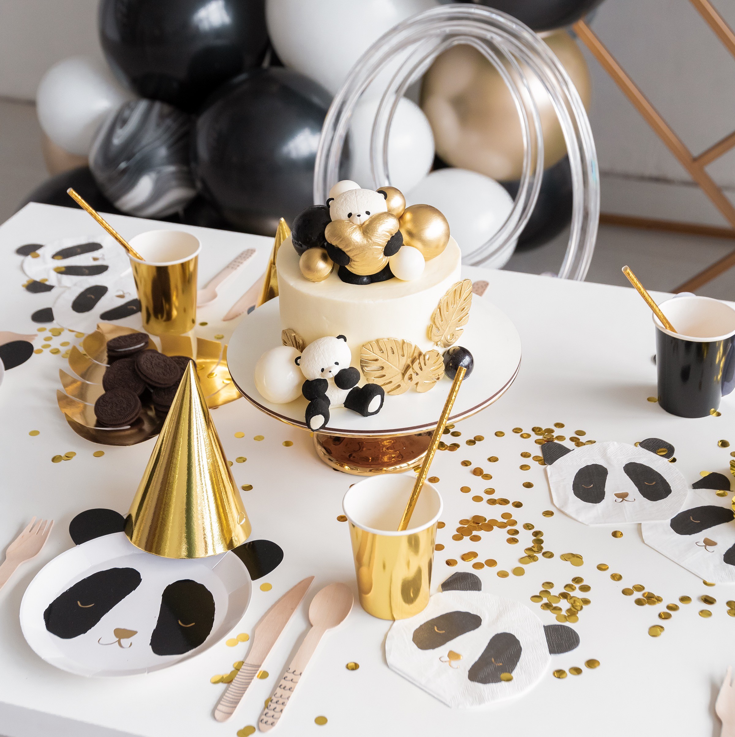 Нет, это не то, о чем вы подумали :) Это настоящая пандамания от чудесной Айрин, создающей потрясающие оформления своими золотыми руками. Если вы фанаты милых панд, то такой декор придется вам по душе! Кому нужны мишки Тедди, когда можно любоваться на таких очаровательных панд! Тортик идеально вписался в декор. К черно-белой гамме прекрасно подойдут золотые акценты, которые сделают оформление роскошным и праздничным, а без зеленых листочков в тропическом лесу точно не обойтись! Покрашенные в золото пальмовые листы выглядят очень стильно, особенно, в сочетании с конфетти. Даже свисточкам нашлось применение — мы любим, когда их используют в сервировке стола. В качестве фона Айрин соорудила такую стильную арку с черно-бело-золотой гирляндой. Очень классно, когда к воздушным шарам добавляют различные элементы, как здесь композиции из золотых и зеленых тропических листиков. Берите на заметку, такая арка может стать отличным фоном для фото на взрослом празднике! Если ваш декор яркий и привлекает много внимания, то лучше использовать нейтральный фон, это относится как к столу — простой белый подойдет как нельзя лучше, так и к помещению. На белом фоне и пастельные украшения смотрятся очень выигрышно! Эту классную посуду можно найти в коллекции Panda Party! Попробуйте придумать свое сочетание, используя, например, наши тропические коллекции.