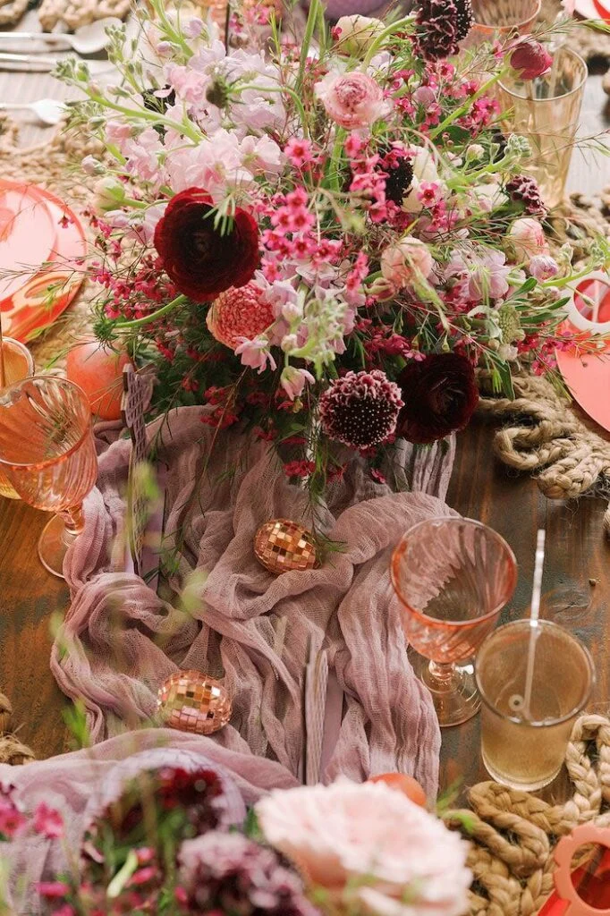Нам очень понравилась богатая сервировка стола: по центру протянули дорожку из легкой ткани пыльно-розового цвета, разложили маленькие диско-шары и расставили яркие цветочные композиции.Был лёгкий налёт стиля бохо в плетёных подставках и посуде из цветного стекла.