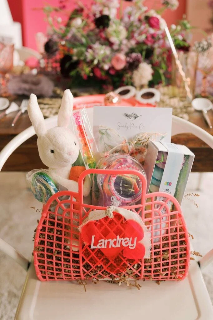 В корзинках были плюшевые зайчкии, сладости (макаронс), солнечные очки и другие мелочи.