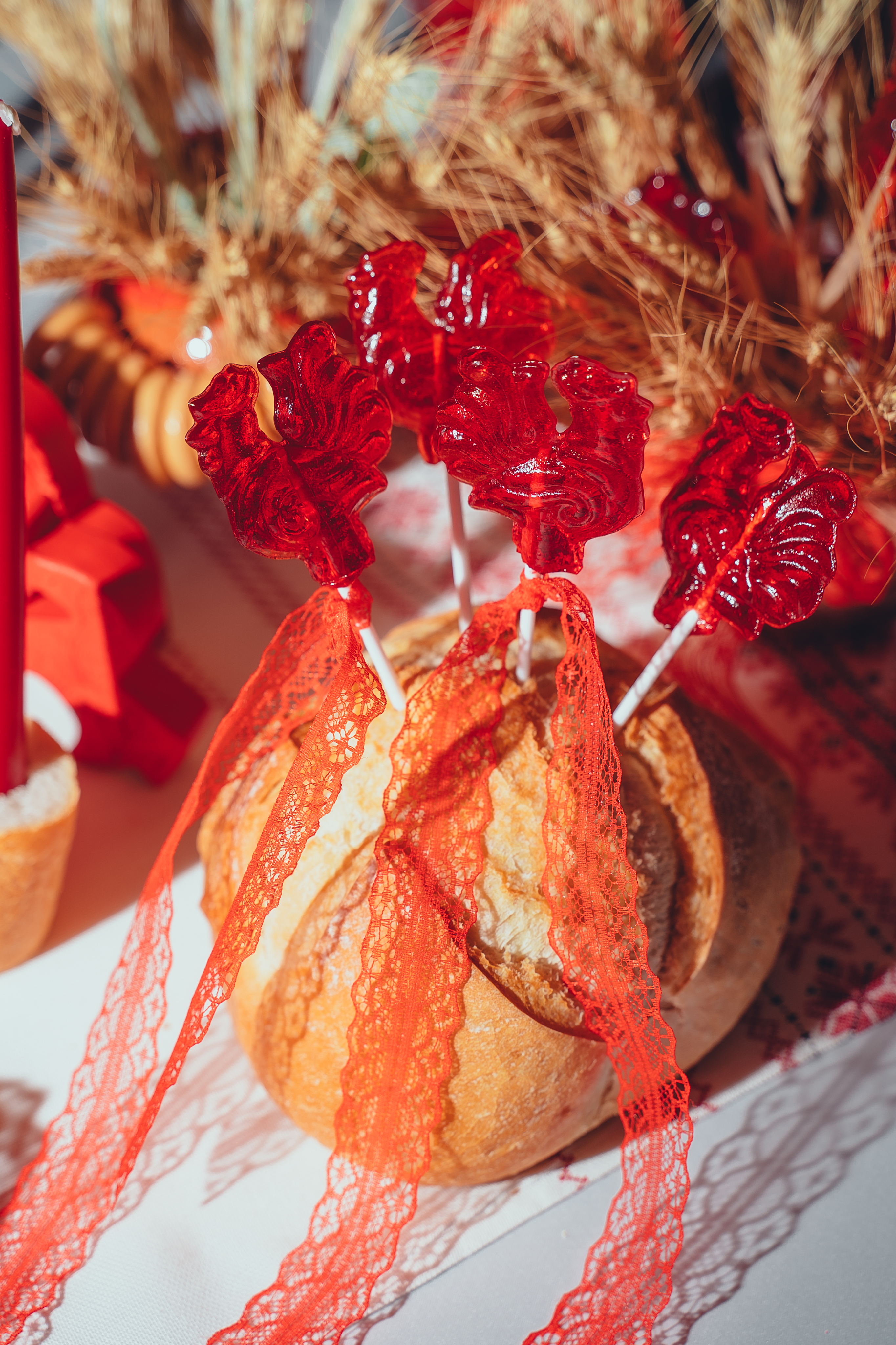 В оформлении стола мы придумали множество нестандартных решений. Например, использовали пышный домашний хлеб в качестве подставки под леденцы-петушки, а их самих украсили кружевными красными лентами.
