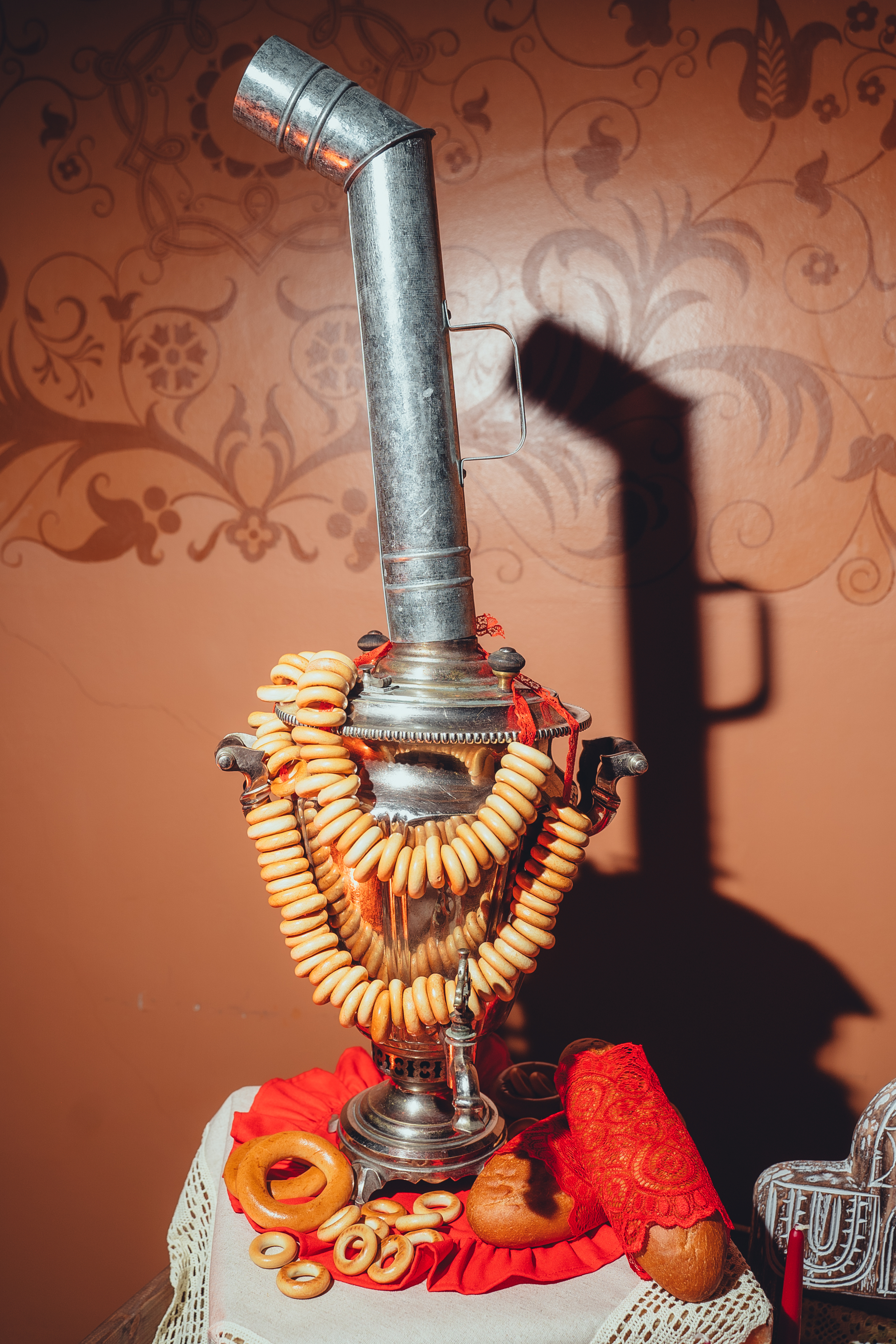 На сладкий стол поставили самовар, расстелили разные скатерти и салфетки, украсили всё сушками, бубликами и хлебом. Настоящая, русская атмосфера чаепития.