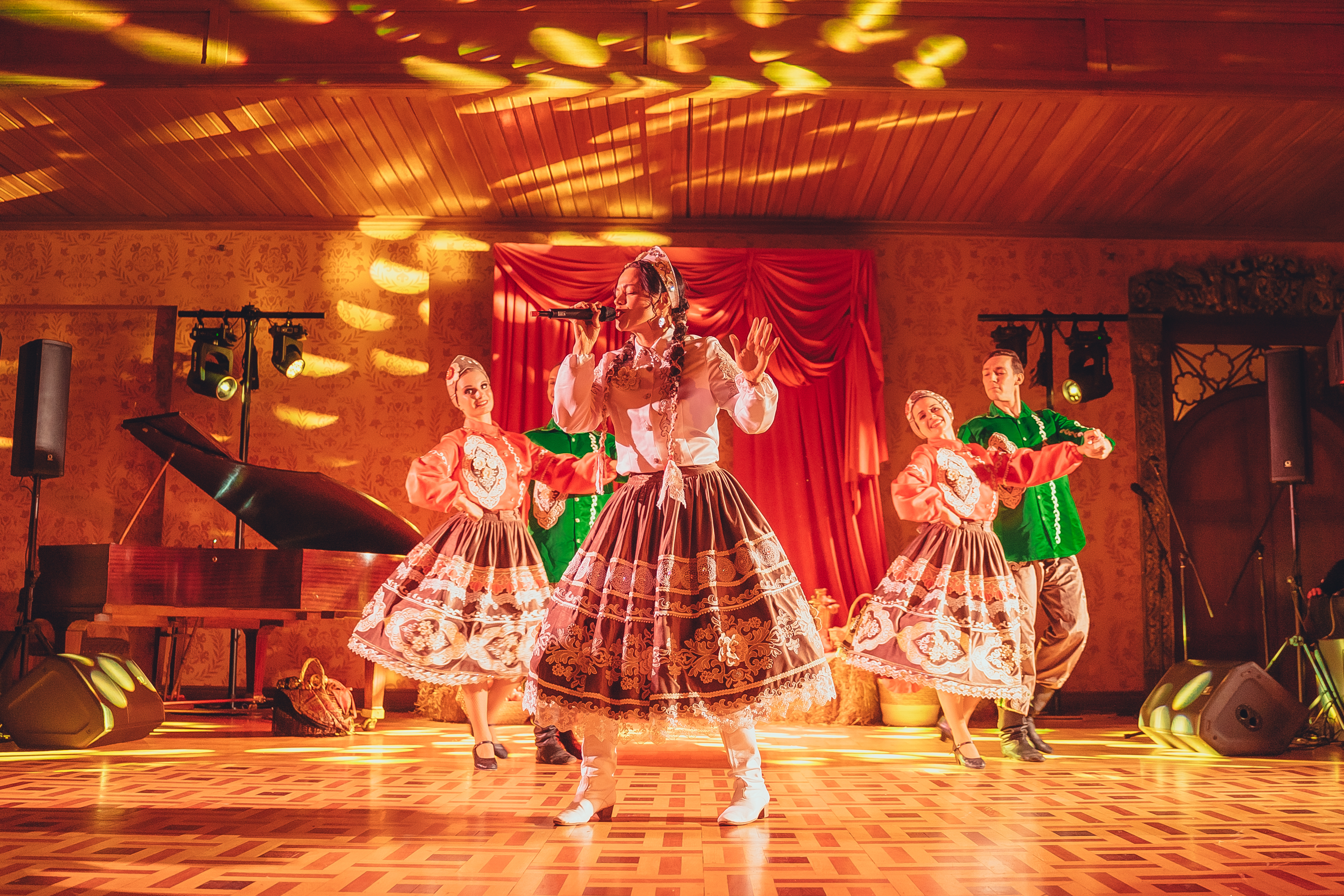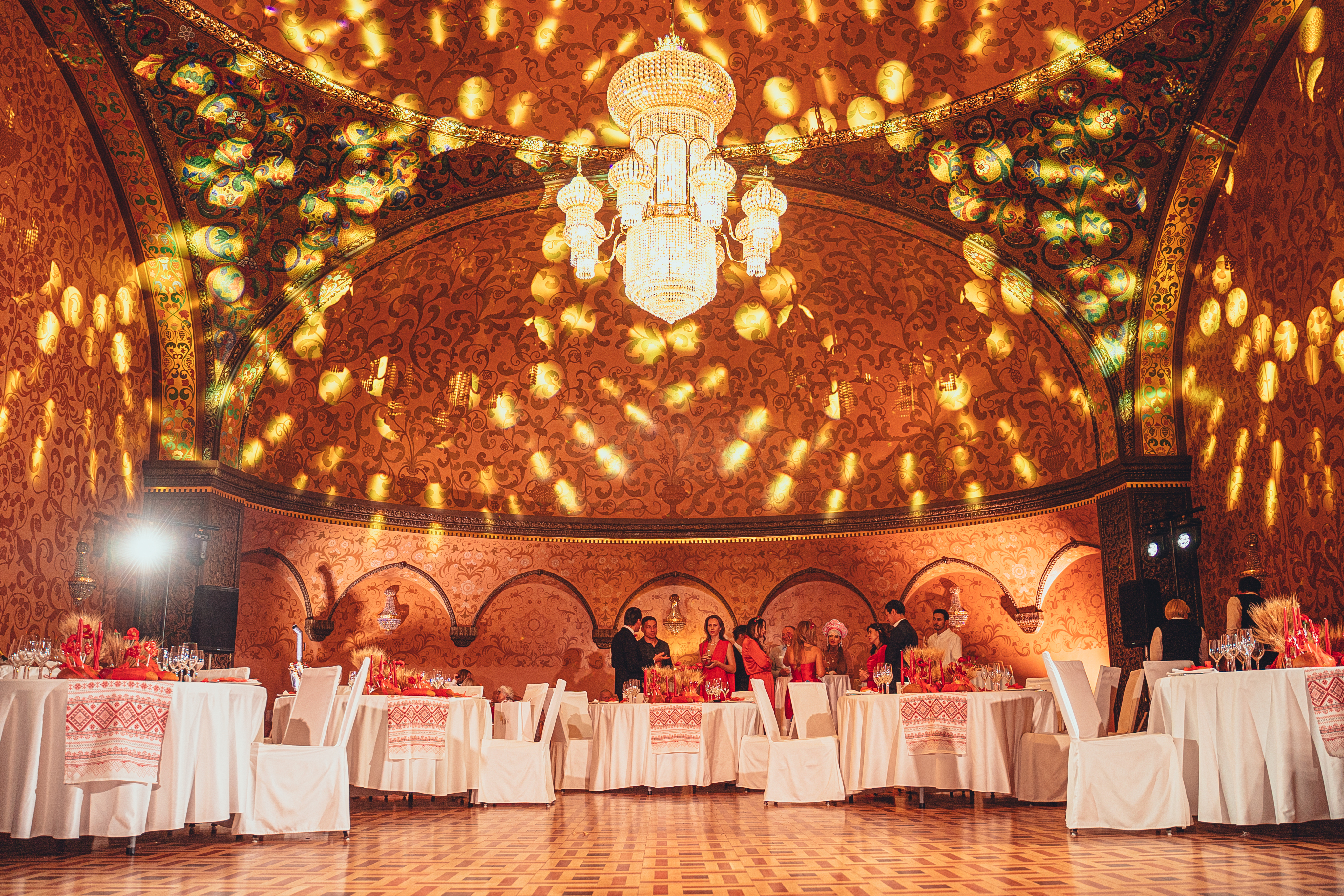 Особую сложность представлял сам зал: купольная конструкция создавала проблемы со звуком и светом. Акустика «гуляла», звучание различалось в разных точках помещения — но наша команда нашла решение и грамотно всё настроила. Но само помещение же великолепно, вы согласны? Легко представить себя в нарядных палатах, где проходит самый настоящий русский пир!