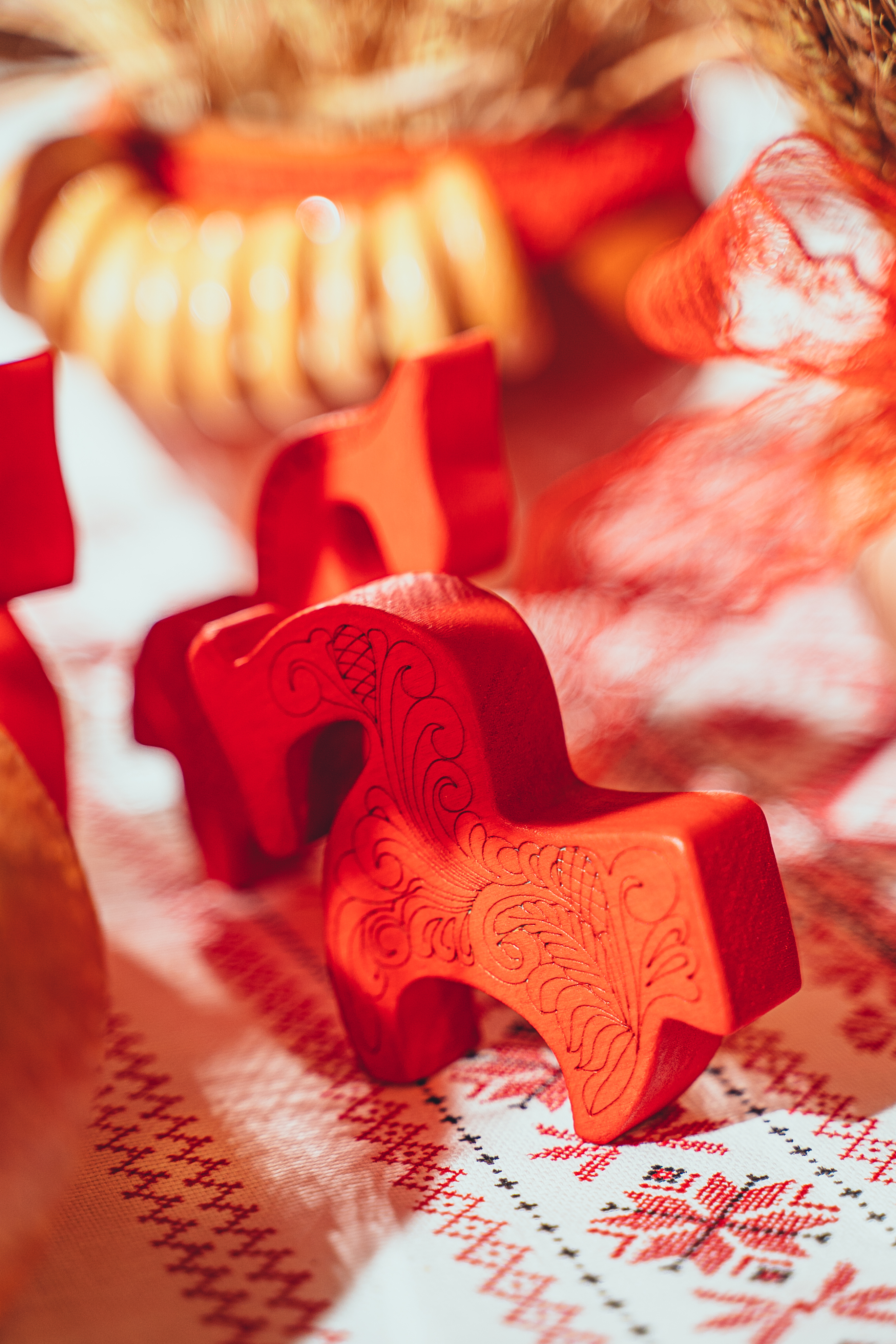 Гости не переставали замечать всё больше новых деталей, а мы очень сильно старались всех удивить. Например, расставили вот таких красных резных коней по столам.
