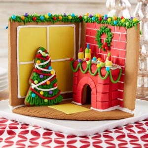 Чтобы украсить свой дом такой милой пряничной миниатюрой с камином, вам понадобится готовый набор для сборки (перед Новым годом их очень много во всех супермаркетах) или же свободное время для приготовления теста. В этом случае вы сможете пофантазировать и может быть построить целый домик! Если вы все же решили испечь домик сами, то следуйте нашим инструкциям! Вам понадобится: - все для теста (https://alexmilana.com/recipes/novyy-god-2017/imbirnoe-pryanichnoe-testo/) - картонные трафареты - разноцветная помадка - глазурь для украшения и склейки домика - кондитерский мешок (можно сделать самостоятельно) Шаг 1. Раскатайте тесто толщиной около 4-5 мм. Лучше всего использовать заранее подготовленные трафареты из картона. Вырезаем 2 стены, пол и елочку. Шаг 2. Для камина нам понадобится 4 куска теста: фронтальная часть с аркой, боковые и каминная полка. Шаг 3. Начнем с декора пола. Любым удобным инструментом нарисуйте на тесте фактуру дерева. Работать нужно быстро и периодически охлаждать тесто в холодильнике, чтобы оно не растаяло. Шаг 4.Выпекаем наш домик! Тесто не должно подгореть, но и не быть слишком мягким, иначе домик сломается при склейке. Шаг 5. На полу «стелим» коврик из желтой помадки. Лучше всего раскатывать ее на силиконовом коврике Шаг 6.Склейте камин глазурью и украсьте его красной помадкой. Тонким слоем покройте всю поверхность, затем нарежьте отдельные кирпичики сверху.Рецепт сахарной глазури:250 грамм сахарной пудры смешать с яичным белком. Добавьте 5 мл уксуса или сока лимона (лучше выдавить самим, так глазурь будет плотнее) и мешайте до загустения. Проще всего глазурь будет наносить кондитерским мешком.Шаг 7. Сразу после этого декорируем стену над камином. Тут придется повозиться – делаем белый фон и лепим на него множество кирпичиков. Между ними должны проглядывать белые швы. После этого можно присоединить наш камин. Не забудьте с помощью кондитерского мешка нарисовать веночек над камином! Фронтальную часть камина украсим яркой гирляндой. Шаг 8. На соседней стене у нас будет окно. Используйте большой квадрат желтой помадки и нарисуйте белую раму. Шаг 9. Займемся декором нашей елочки! Тут нам понадобится зеленая глазурь – просто добавим в нашу пищевой краситель. Кондитерским мешком рисуем «иголочки», затем рисуем мишуру и надеваем игрушки (любые бусинки для пищевого декора). Шаг 10. Ответственный момент! Склеиваем глазурью стены и пол между собой, ставим у окошка елку. Пряничный домик готов! Тщательно оберегайте его, уверяем, все захотят съесть эту ароматную красоту. Источник: https://www.wilton.com/