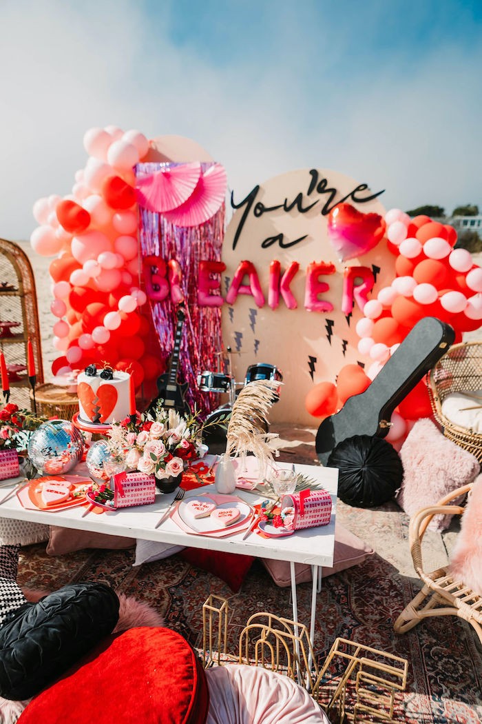 Что мы можем сказать — это точно самая необычная идея для оформления 14 февраля! Декораторы поразмыслили над словом "сердцеед" и решили, что такой термин как нельзя кстати подходит для рок-звезд. Так что всех малышей на этом празднике нарядили, как самую модную рок-группу! О 14 февраля на пляже мы можем только мечтать, но представьте этот декор дома на фоне белых стен — кажется, будет смотреться здорово! Кстати, тут же еще и стиль бохо присутствует, заметили? Множество перьев, колосков, подушечек и плетеной мебели. Бохо плотно вошел в арсенал декораторов в последние годы. Но нарушает это пастельное безобразие огромное количество ярких акцентов! Это дерзкий красный и чернильно-черный: подушки, музыкальные инструменты, шарики и черные молнии в фотозоне. Посмотрите на этих очаровашек! Так и хочется нарядить своих деток так же :) Угощения были самыми простыми, но очень яркими: разноцветные макаронс, тарелочки с закусками, подобранными по цвету, печенье-сердечки и огромный торт! Торт заслуживает отдельного внимания, он в виде разбитого сердца, под стать названию праздника — Heartbreaker. Да, вы правильно поняли, все инструменты настоящие! Так что детишки могли не только пофоткаться с ними, но и опробовать себя в роли музыканта. Пышности оформлению придавало обилие цветов и воздушных шариков — посмотрите на фотозону! Если ее убрать, то праздник сразу стал бы выглядеть нейтральнее. Если вам понравился этот взрыв цвета — ищите внизу наши яркие шары и посуду для 14 февраля! Источник: karaspartyideas.com