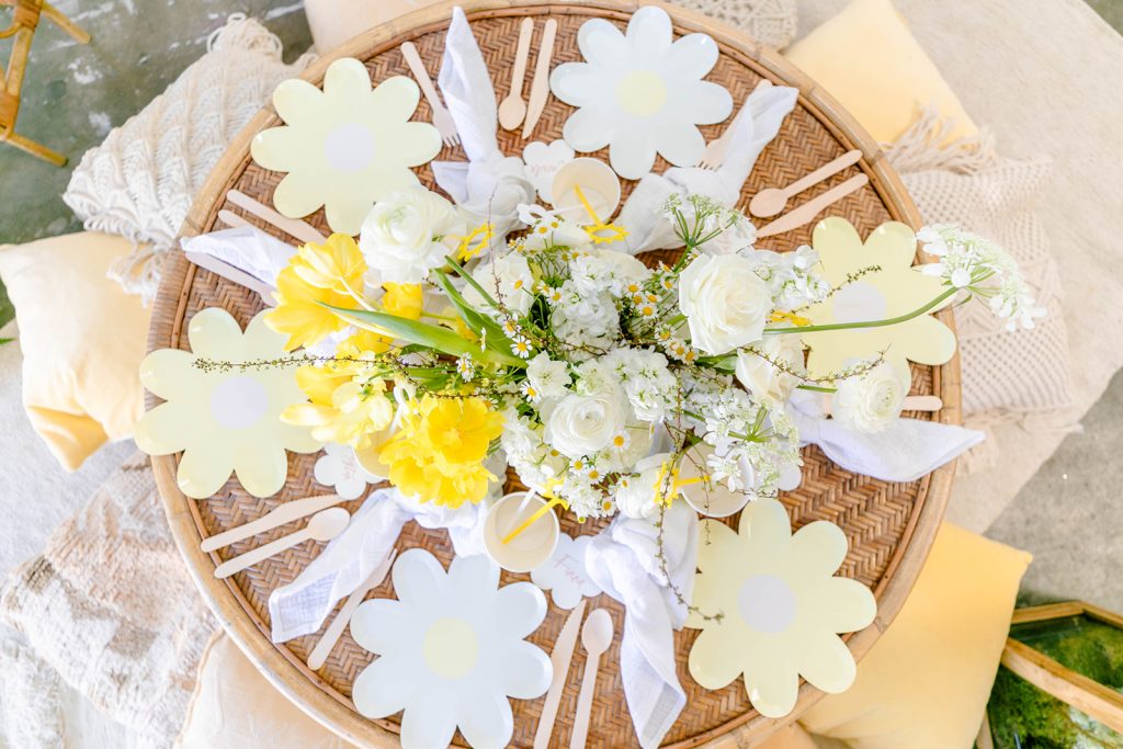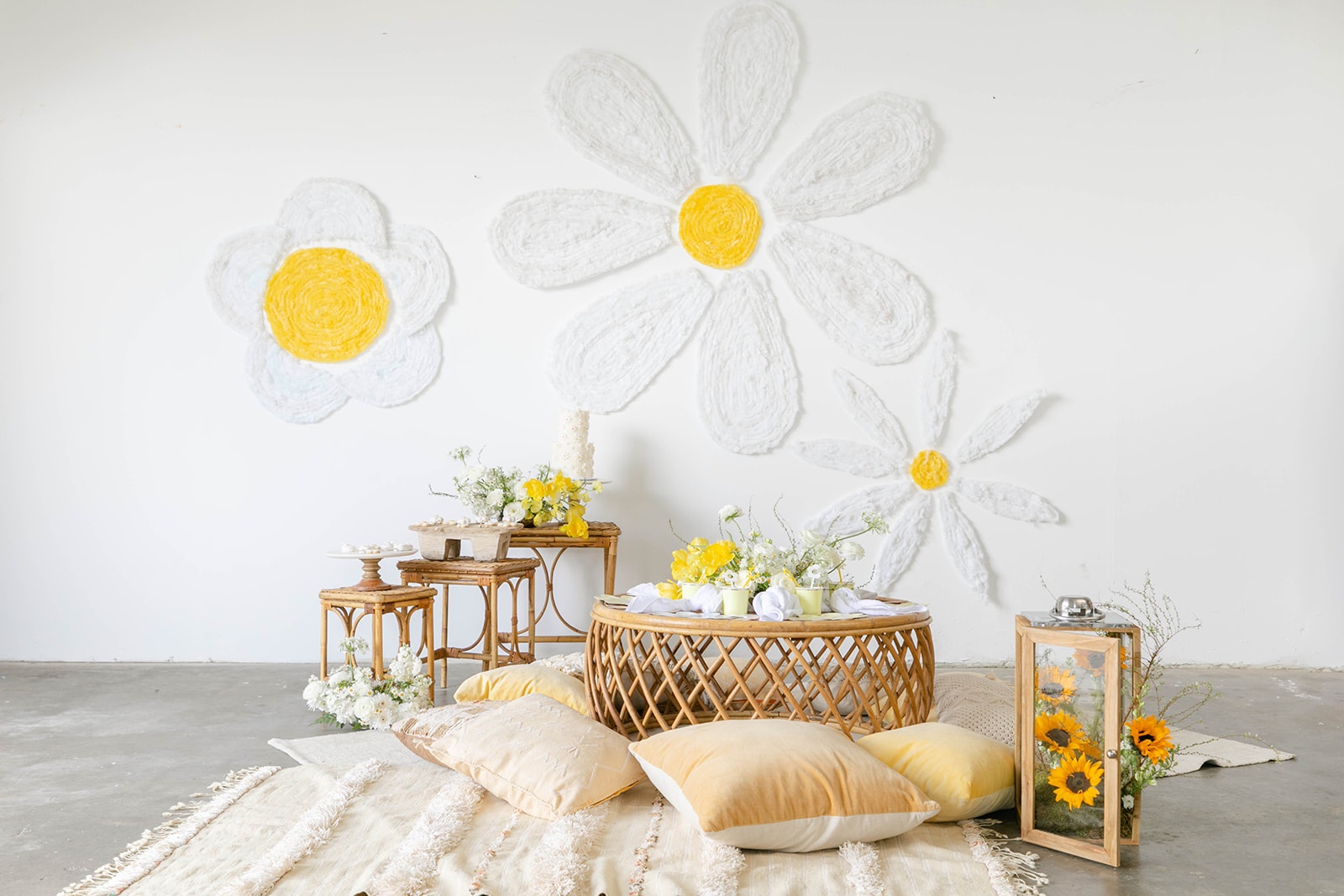 Нежный желтый, обилие белого и очаровательные ромашки — прекрасный выбор для весеннего дня рождения! И пусть погода может не радовать, можно привнести солнышка в декор праздника! Девочки получили ажурные пригласительные с вырезанными на бумаге ромашками! А на столе возле каждой тарелочки лежал белый цветочек из бумаги — это были рассадочные карточки. Конечно, самым крутым украшением были ромашки, будто бы связанные крючком. На самом деле их сделали из скрученных жгутиков бумаги тишью. День рождения оформили в стиле бохо — было много живых цветов и плетеной мебели. Вместо стульев вокруг белого столика разложили пледы и мягкие подушечки! Что может быть лучше чаепития без стульев? А вот и "ромашковые" угощения: эскимо и печенья, украшенные сахарными цветами. В таком же нежном стиле был и огромный двухъярусный торт, который поставили на нежную белую органзу и окружили охапкой садовых ромашек. Источник: beijosevents.com