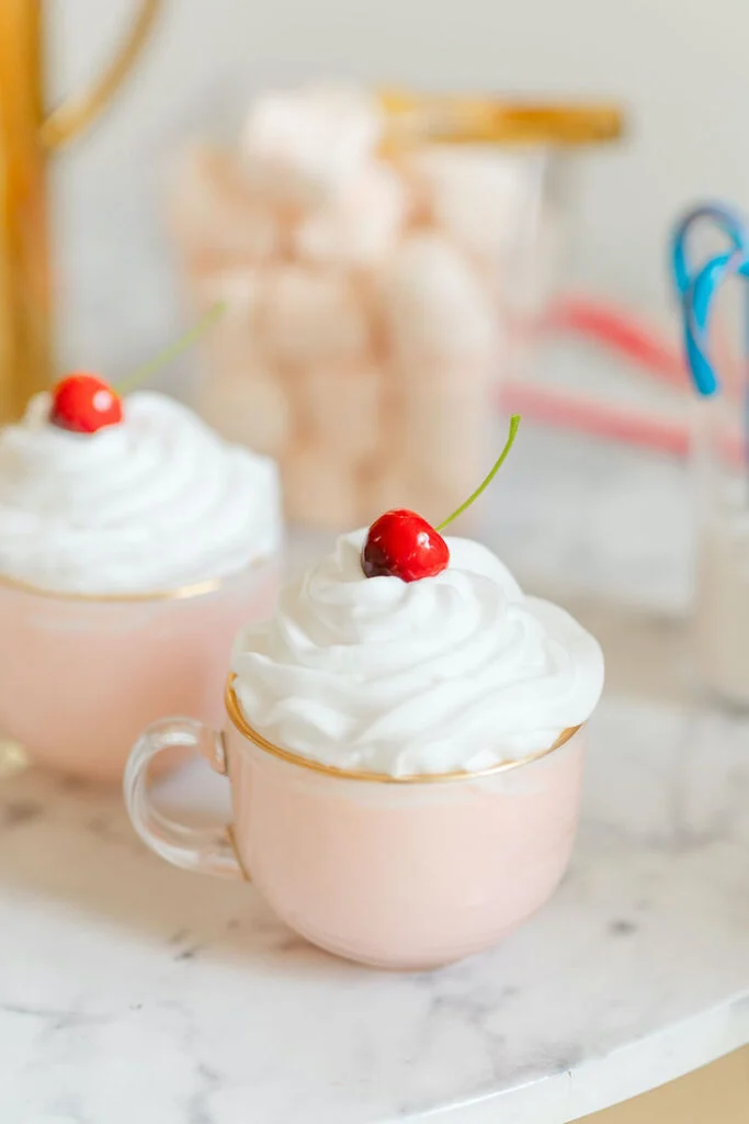 Ни одна праздничная вечеринка не обходится без теплых, уютных напитков, а какао в розовом цвете стал идеальным зимним лакомством! Гости потягивали напитки, наслаждаясь разнообразными закусками — изысканными десертами, которые выглядели слишком красиво, чтобы их есть.