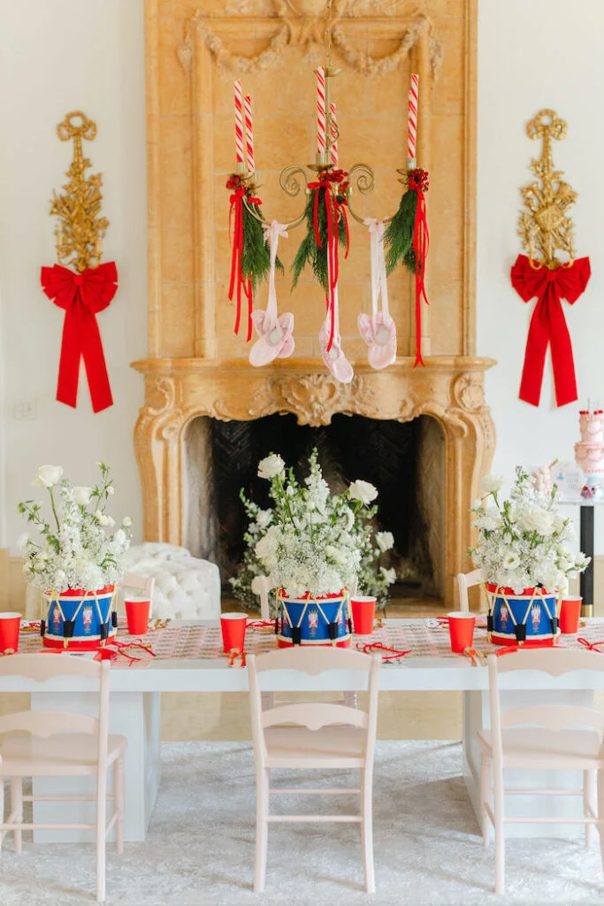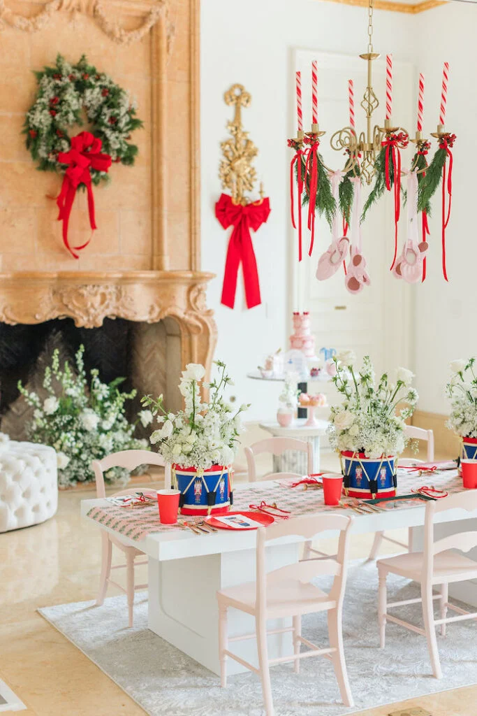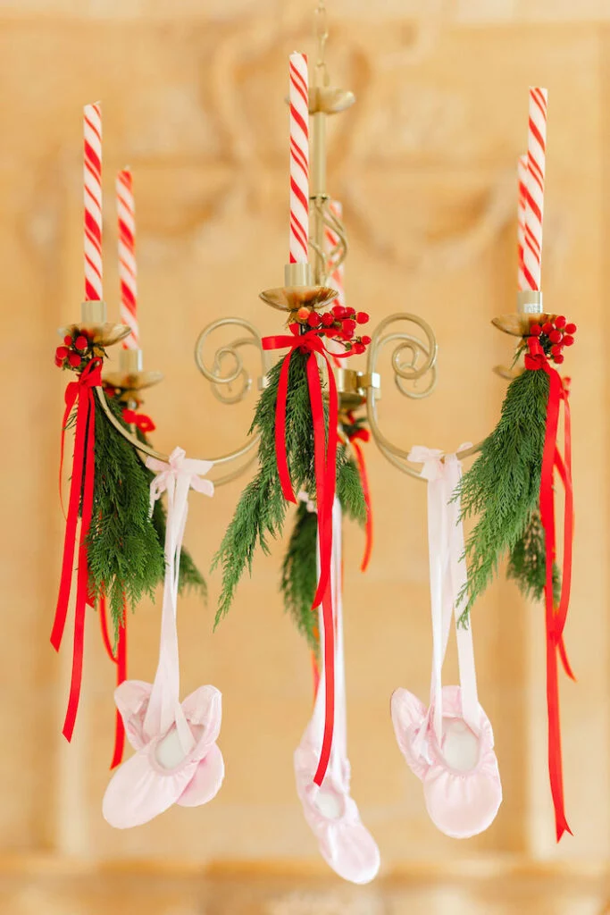 Над столом была необычная люстра! Её украсили свечами в виде леденцов, подвесили веточки пихты, красные банты и маленькие розовые балетки. Получилась композиция и в тематике сказки, и в рождественской!
