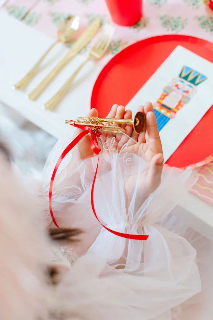 А на каждой тарелочке детей ждали необычные рассадочные карточки! Эти были крошечные тромбоны с акриловой табличкой.
