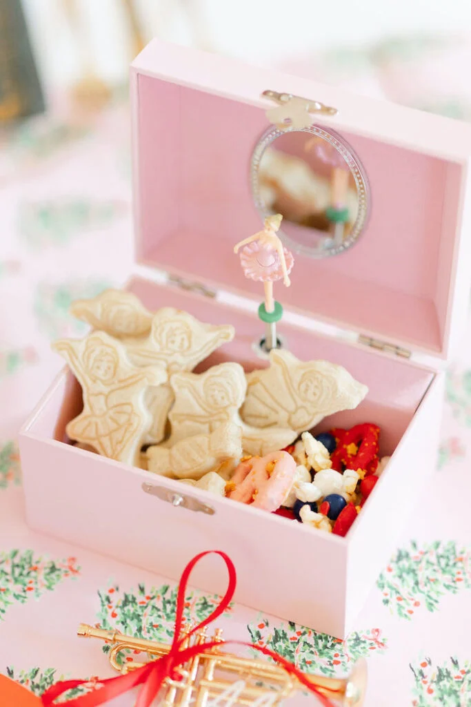 Десерты разложили не просто по тарелочкам, а внутри шкатулок с балеринами! Простое решение, но такое яркое.