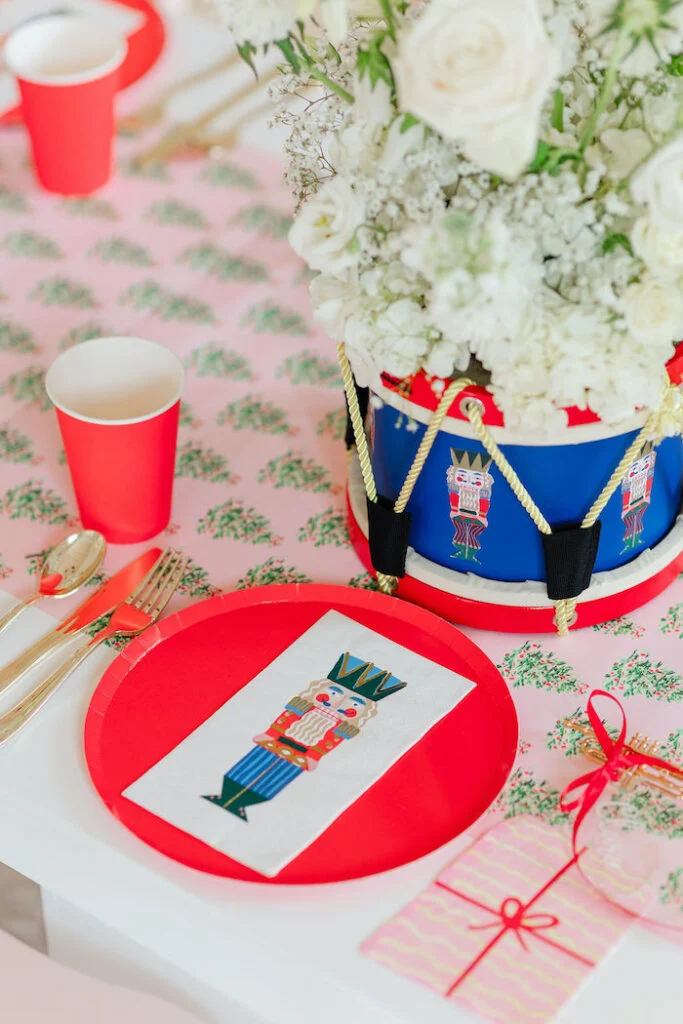 Столы украсили в стиле сказки, добавив барабаны солдатиков, в которые поставили букеты белых цветов!