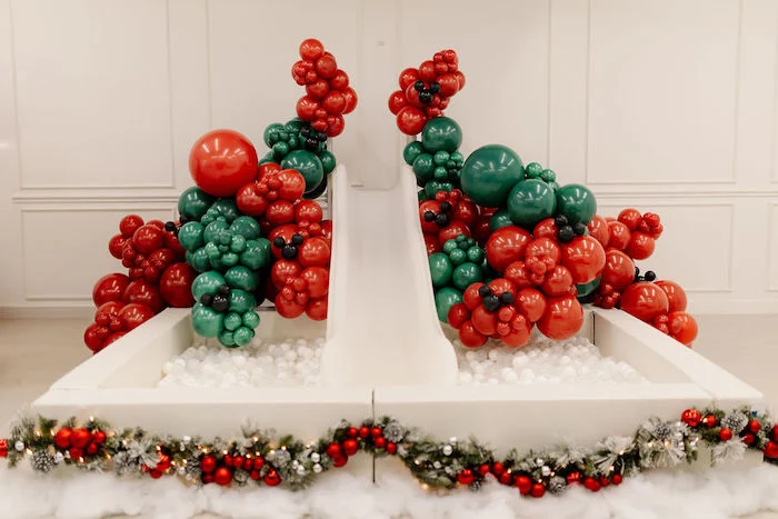 Конечно, центром притяжения малышей стал совсем не стол со сладостями, а горка и батут! Горку украсили сотнями шаров разного размера и гирляндой из еловых веток.