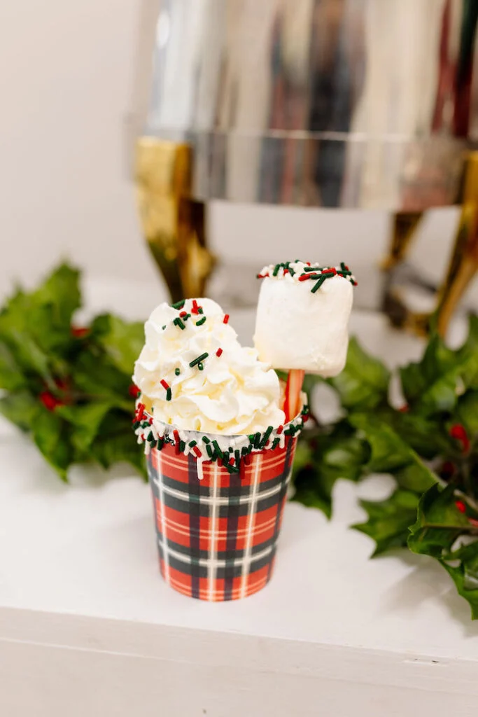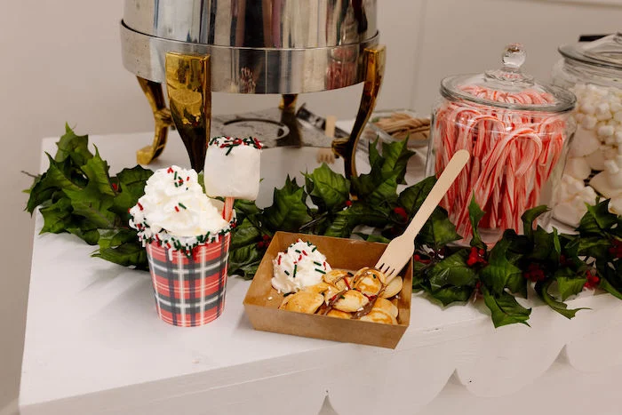 Давайте посмотрим, что ещё вкусного было на празднике! Во-первых, тут был какао-бар, где можно было сконструировать свой напиток. Гости добавляли к напитку маршмеллоу, взбитые сливки и даже леденцы-трости. Ну как тут не зарядиться праздничным настроением!