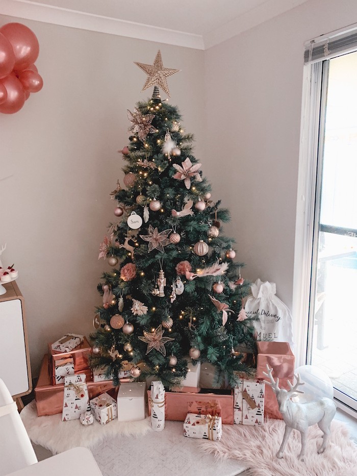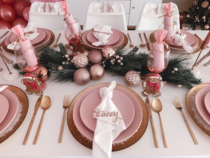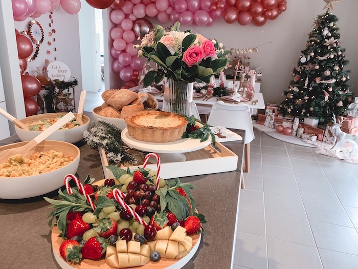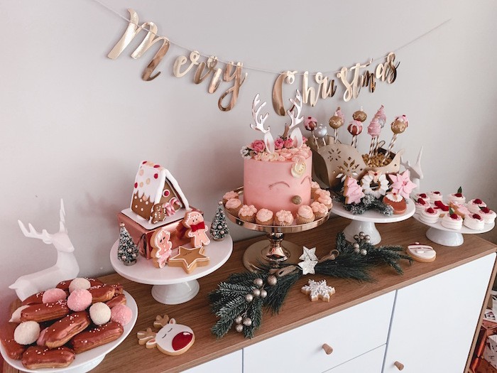 Эта очаровательная вечеринка, оформленная в элегантном стиле и с мерцающим декором, привела нас в восторг, и наверняка понравится и вам! Начиная от тортика-олененка и заканчивая роскошными гирляндами из воздушных шаров. Вдохновением для этого праздника послужила посуда в розовых и золотых тонах. Так часто и получается, декоратор видит красивую посуду и думает, какие детали добавить к ней, чтобы получить полноценное оформление. В этих же тонах приготовили и угощения: пирожные, печенье, макаронс и очаровательный торт с золотыми рожками. Посмотрите, как идеально перекликается между собой сладкий стол и обеденный — стопроцентное попадание в цвет. И такие же тона в украшениях елки! Как мы много раз говорили, подарочные коробки — тоже часть декора. А если ваши подарки еще не готовы к тому, чтобы лечь под елку, то поставьте пустые коробочки в красивой бумаге для украшения комнаты. Конечно, Новый год — это еще и имбирные пряники! Для этого праздника приготовили милый домик и двух его жителей. Часто для новогодней сервировки создают центральную композицию из еловых веточек, здесь использовали тот же прием, добавив к ним для красоты яркие шарики. А в каждый бокал вложили небольшие сувениры для гостей. Посадочные места отмечали с помощью акриловых имен, красиво лежащих на текстильных салфетках. Красивыми еловыми ветвями был украшен и винтажный столик с напитками. Наверху стояли бокалы с шампанским, а внизу огромная емкость для содовой со льдом и лаймом. Также гостей угощали вином, украшенным малиной и долькой лайма, в красивых бокалах из розового стекла. Конечно, одними розовыми сладостями сыт не будешь, поэтому на отдельном столе были тарелки с фруктами, салаты и пироги. Источник: karaspartyideas.com