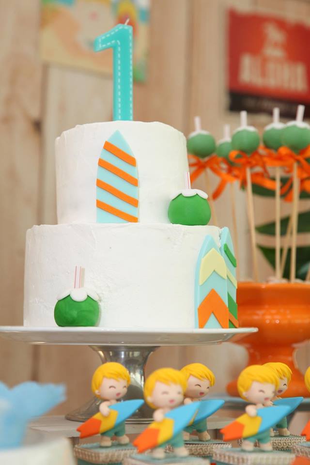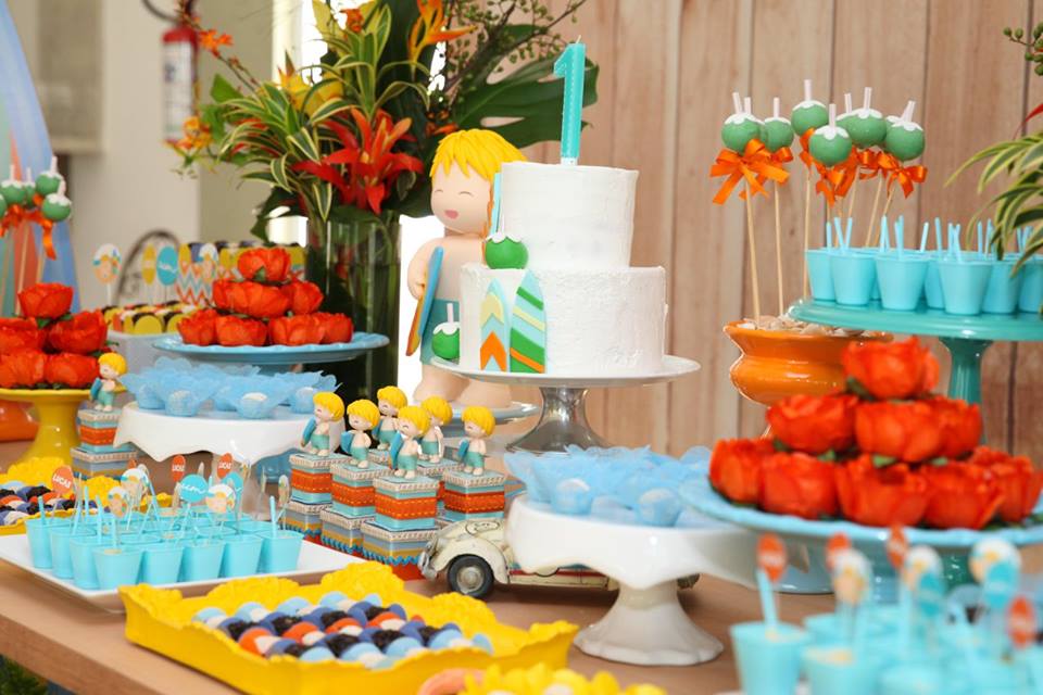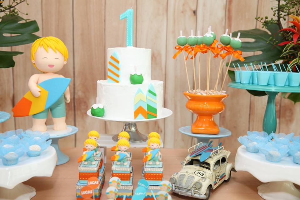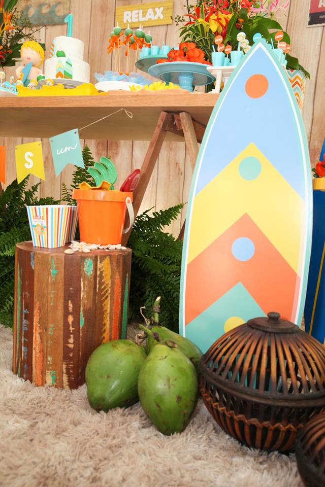 Яркая вечеринка в стиле серфинга скрасит вам не только лето, но и поднимет настроение в холодное время года! Так что если соскучитесь по теплым денькам, устройте себе маленькое лето дома. Праздник хоть и был в пастельных тонах, но вышел очень ярким! Это и разноцветная мебель, и закуски, и декоративные серфинг-доски. На столе было целых два тортика, один обычный из двух ярусов, а другой был сделан в форма малыша-серфера! Фигурками украсили и пирожные — настоящее произведение искусства! Несмотря на то, что малышу-имениннику исполнялся всего один годик, родители очень ответственно подошли к оформлению — ведь даже в таком возрасте дети уже все понимают, радуются красоте, которую для них создают. Чтобы создать атмосферу пляжа, за сладким столом установили стену из досочек и украсили ее табличками и плакатами. Вокруг стола разложили зеленые кокосы, расставили папоротник и тропические букеты. Источник: blogencontrandoideias.com