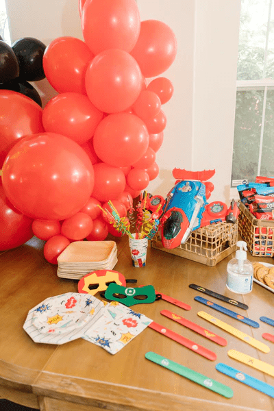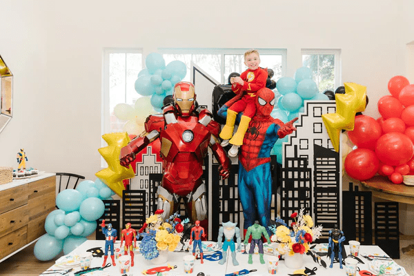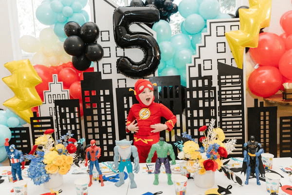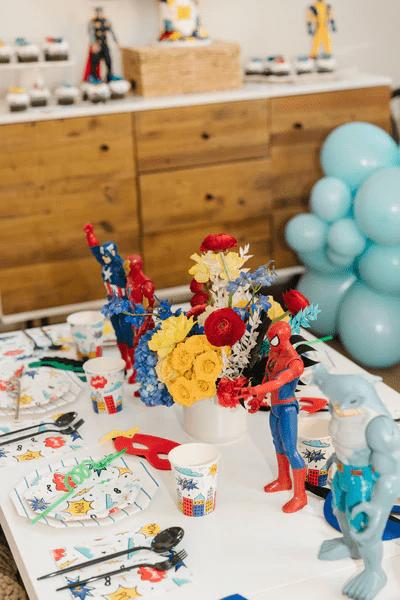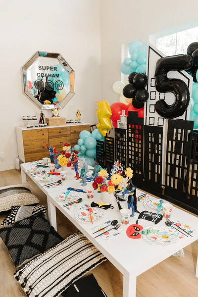 Мальчики и девочки обожают супергероев — ведь у них классные яркие костюмы, невероятные силы и они всех спасают! Мы принесли для вас крутую идею, как устроить тематический день рождения у вас дома. Все, что нужно, это коллекция посуды и декора, множество шаров и фон, который можно либо сделать самим, либо заказать у нас. Для пятилетия именинника стол украсили самым классным декором — фигурками супергероев, которых он любит. Между ними расставили букетики цветов в гамме праздника. Стол украсила посуда с тематическими принтами, ссылки на супергеройскую коллекцию мы оставим ниже. Как видите, родители просто сдвинули два столика и разложили подушки вместо стульев! Расставили посуду, украшения и маски — и все готово. Фон можно сделать из плотного картона, а шары подобрать в цвет посуды. Кстати, у нас уже есть готовый дизайн геройской гирлянды. К празднику можно добавить яркие трубочки и свечи! Чтобы поверхность стола стала повеселее, вы можете также посыпать ее конфетти. На отдельном столике лежали подарки: магнитные браслеты, снеки и другие мелочи. Все, что вы подберете, можно сложить в тематические пакетики — гости оценят! Тортики с бахромой и завитками из крема стали очень популярны в последние годы. Так что можно не изобретать фигурки и другие украшения, а просто украсить торт кремом в цветах вечеринки. И не забудьте позвать на праздник любимых героев! Внизу мы оставим и ссылки на костюмы для детей. Источник: ellieandpiper.com