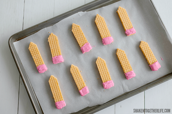 Мы обожаем максимально простые рецепты, которые можно воплотить в жизнь не более, чем за час! Вот один из них — милое угощение для вечеринки на 1 сентября. А ещё можно давать такие ребёнку в школу :) Это лакомство делается без выпечки — вот ещё один повод опробовать рецепт. Для работы вам понадобится противень, застеленный пергаментом — на нём проще украшать карандаши и там же оставить их застывать. А для приготовления вам понадобится кондитерский шоколад в плитках (белый и розовый), вафли и шоколадные капли для грифеля. Если вам не удастся найти шоколадные монетки, то можно использовать помадку или марципан. Нанесите небольшое количество шоколада или глазури, чтобы он не стекал по краям. Сразу добавьте шоколадную капельку-грифель! Так он застынет вместе с глазурью. Смело накрывайте на стол или складывайте вафельки ребёнку в ланч-бокс, чтобы он похвастался в школе своей мамой-мастерицей :) Источник: shakentogetherlife.com