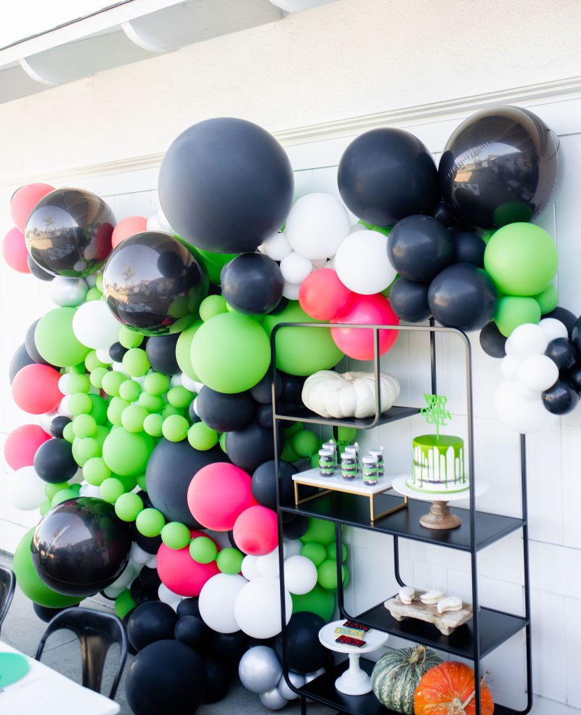Зону с десертами оформили очен пышно, добавив огромную гирлянду из шаров! Кто бы мог подумать, но все эти цвета идеально сочетались друг с другом.