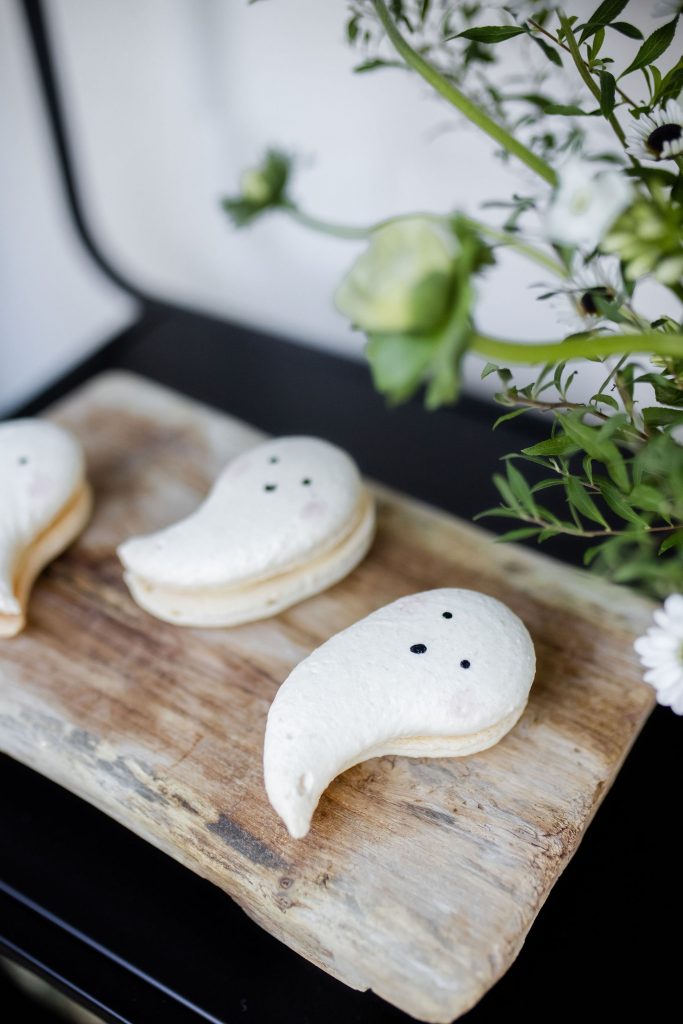 Десерты были простыми, но все в цветах праздника, но макаронс спекли в форме призраков, вышло очень мило!