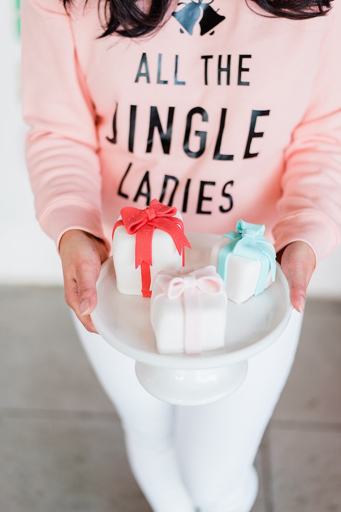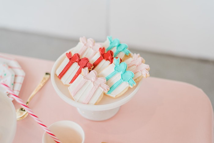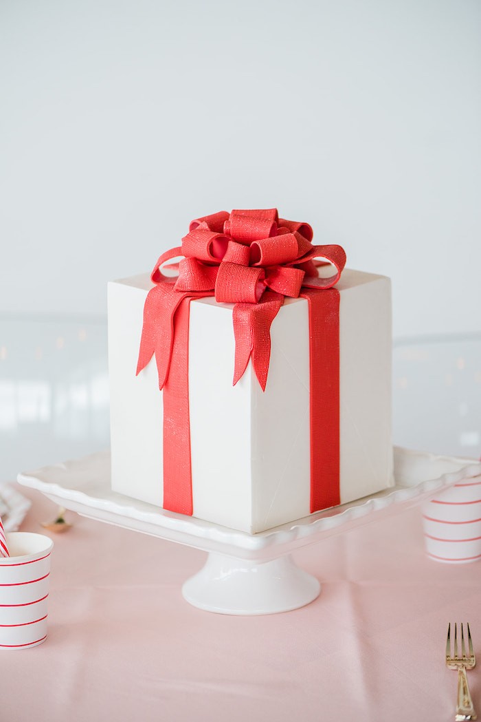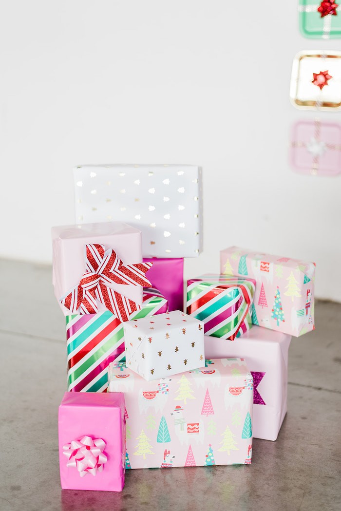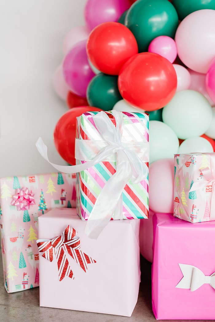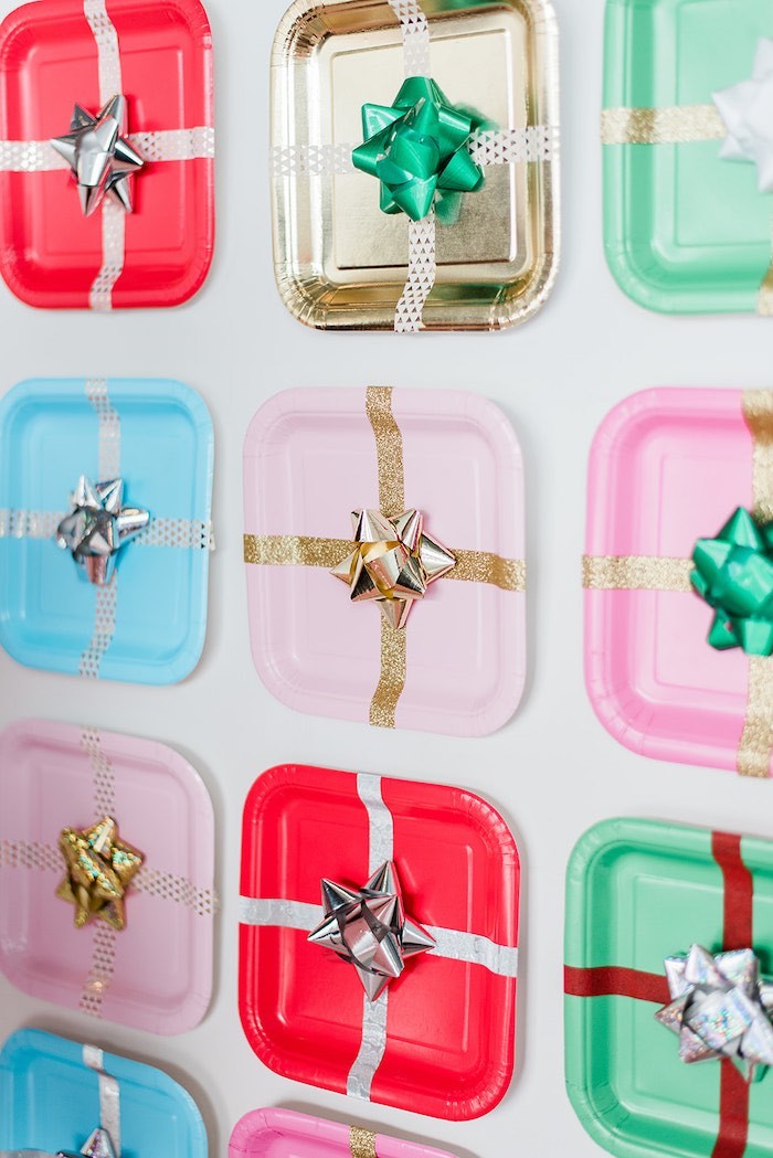 Если вы ищете праздничное, милое и веселое оформление для Нового года, то вот оно! Украшенная бантами и стильно оформленная, эта веселая и яркая рождественская праздничная вечеринка порадует и детей, и взрослых. Фотозону украсила волшебная елка из воздушных шаров! Если у вас нет любопытной кошки, то это интересный вариант для украшения квартиры. А вот на стене сделали необычное панно из тарелочек. Их декорировали дизайнерским скотчем и бантиками для подарков, чтобы сымитировать подарочные коробки. Чтобы продолжить тематику декора, в качестве угощений приготовили пирожные в виде подарочных коробочек. Если вы еще не готовы расставить под елочкой подарки, то можно сделать декоративные коробочки в красивой бумаге. В сервировке использовались простую посуду с геометрическими узорами и полосками. Но если вам хочется чего-то новогоднего, то у нас есть посуда с Сантой, оленями и другими символами праздника. Кстати, тортик тоже сделали в виде подарка, внутри бисквит и сладкий крем! А мастика чудесно имитирует тканевую ленточку. Среди других угощений были нежно-бежевые макаронс и печеньки-подарки. При всей минималистичности оформления стола, его с лихвой компенсировала яркость фотозоны! Источник: karaspartyideas.com