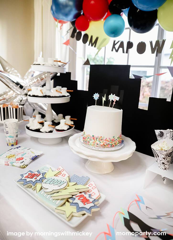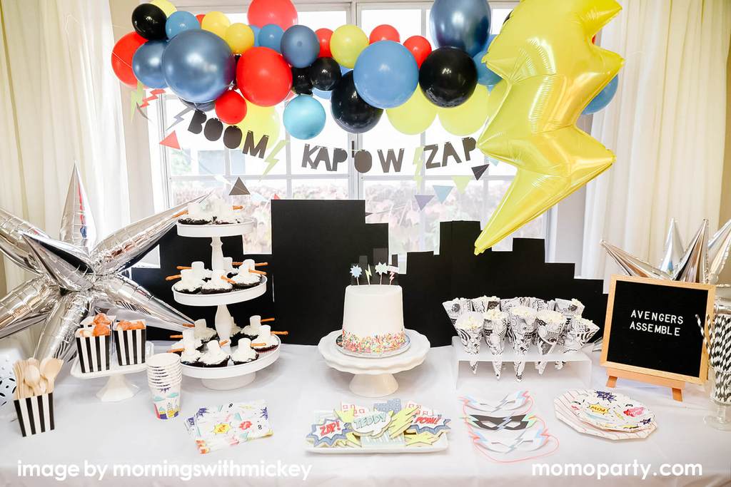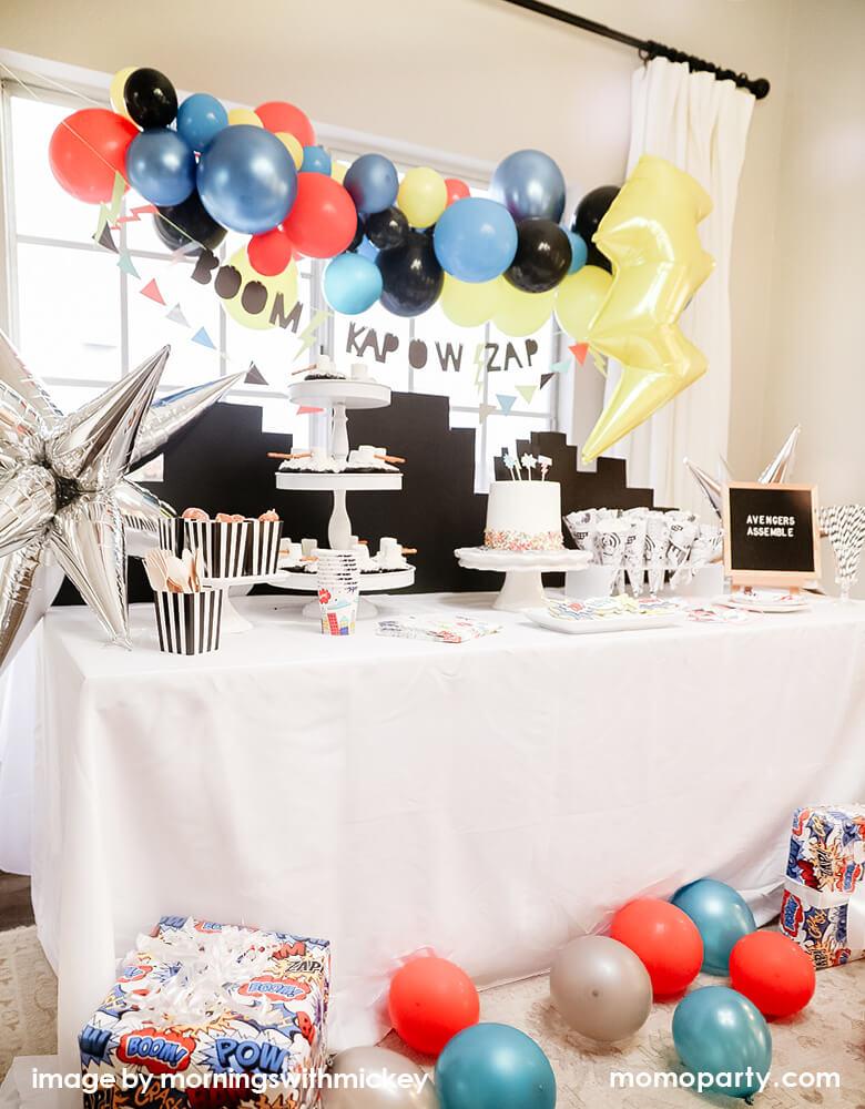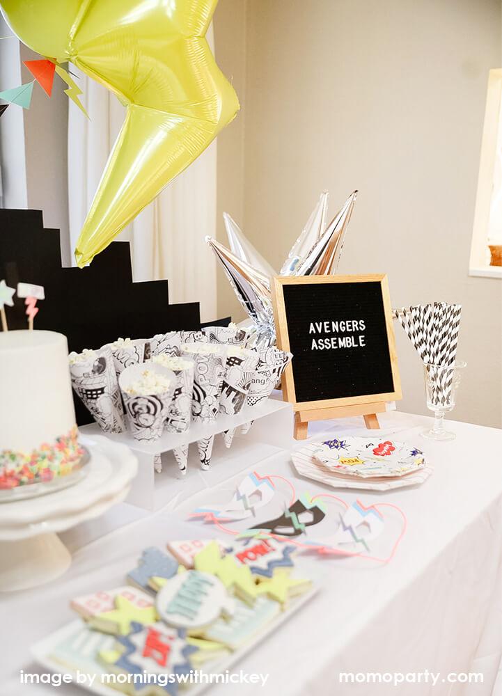 Супергеройские вечеринки очень популярны среди мальчиков! Особенно они фанатеют от Мстителей, как и наш сегодняшний именинник. Мама мальчика смогла соединить вместе винтажную атмосферу и супергеройские мотивы в своем оформлении. Нам очень понравилось простое, но стильное оформление сладкого стола! Черный силуэт ночного города послужил отличным фоном для белых угощений. В декоре использовалась посуда и украшения Meri Meri, поэтому шары подбирали в тон коллекции: красные, голубые, желтые, черные. И, конечно, множество серебрянных акцентов! Покорил своей простотой и тортик — белая глазурь, яркая посыпка, свечи в цветах праздника и топперы из коллекции. Идеально! Печенье на вечеринках — как отдельный вид искусства! Чтобы оно подошло к вечеринке, просто покажите кондитерам принты на посуде. Конечно, главная радость для малышей, это не сладости и красивые гирлянды, а присутствие любимых героев на таком важном празднике! Аниматоры — важная часть любого дня рождения, как и тематический костюм для самого именинника. Источник: momoparty.com