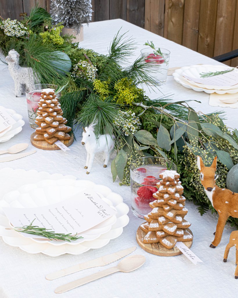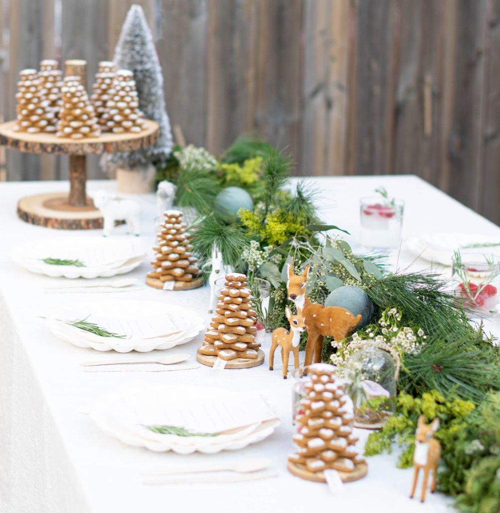 В наших реалиях Новый год на улице — это за гранью фантастики :) Но мы очень любим американские вечеринки на улице, к тому же, все это оформление легко повторить и дома. Чтобы создать атмосферу волшебного зимнего леса — используйте в оформлении много зелени, дерева и красных ягодных оттенков. В оформлении использовалась коллекция Эко от Meri Meri: нежные тарелочки молочного цвета, такие же салфетки и деревянные бесцветные столовые приборы. Прекрасная простота! Особенность коллекции в том, что она производится экологически рационально, с использованием натуральных материалов и окрашивается натуральными красителями. Декораторы начали с чистого листа — а именно, с белой льняной скатерти. В центре стола разложили ветки зимней зелени (сосна, кедр, эвкалипт, розмарин и можжевельник). Среди них разложили украшения — зеленые шарики и грибочки под стеклянными колпаками. Вы можете использовать для декора елочные шары и игрушки, например, в форме грибочков. Среди зелени спрятались и обитатели леса — оленята с мамой, ягненок и волшебные единорог. А возле каждого посадочного места стояли подарки для гостей — елочка из имбирных пряников на деревянной подставке. Тарелочки были оформлены просто: веточка розмарина и красивое меню с праздничными блюдами. Эти морозные коктейли — простая содовая с малиной, вмороженной в кубики льда и с веточками розмарина для красоты и лесного аромата! В меню поиграли с названиями и оформлением блюд: например, безе сделали в форме грибочков, а хрустящие снеки назвали «Беличьи орехи и закуски» были даже лесные френдвичи и «овощи, собранные в лесу». Источник: partyetcie.com
