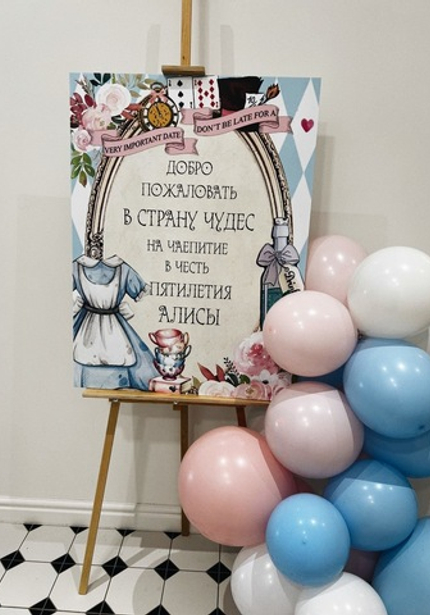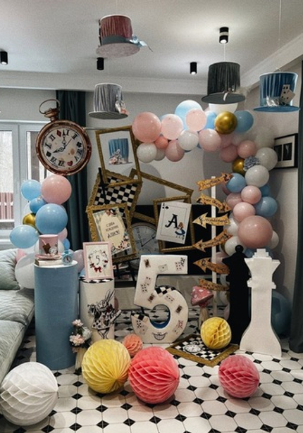 Невероятный загородный праздник — первый тематический в жизни нашей именинницы! Мы устроили для неё волшебную Страну чудес, с артистами анимации, огромной фотозоной и необычной сервировкой стола. Нам очень повезло с интерьером дома, он идеально подходил под эту тематику, а мама именинницы часто читала ей «Алису в Стране чудес».
