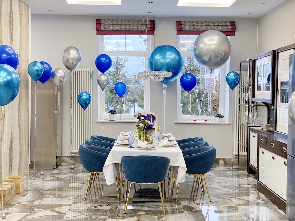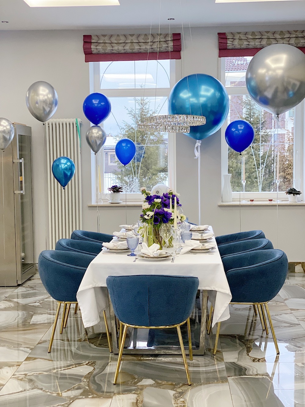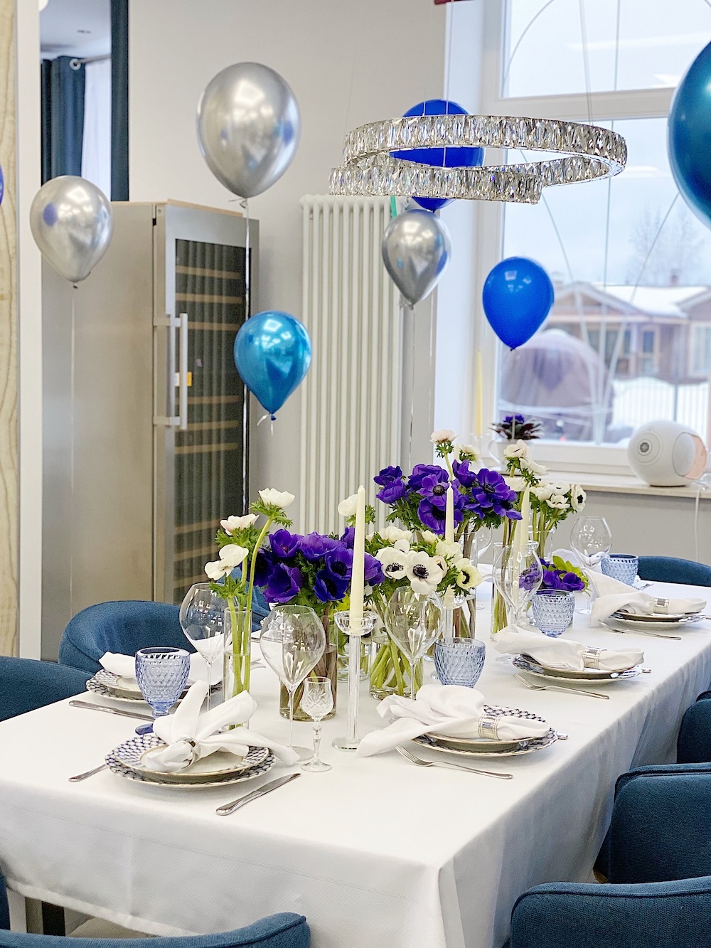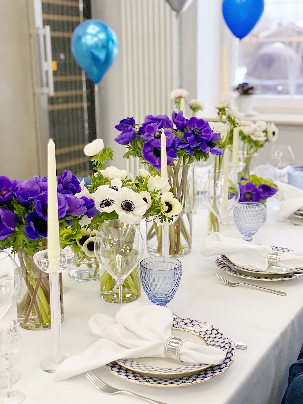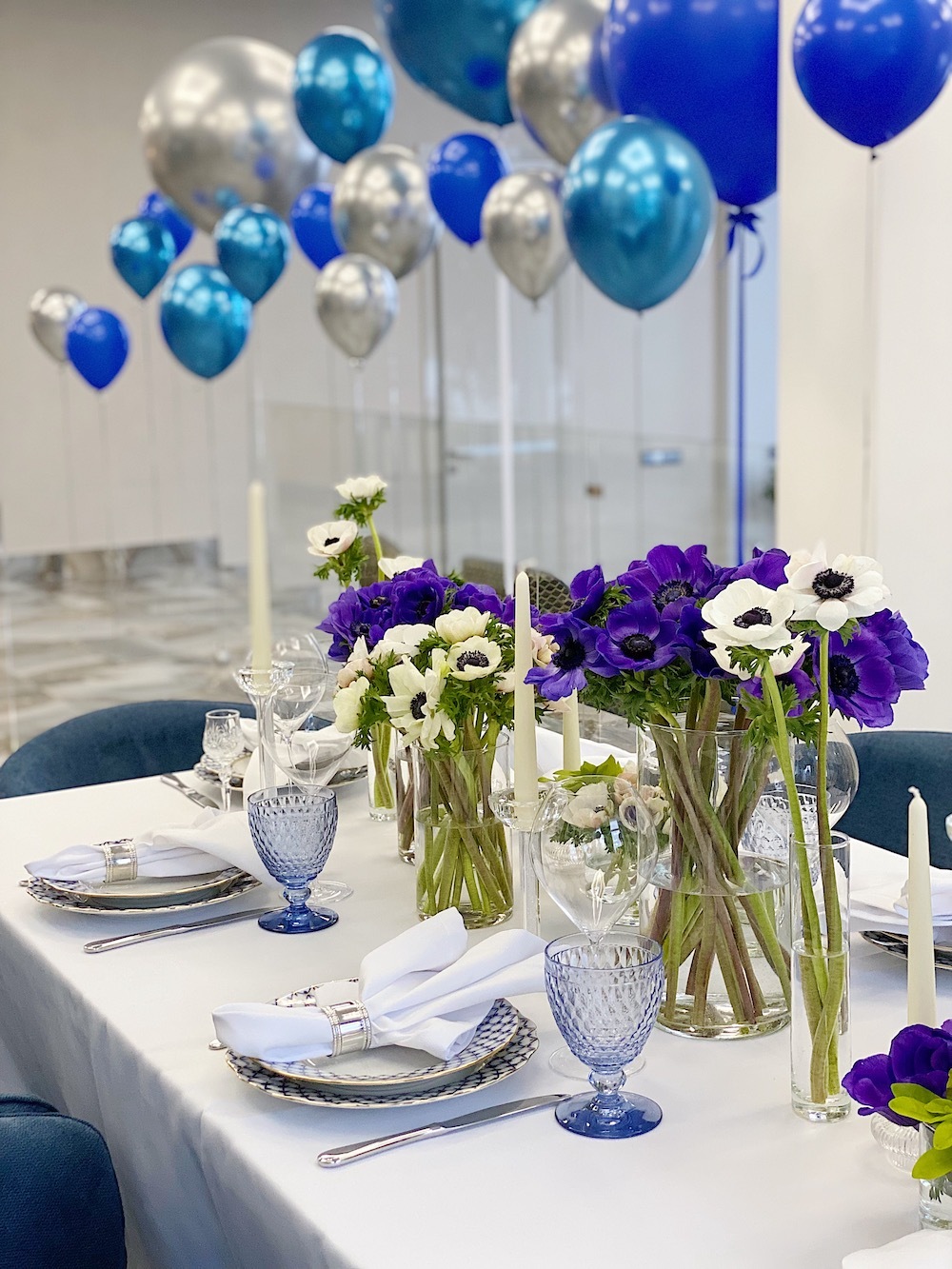 Тематикой праздника может стать что угодно! Даже любимые цветы — смотрите, как мы оформили пространство, отталкиваясь от анемонов: бело-голубая посуда, белоснежная скатерть и немного воздушных шаров. Стильный и очень сдержанный взрослый праздник, который порадует ваш взгляд, а аромат цветов станет завершающим штрихом!