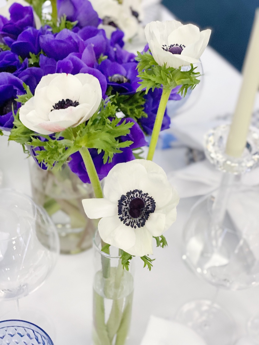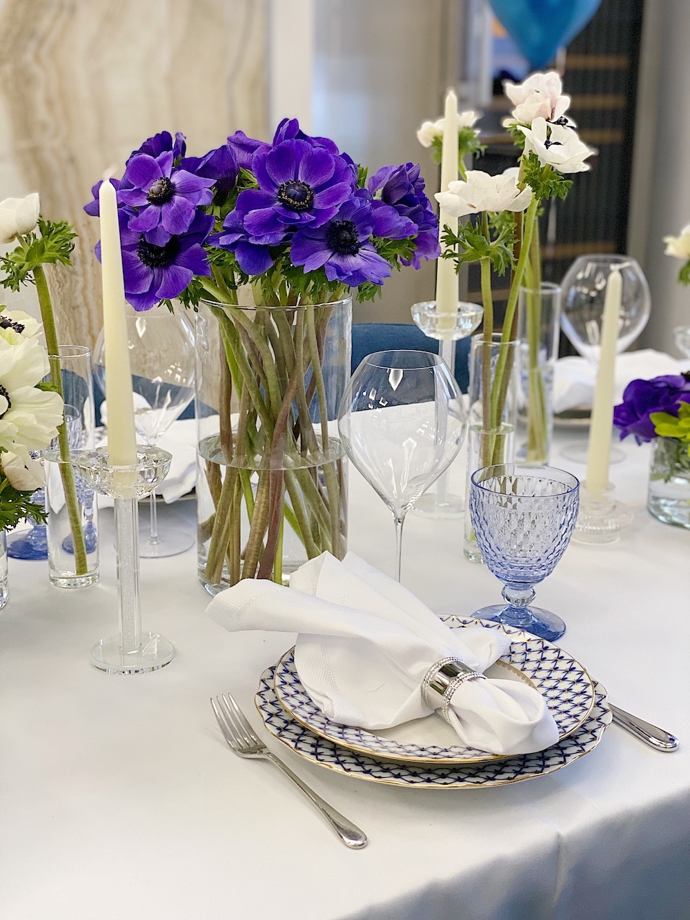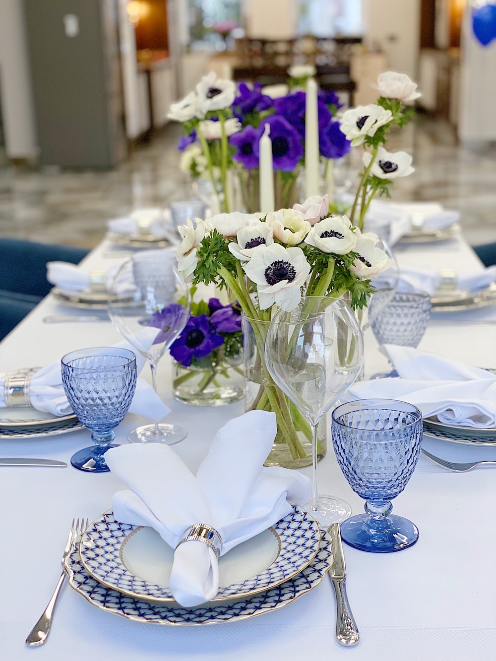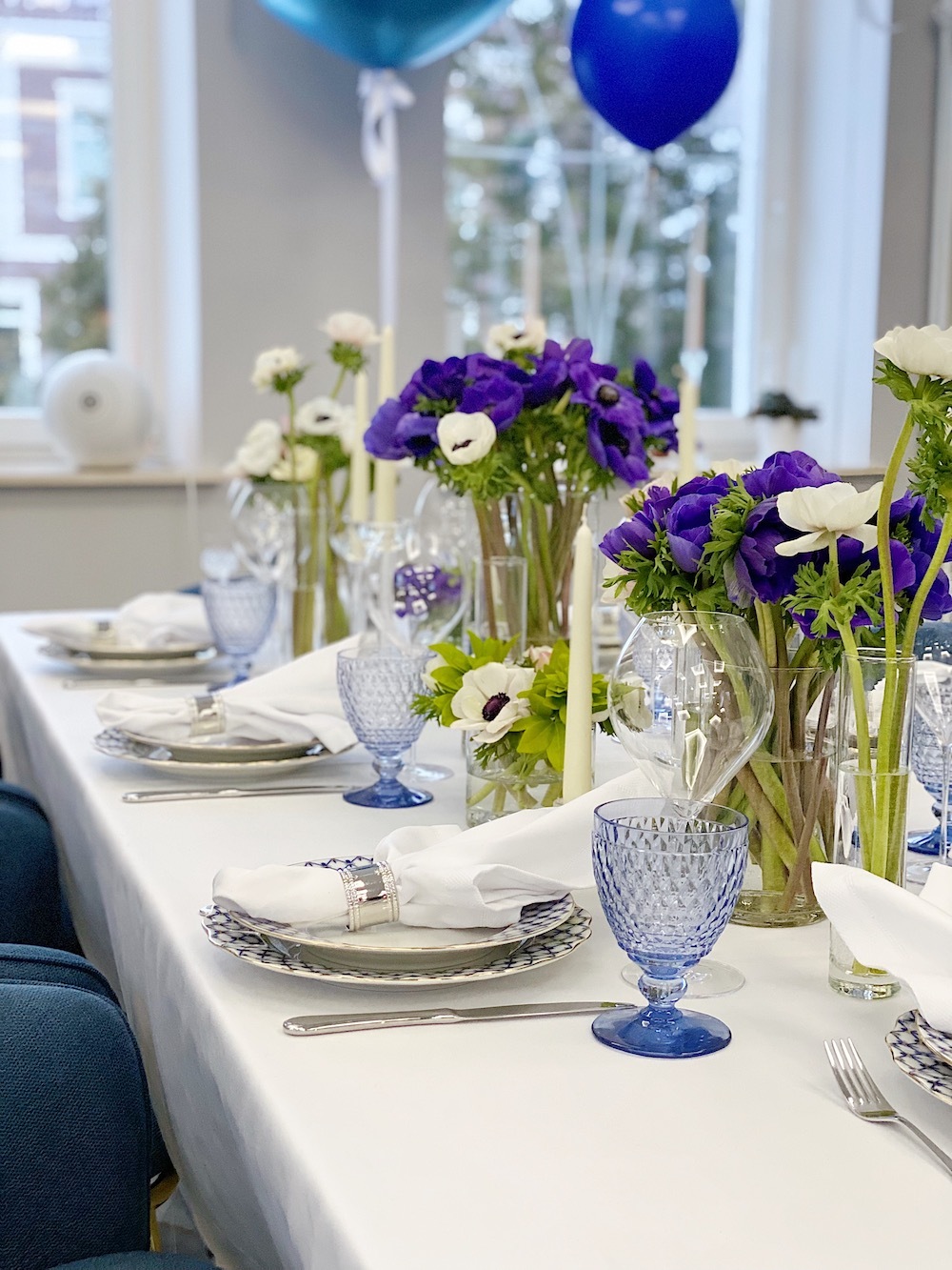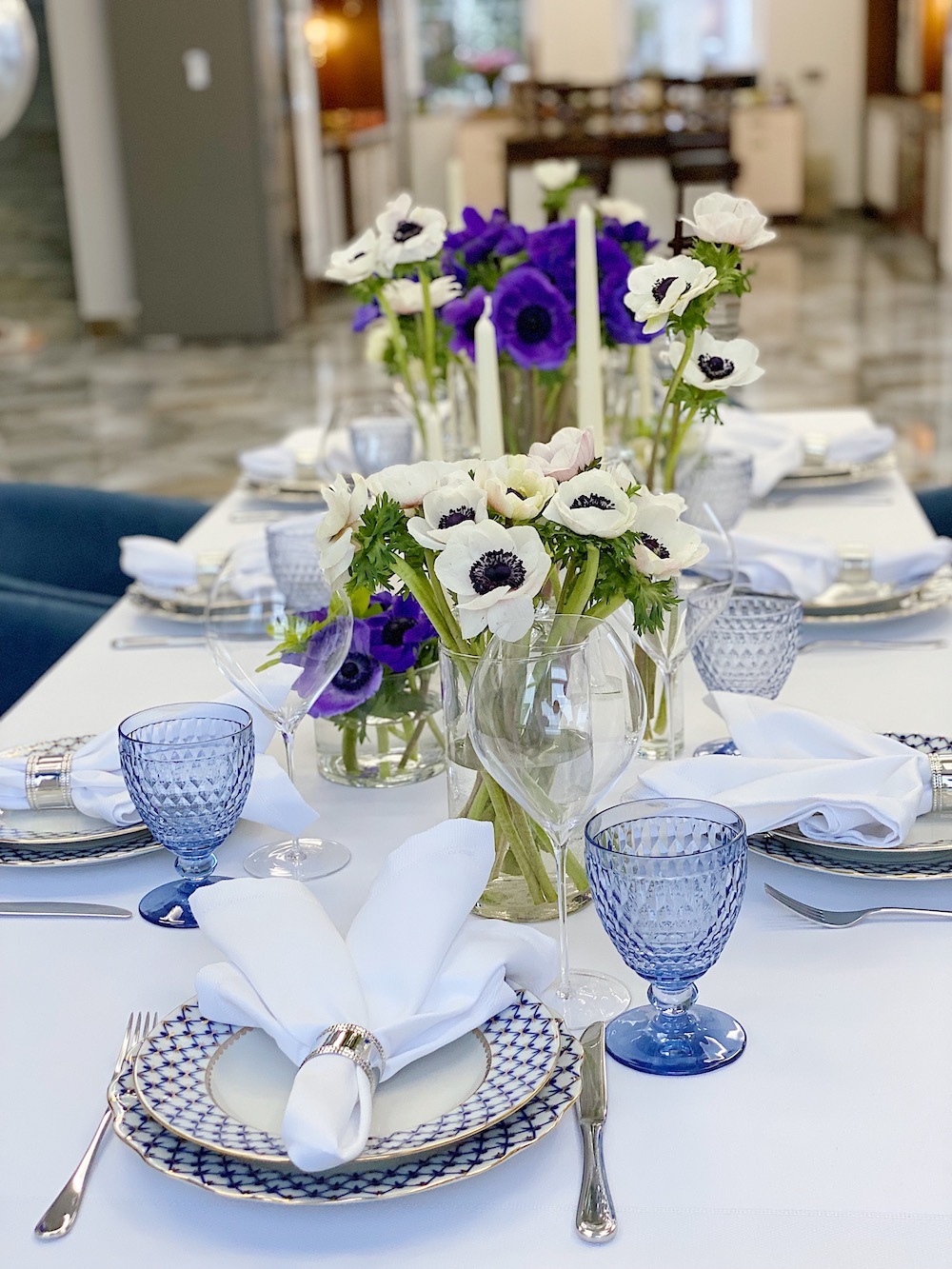 Тематикой праздника может стать что угодно! Даже любимые цветы — смотрите, как мы оформили пространство, отталкиваясь от анемонов: бело-голубая посуда, белоснежная скатерть и немного воздушных шаров. Стильный и очень сдержанный взрослый праздник, который порадует ваш взгляд, а аромат цветов станет завершающим штрихом!