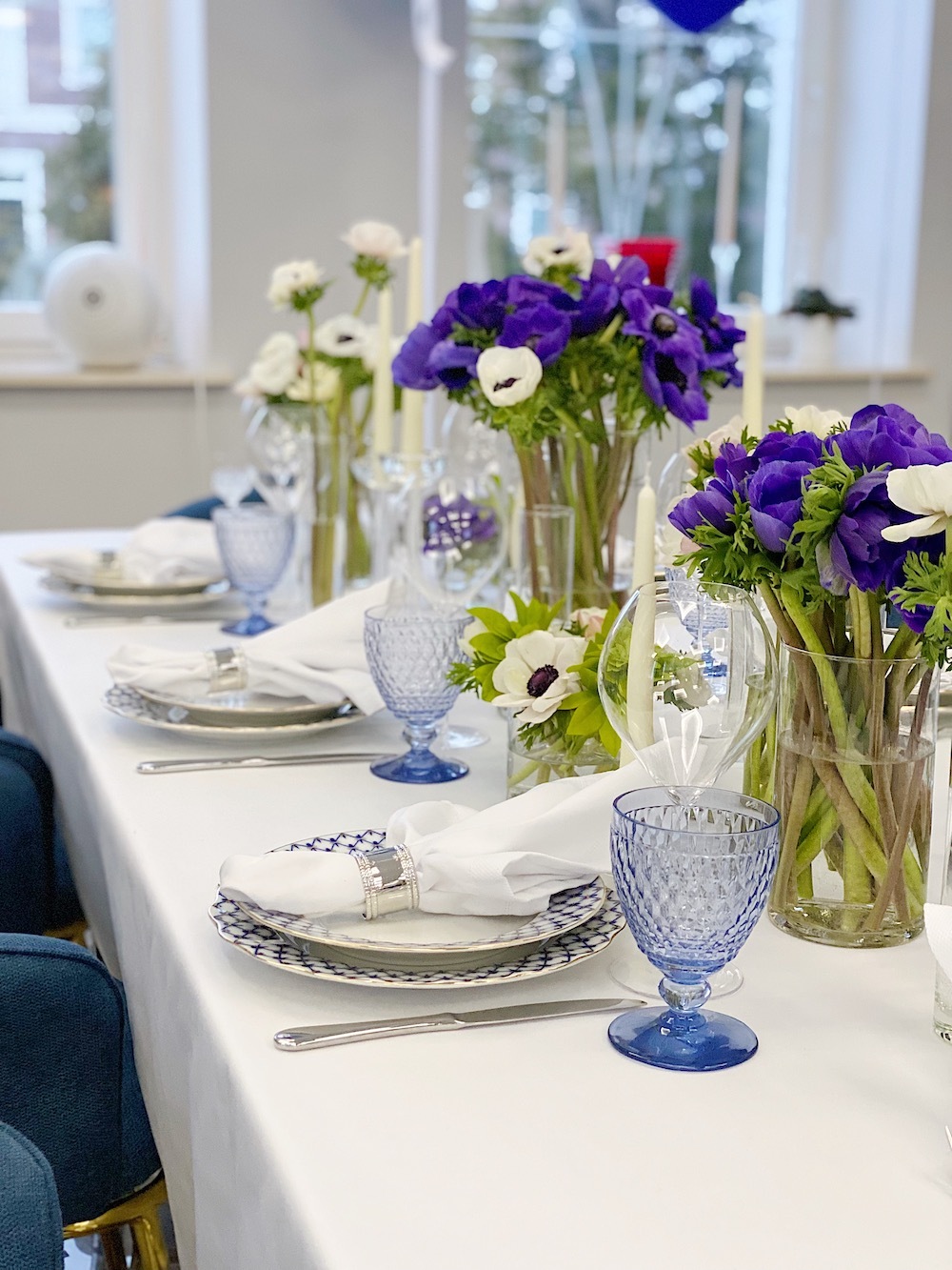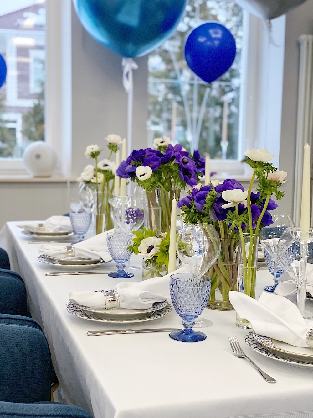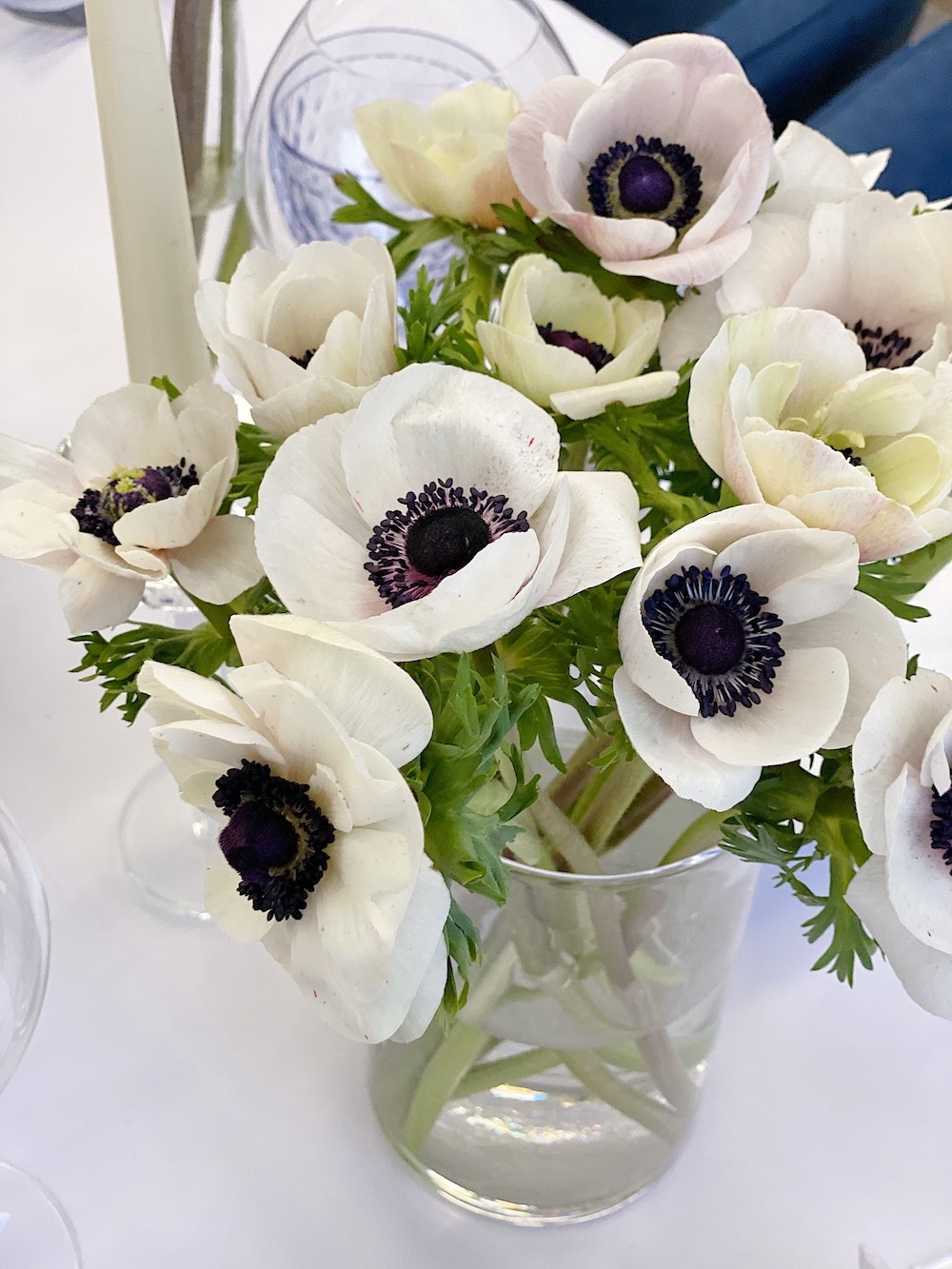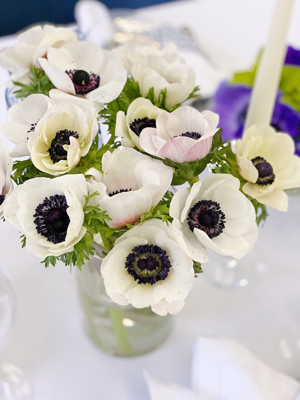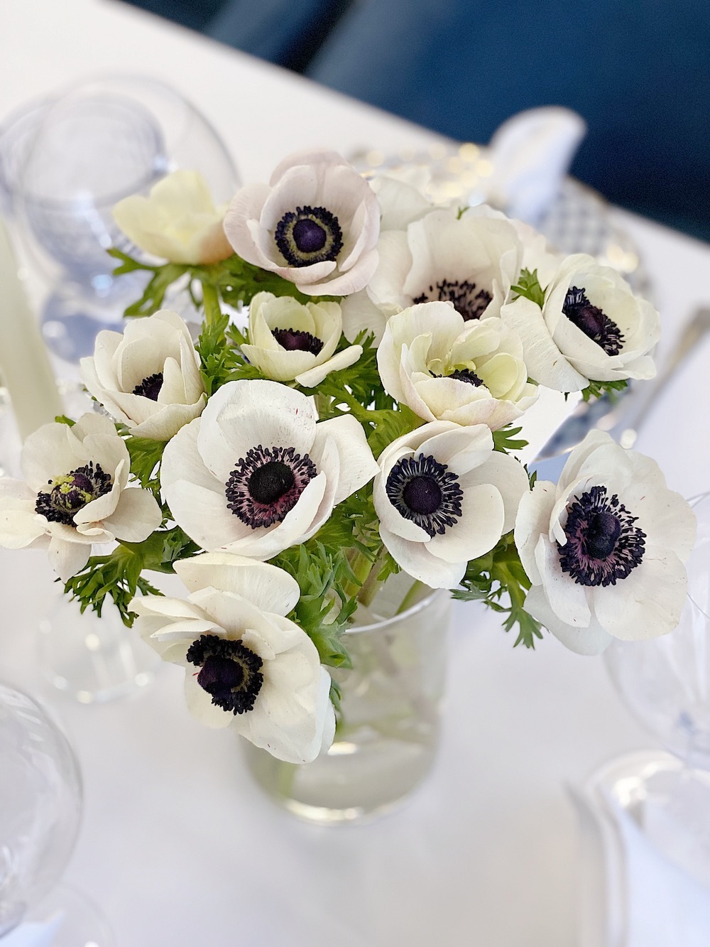 Тематикой праздника может стать что угодно! Даже любимые цветы — смотрите, как мы оформили пространство, отталкиваясь от анемонов: бело-голубая посуда, белоснежная скатерть и немного воздушных шаров. Стильный и очень сдержанный взрослый праздник, который порадует ваш взгляд, а аромат цветов станет завершающим штрихом!