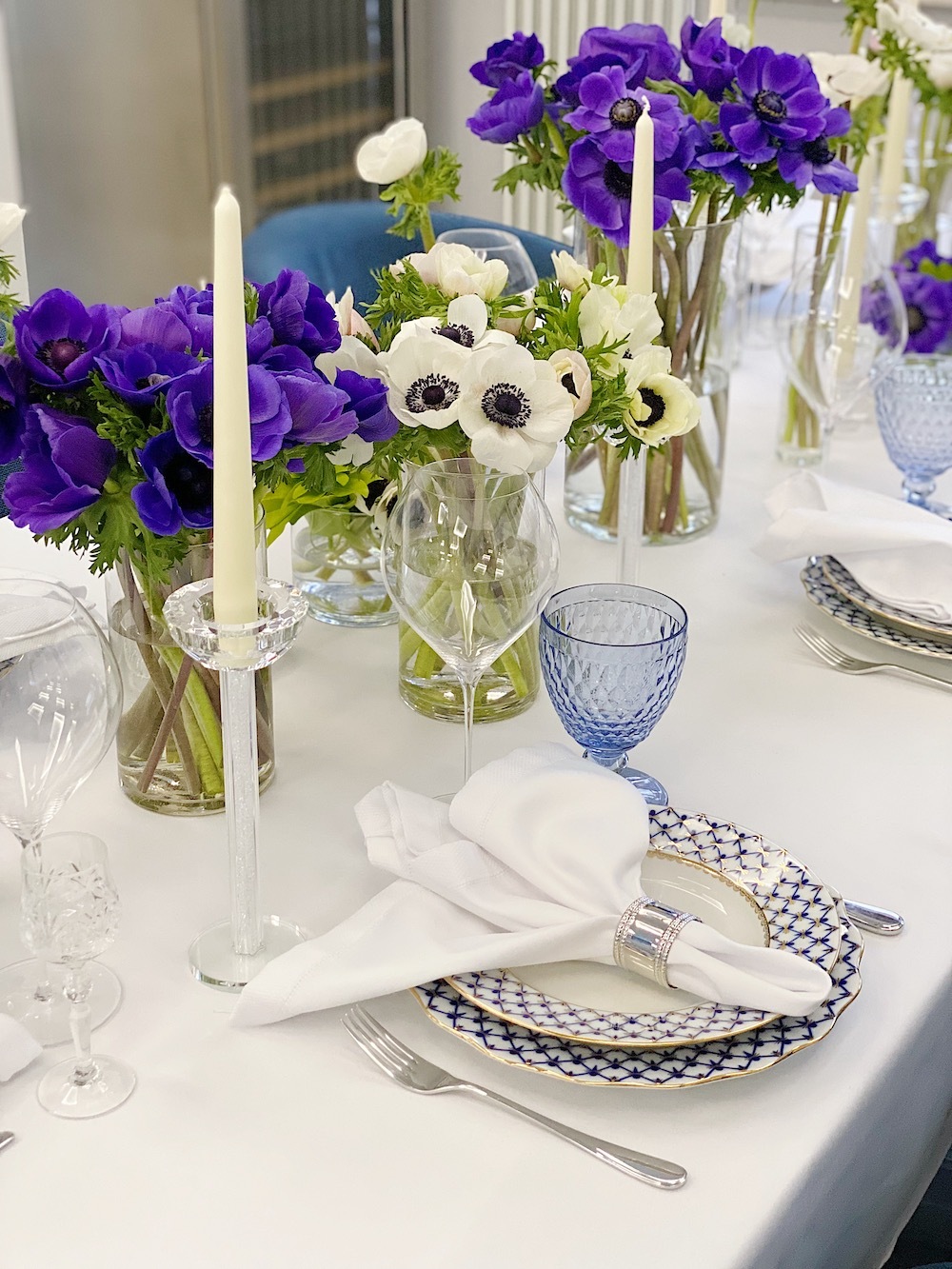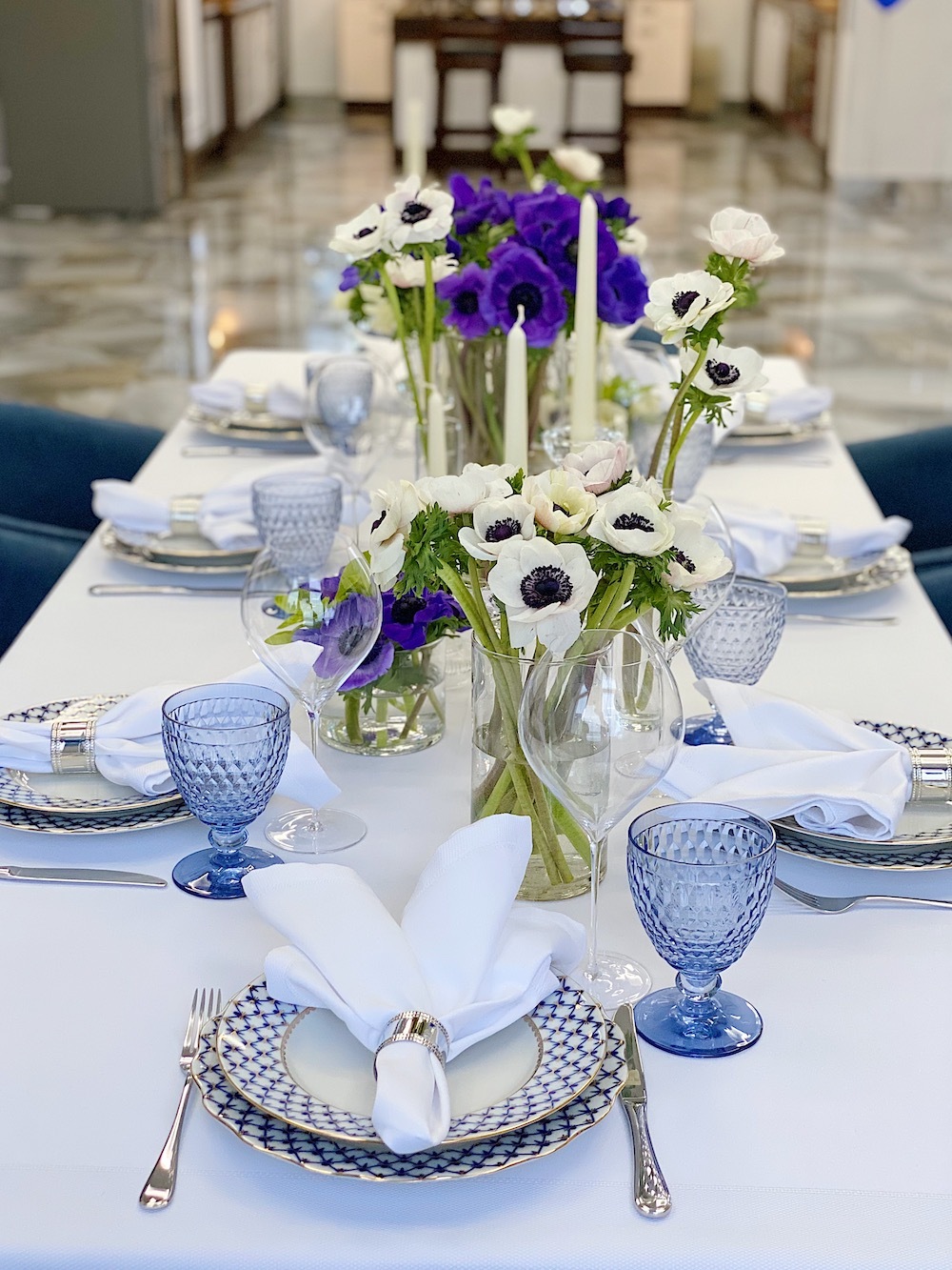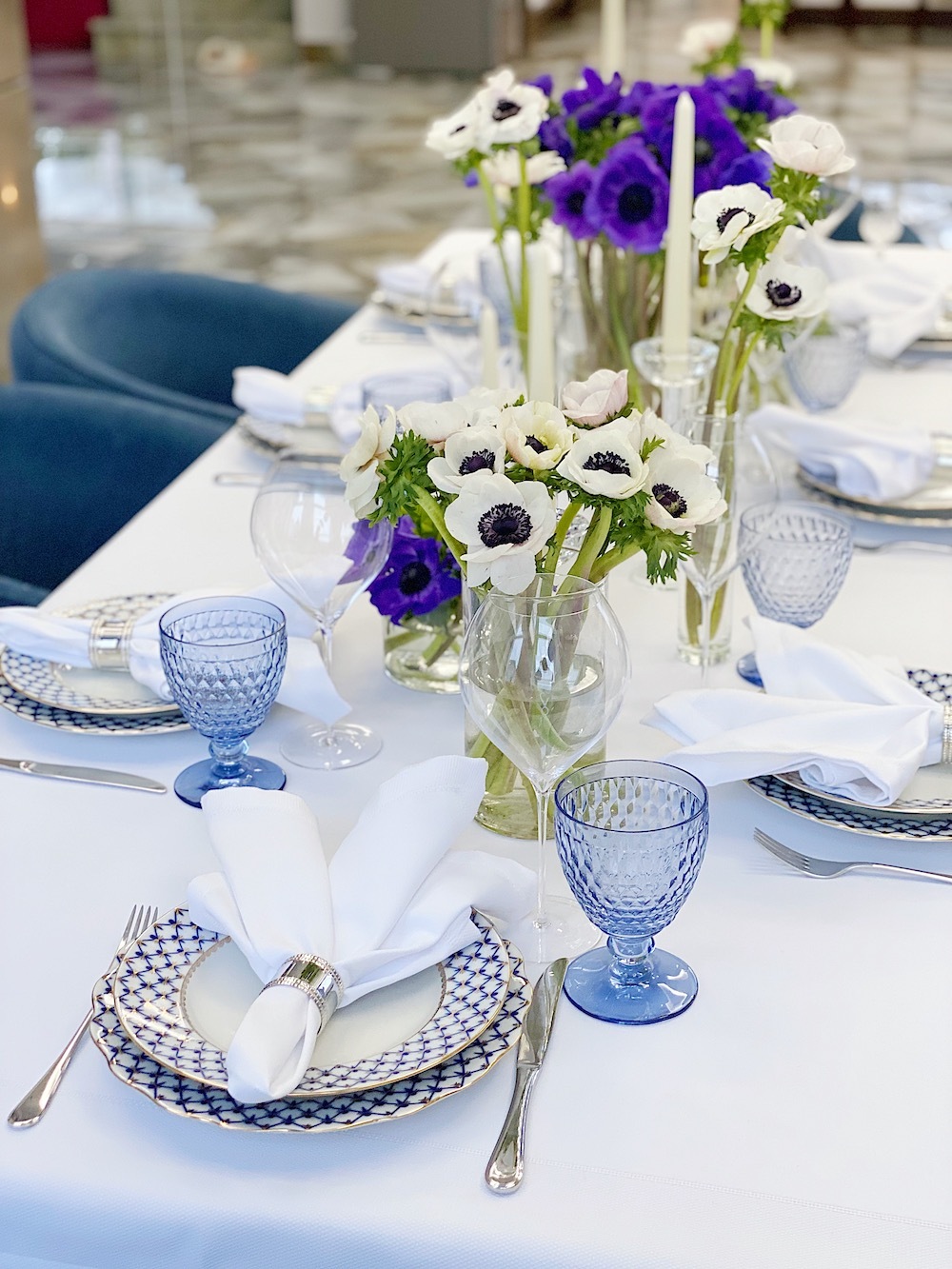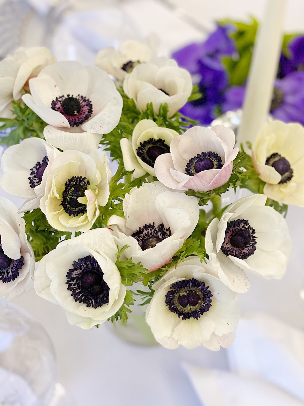 Тематикой праздника может стать что угодно! Даже любимые цветы — смотрите, как мы оформили пространство, отталкиваясь от анемонов: бело-голубая посуда, белоснежная скатерть и немного воздушных шаров. Стильный и очень сдержанный взрослый праздник, который порадует ваш взгляд, а аромат цветов станет завершающим штрихом!