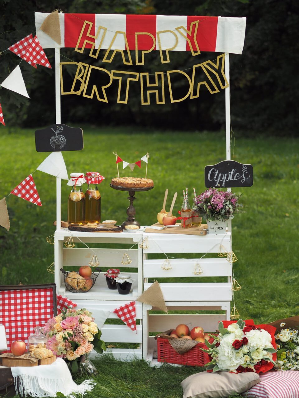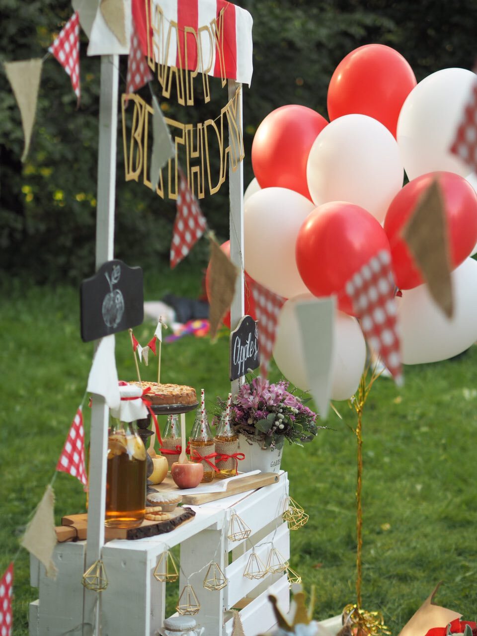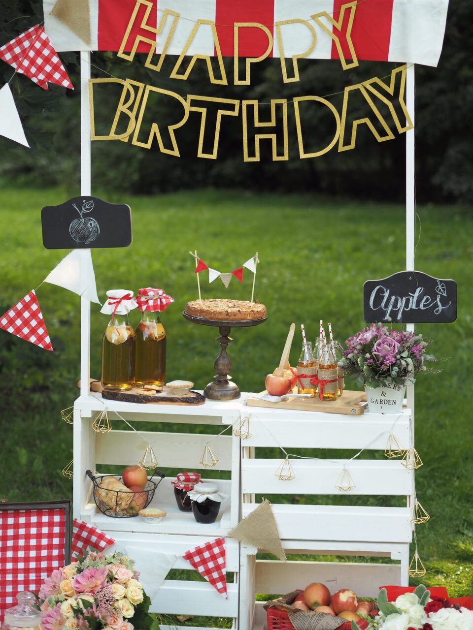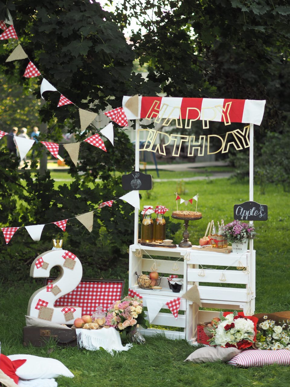У волшебницы Жени даже садовые яблочки могут стать стильной тематикой для детского дня рождения. Бело-красная гамма и стиль кантри, прослеживающийся в живых цветах и клетчатой текстильной отделке. А сколько всего вкусного можно приготовить из яблок – шарлотка, пироги, печенье и свежевыжатый сок! Теплая погода и вкусная еда, залог удавшегося дня рождения.