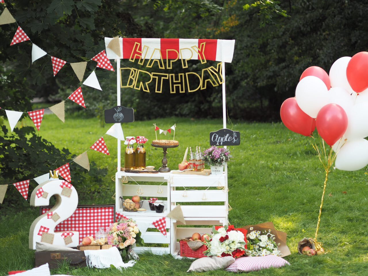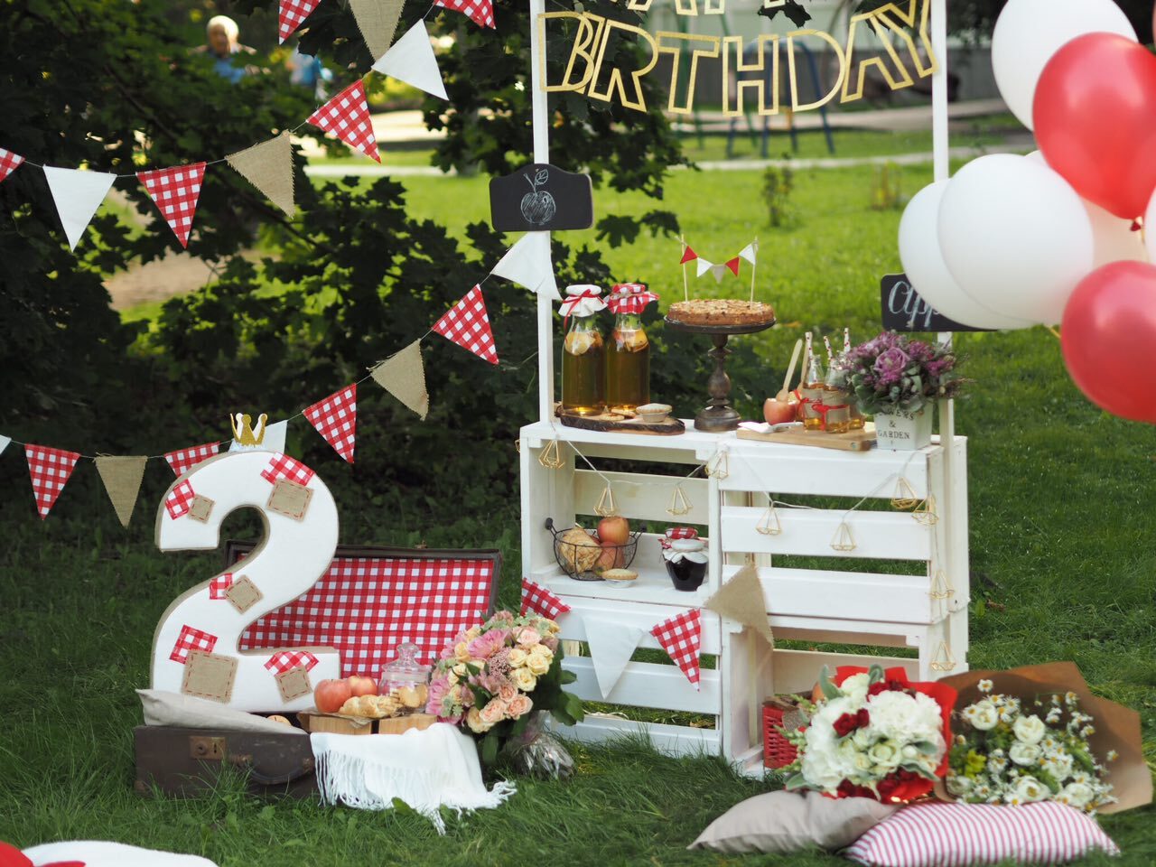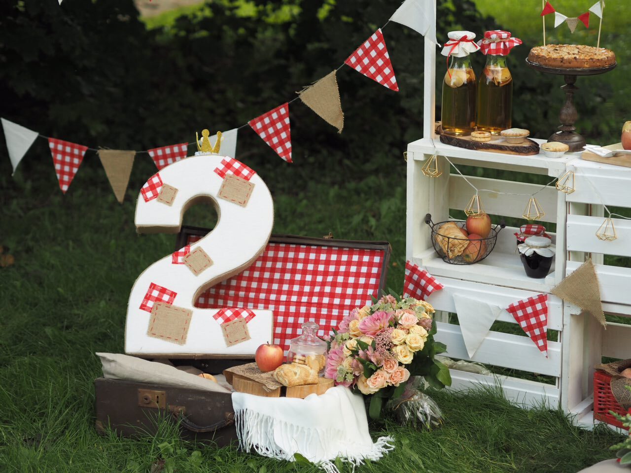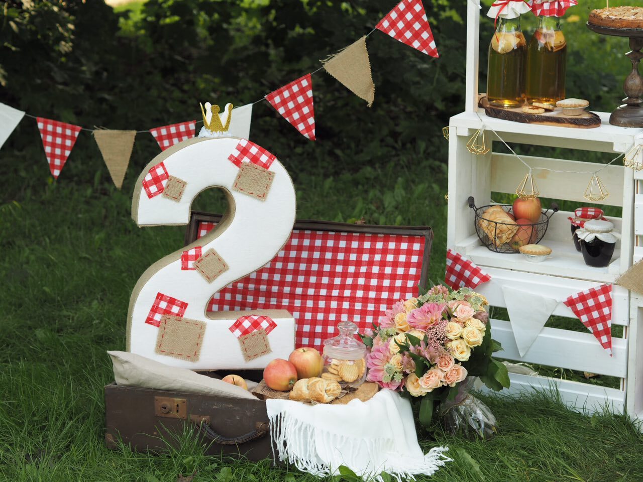 У волшебницы Жени даже садовые яблочки могут стать стильной тематикой для детского дня рождения. Бело-красная гамма и стиль кантри, прослеживающийся в живых цветах и клетчатой текстильной отделке. А сколько всего вкусного можно приготовить из яблок – шарлотка, пироги, печенье и свежевыжатый сок! Теплая погода и вкусная еда, залог удавшегося дня рождения.