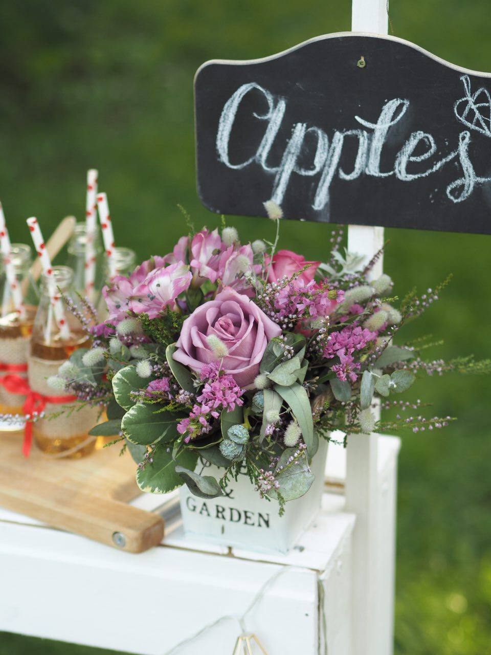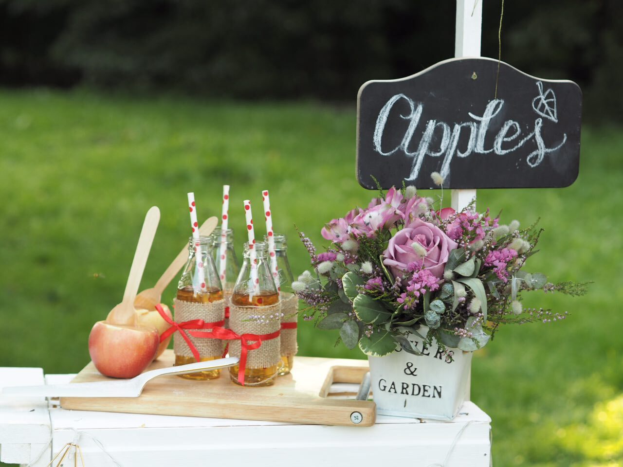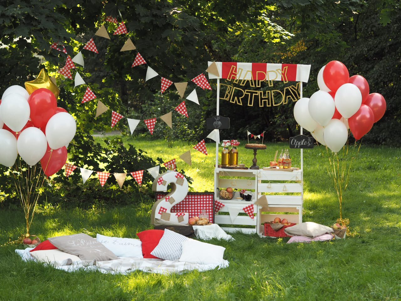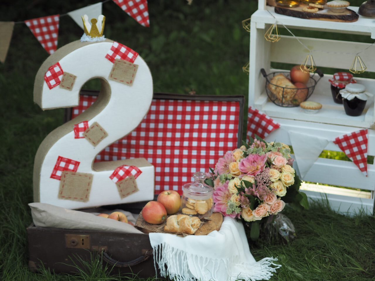 У волшебницы Жени даже садовые яблочки могут стать стильной тематикой для детского дня рождения. Бело-красная гамма и стиль кантри, прослеживающийся в живых цветах и клетчатой текстильной отделке. А сколько всего вкусного можно приготовить из яблок – шарлотка, пироги, печенье и свежевыжатый сок! Теплая погода и вкусная еда, залог удавшегося дня рождения.