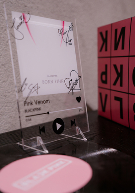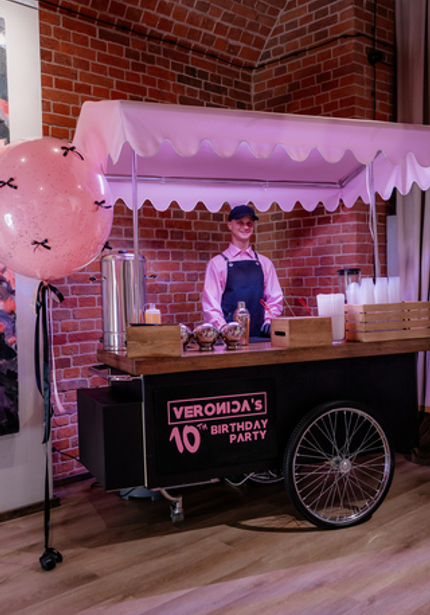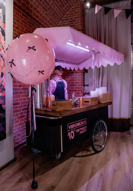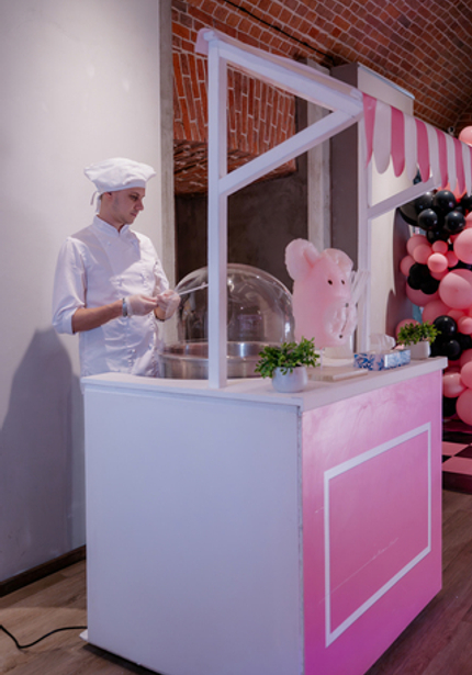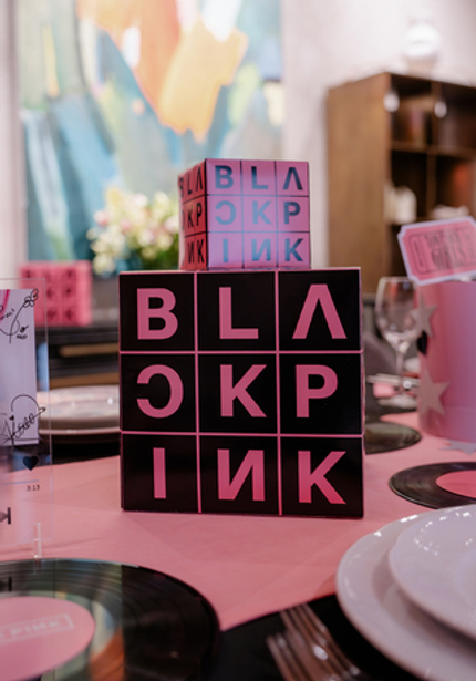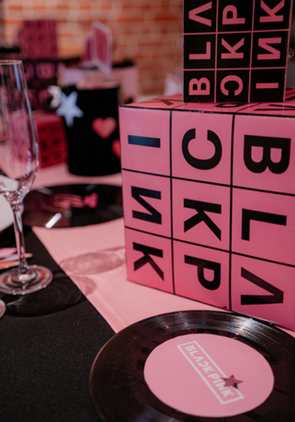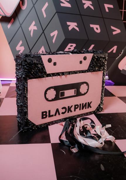 У нас была станция с бабл-ти — без него невозможно представить Корею, а ещё станция со сладкой ватой, которая идеально вписалась в наш чёрно-розовый декор. В фотобудке все могли сделать фотку в стиле Black Pink, а ещё мы разложили значки, которые можно было взять на память. Из самого потрясающего — торт с портретами участниц группы, а ещё стильная пиньята-кассета.