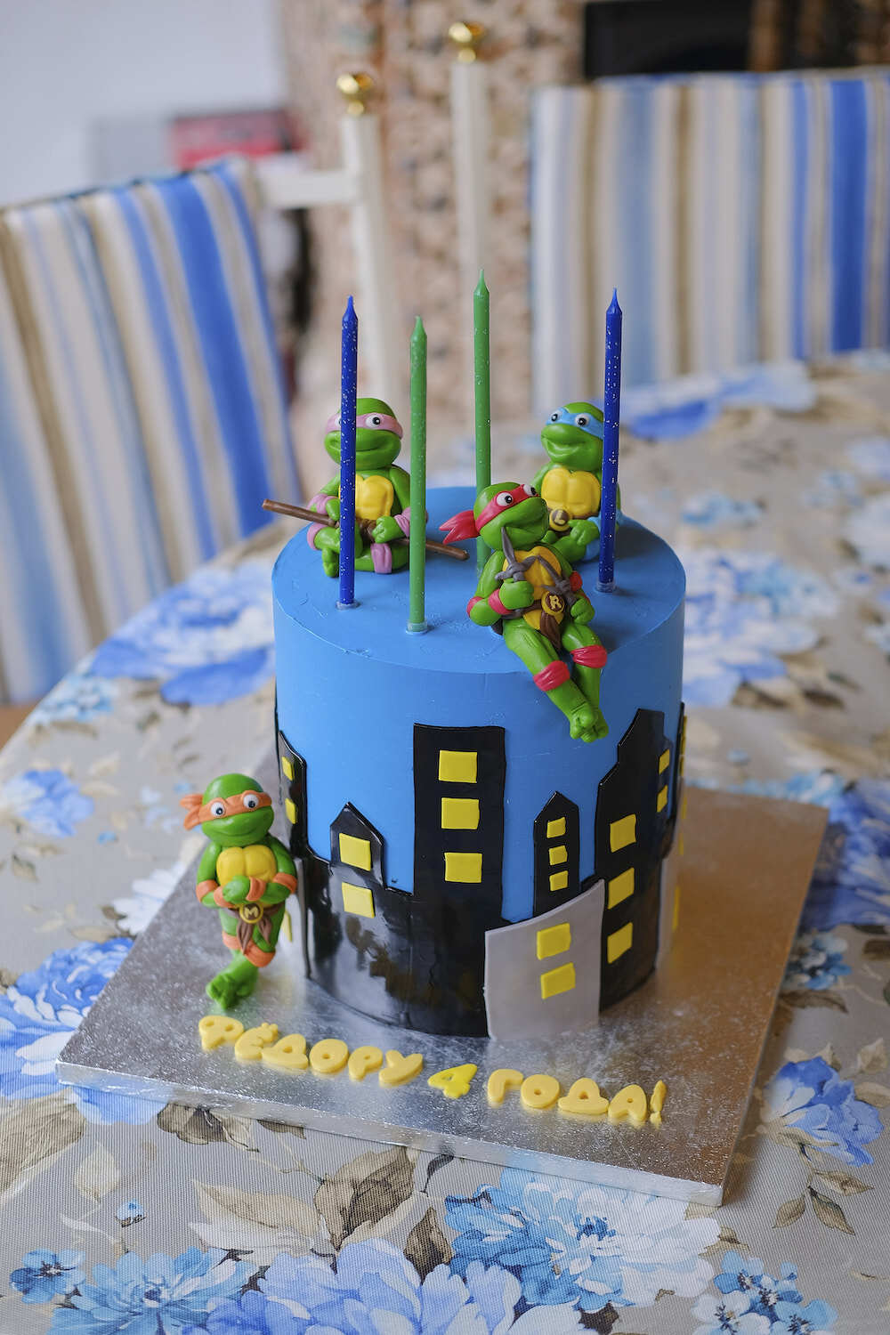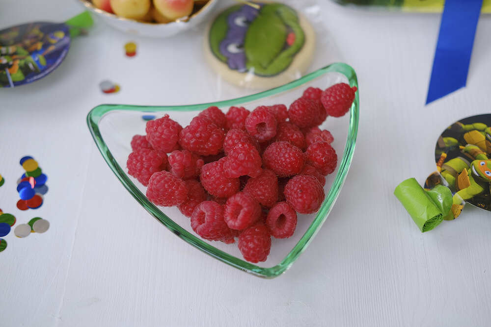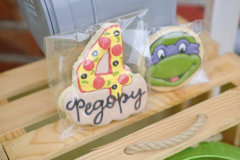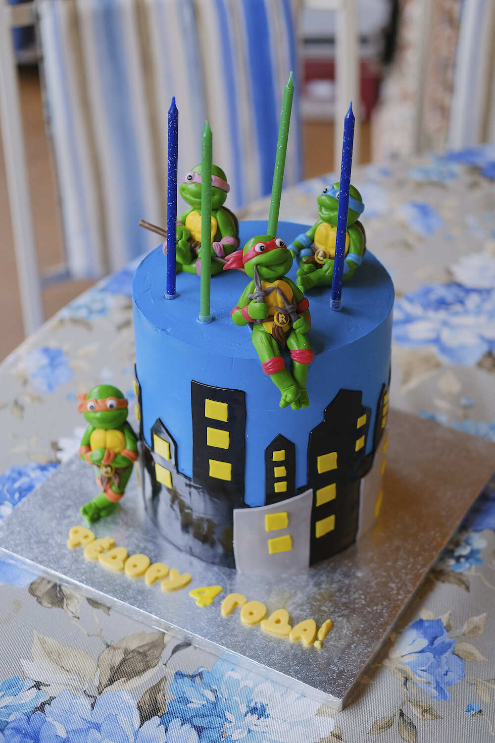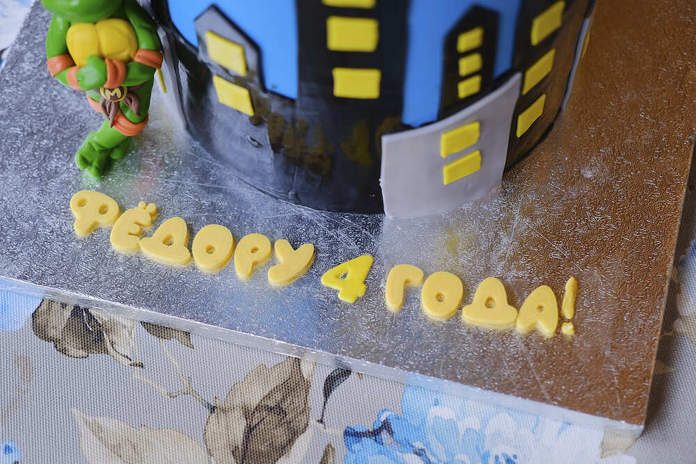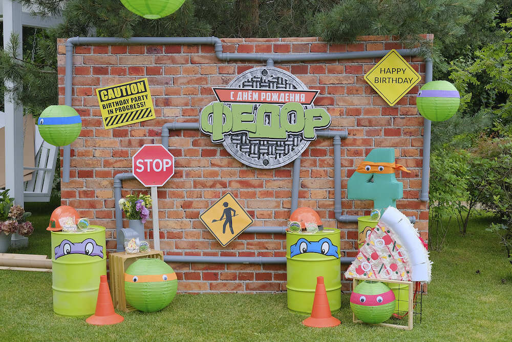 Каких героев бы ни обожал именинник, мы всегда сможем сделать крутой тематический праздник! Феде очень нравятся Черепашки-ниндзя, так что мы с вдохновением взялись за эту задачу. Приготовили тематические угощения — шикарный тортик и печенье, подобрали анимационную программу и пригласили героев мультика, а ещё всё вокруг украсили в стиле мультика.