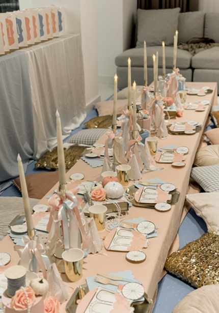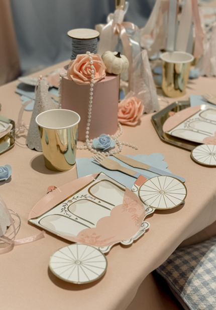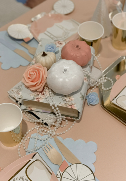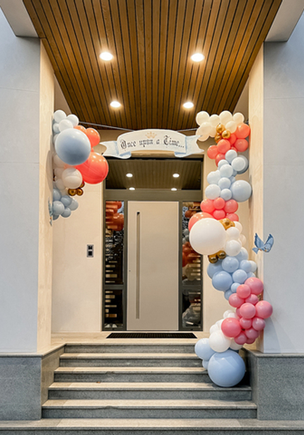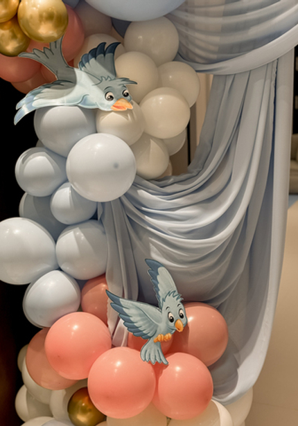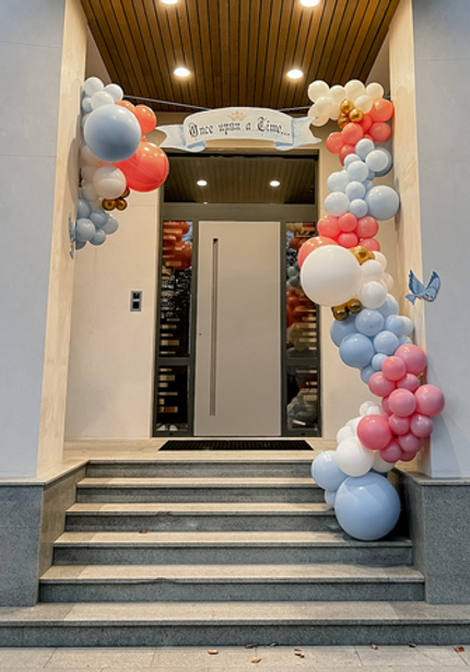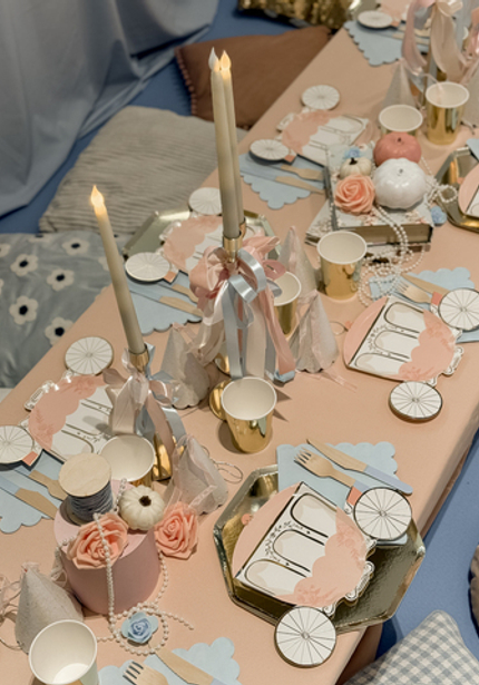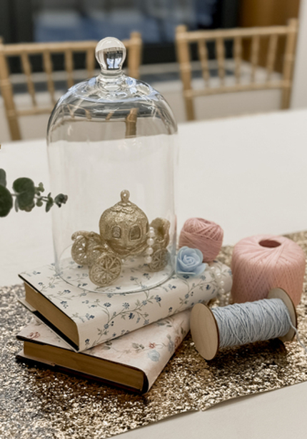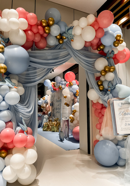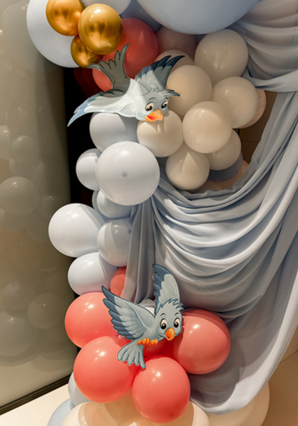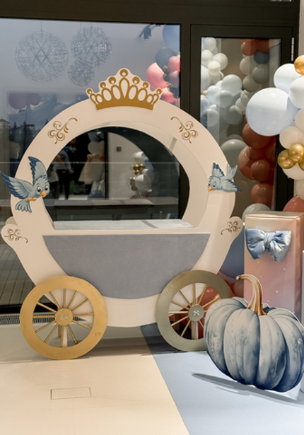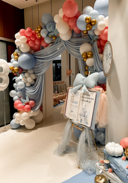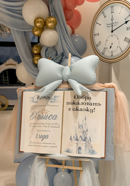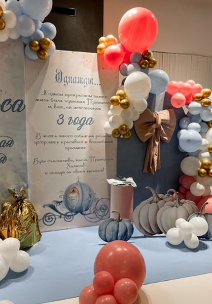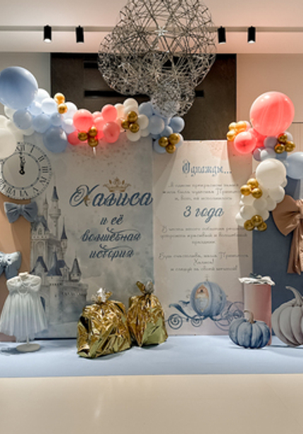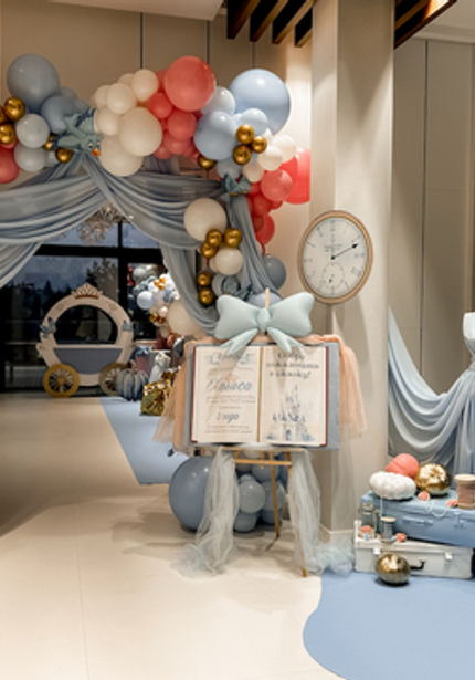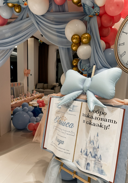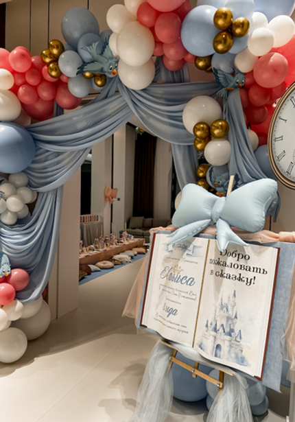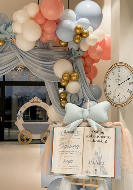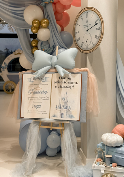 Мы украсили вход на улице шарами и сказочным баннером Once upon a time, чтобы сразу погружать гостей в атмосферу праздника. Когда они заходили внутрь, их встречала нарядная арка из струящейся голубой ткани и воздушных шаров. Но самое главное ждало всех внутри! Например, 7-метровая фотозона с подставкой под сладости в виде кареты или чудесное голубое платье Золушки, подол которого держали птички из мультфильма. Везде были символы этой сказки: часы, тыквы, катушки с нитками и другие волшебные мелочи.