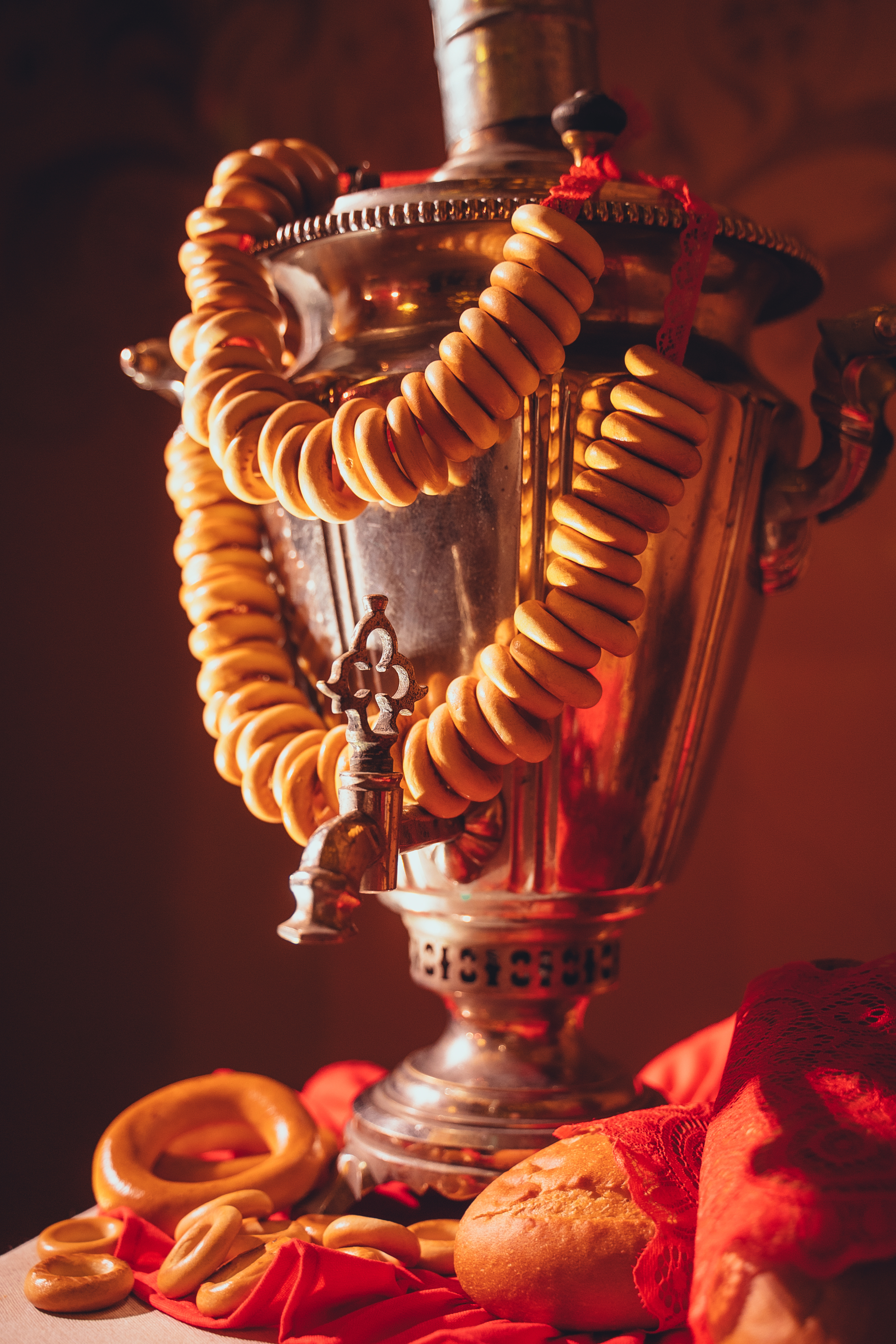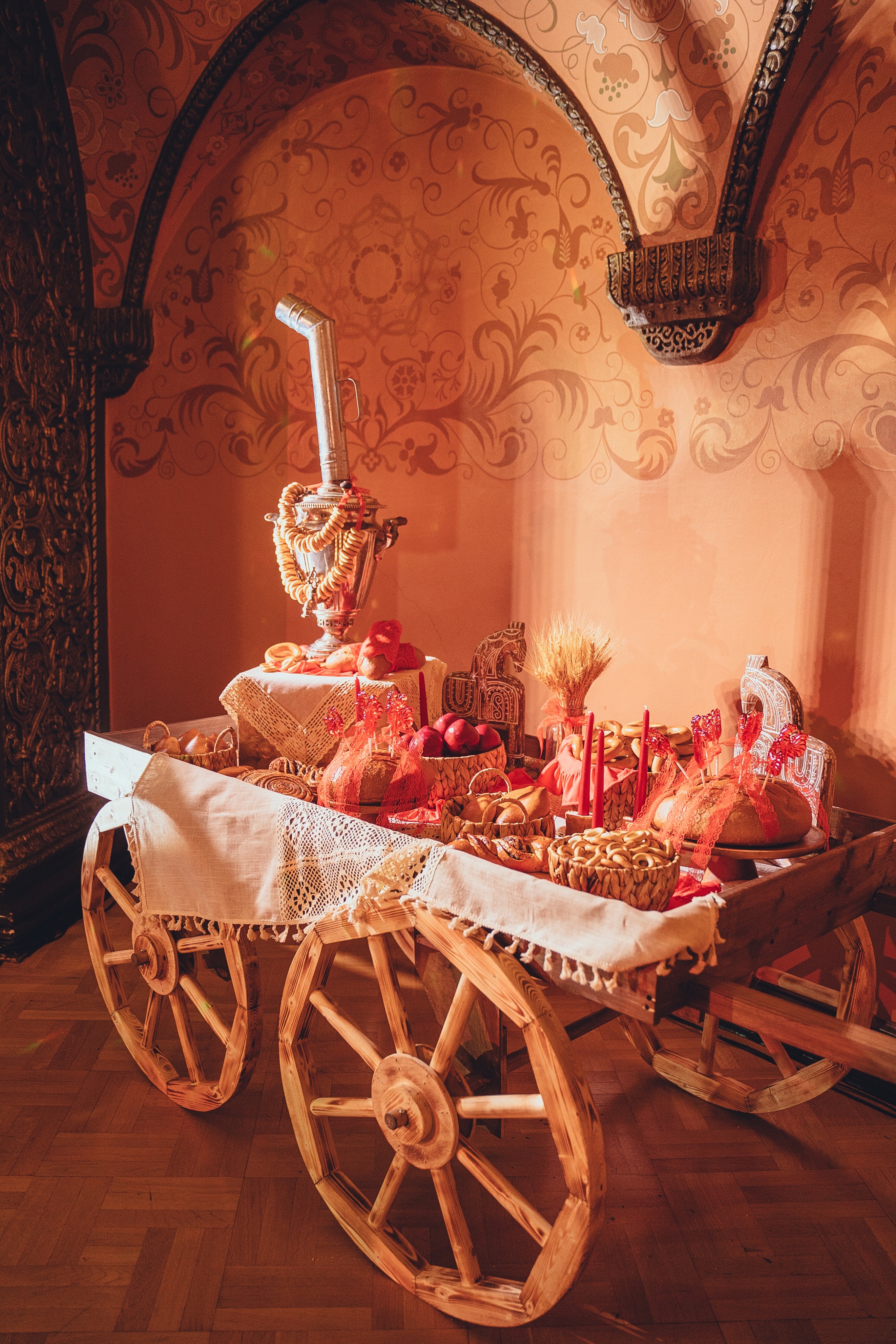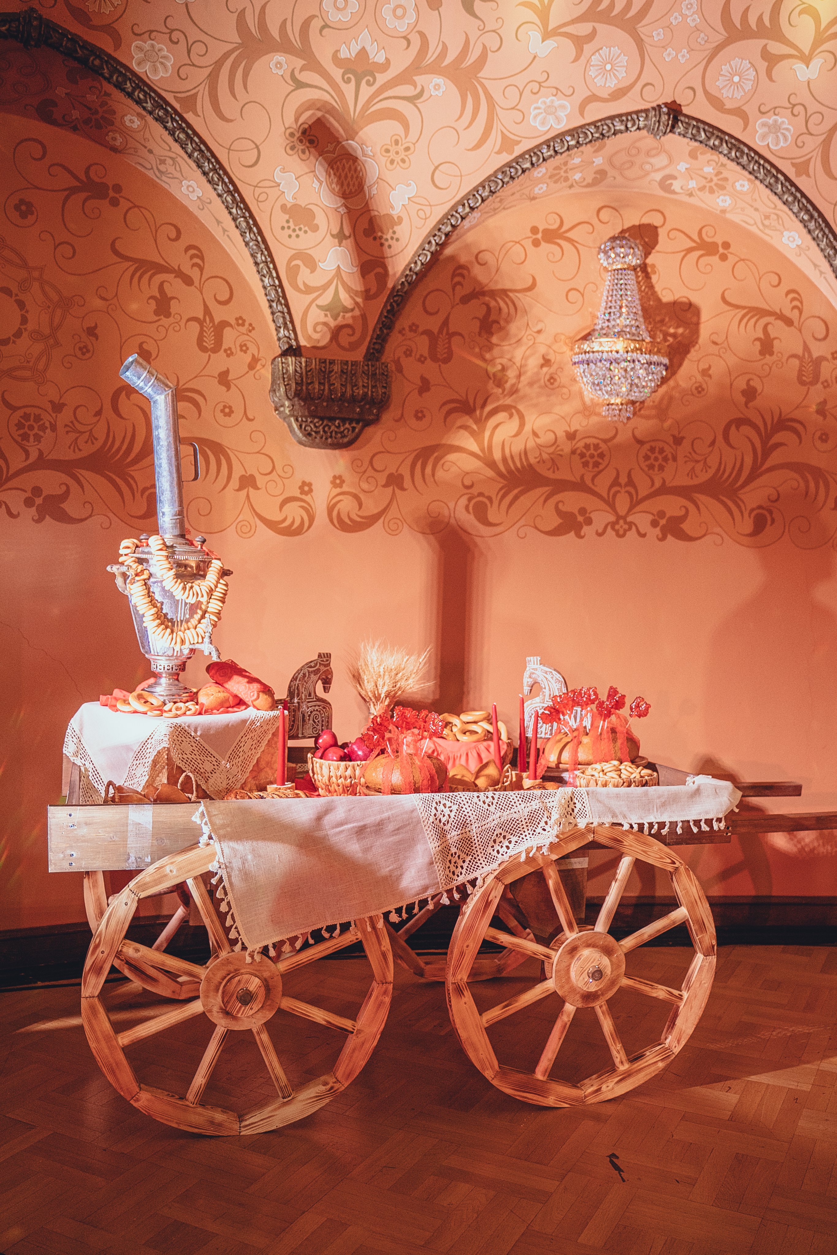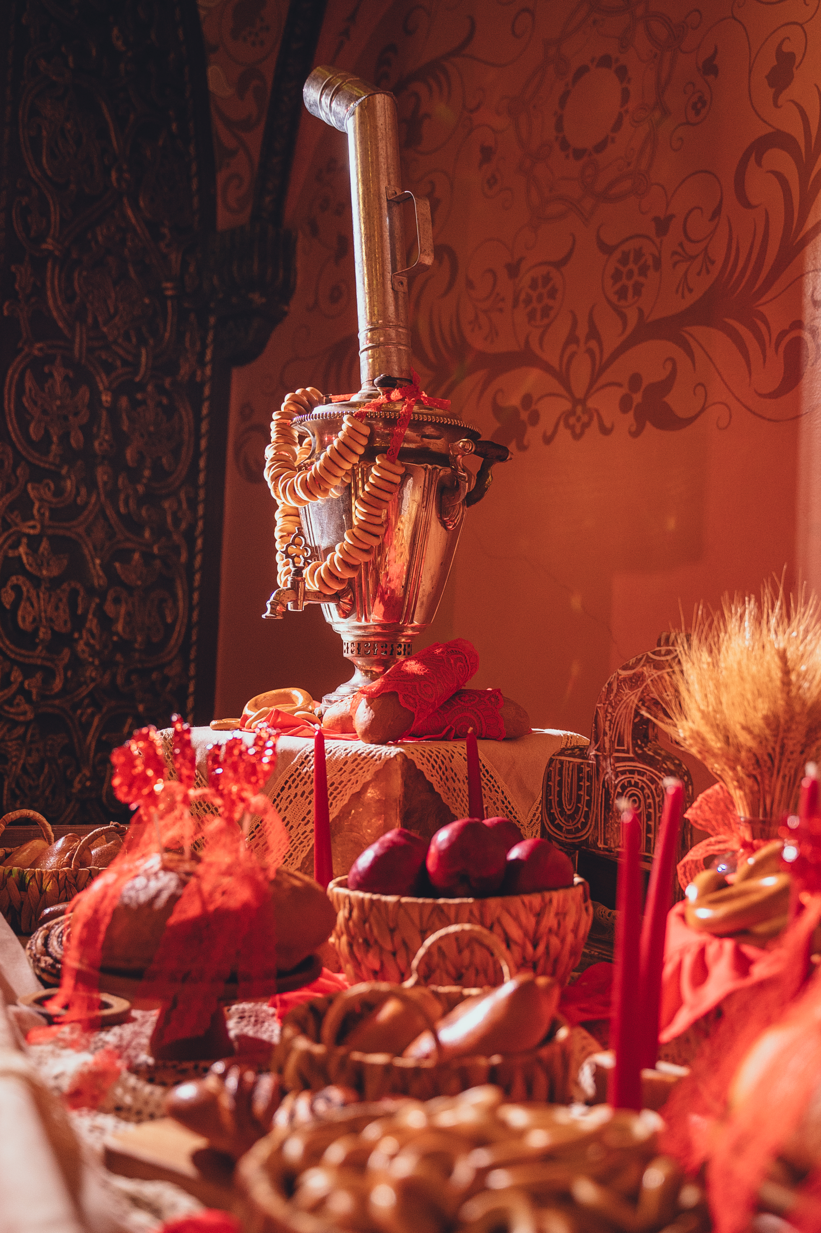 В комплект с атрибутикой входят: самовар, текстиль, съедобный декор, свечи, баранки, ленточки или другой тематический декор, который обсуждается с менеджером в индивидуальном порядке.