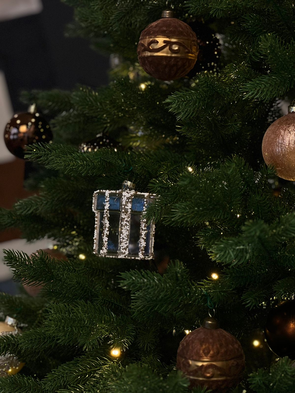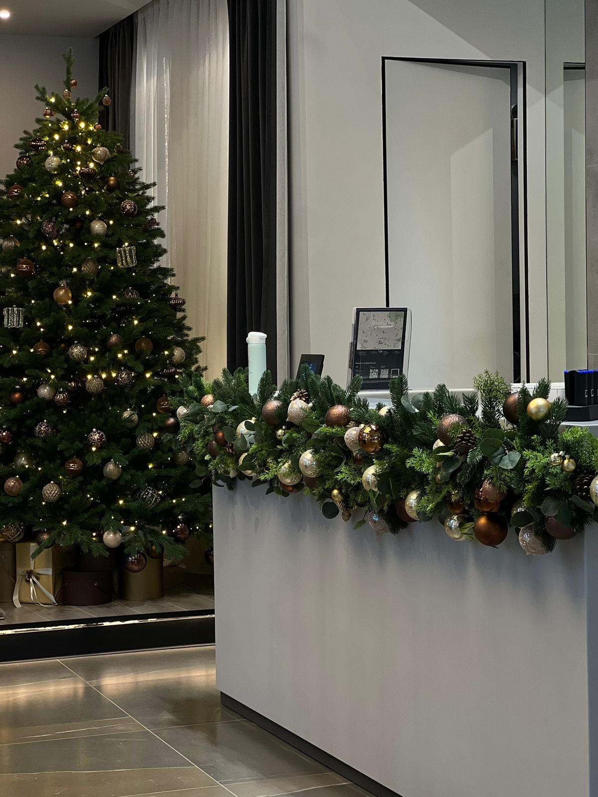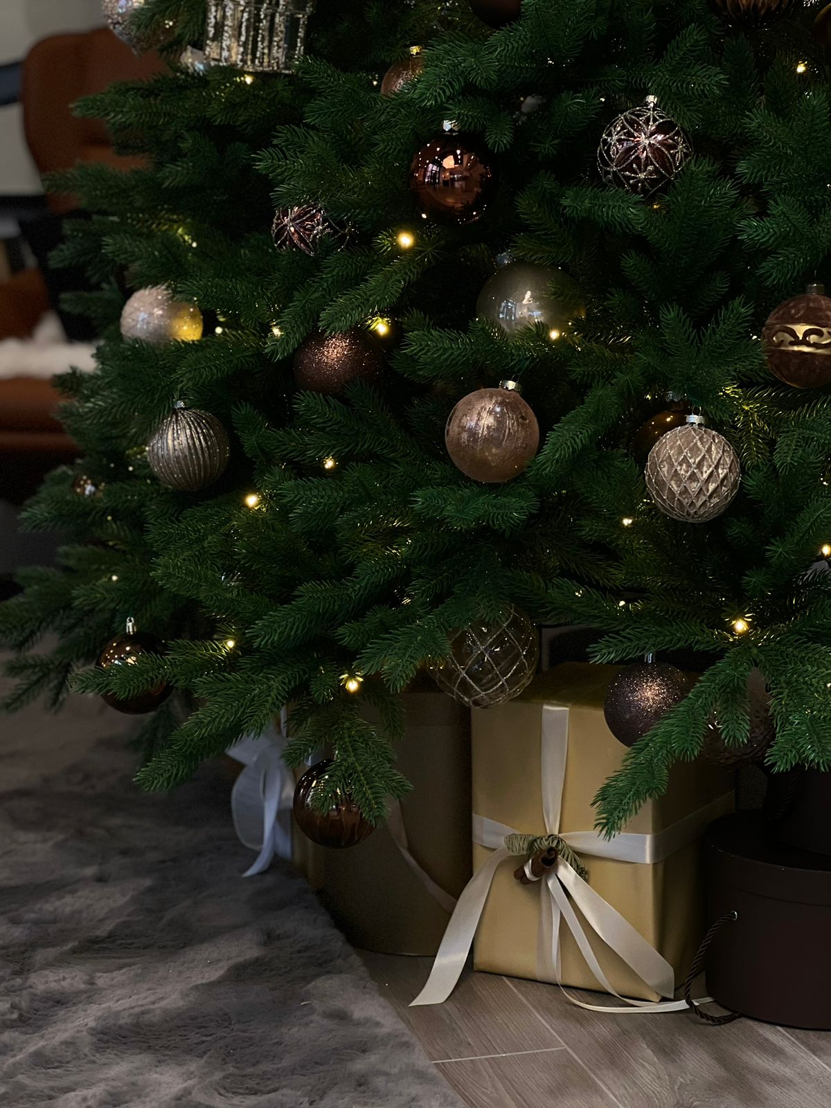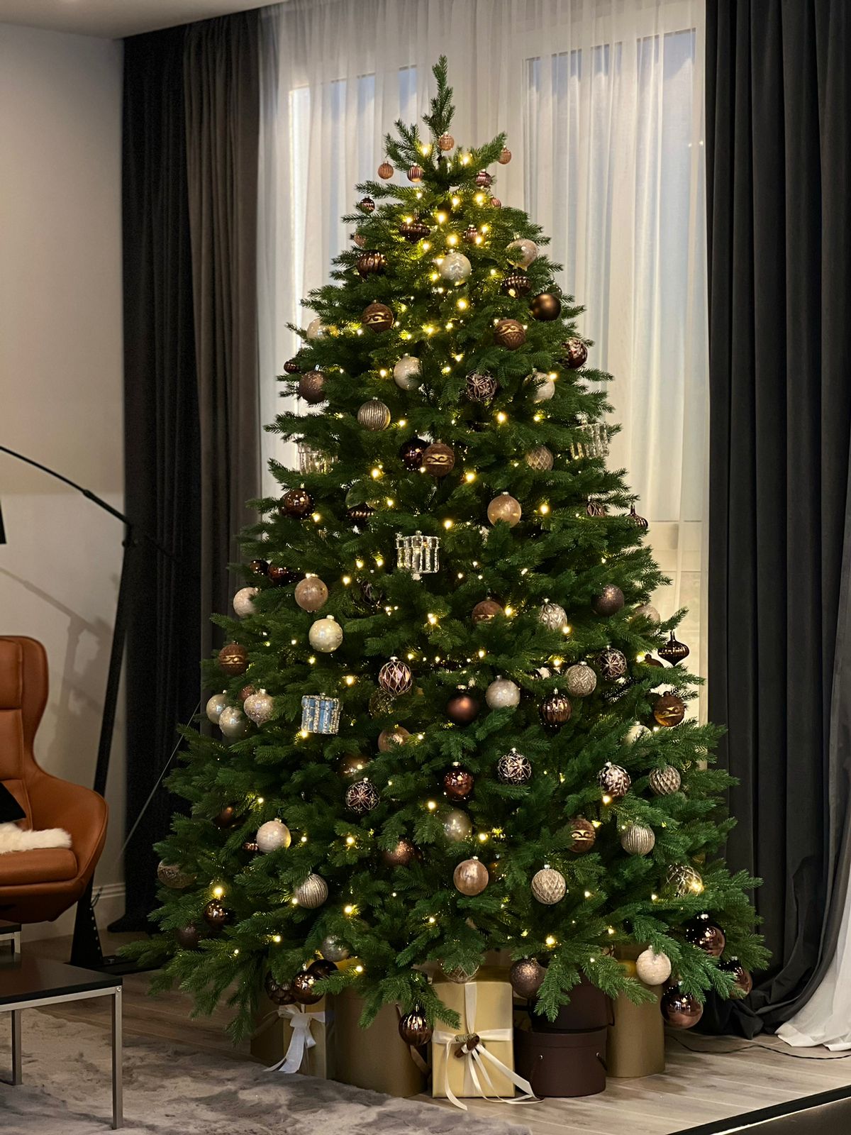Эта ель — воплощение волшебства и элегантности. Её густая зелёная хвоя из литого материала оживает под сиянием встроенной гирлянды, а украшения в белых и глубоких красных оттенках наполняют интерьер теплом, уютом и атмосферой настоящего торжества. Под елью расположены декоративные подарки, завершающие образ и превращающие её в главный символ праздника.