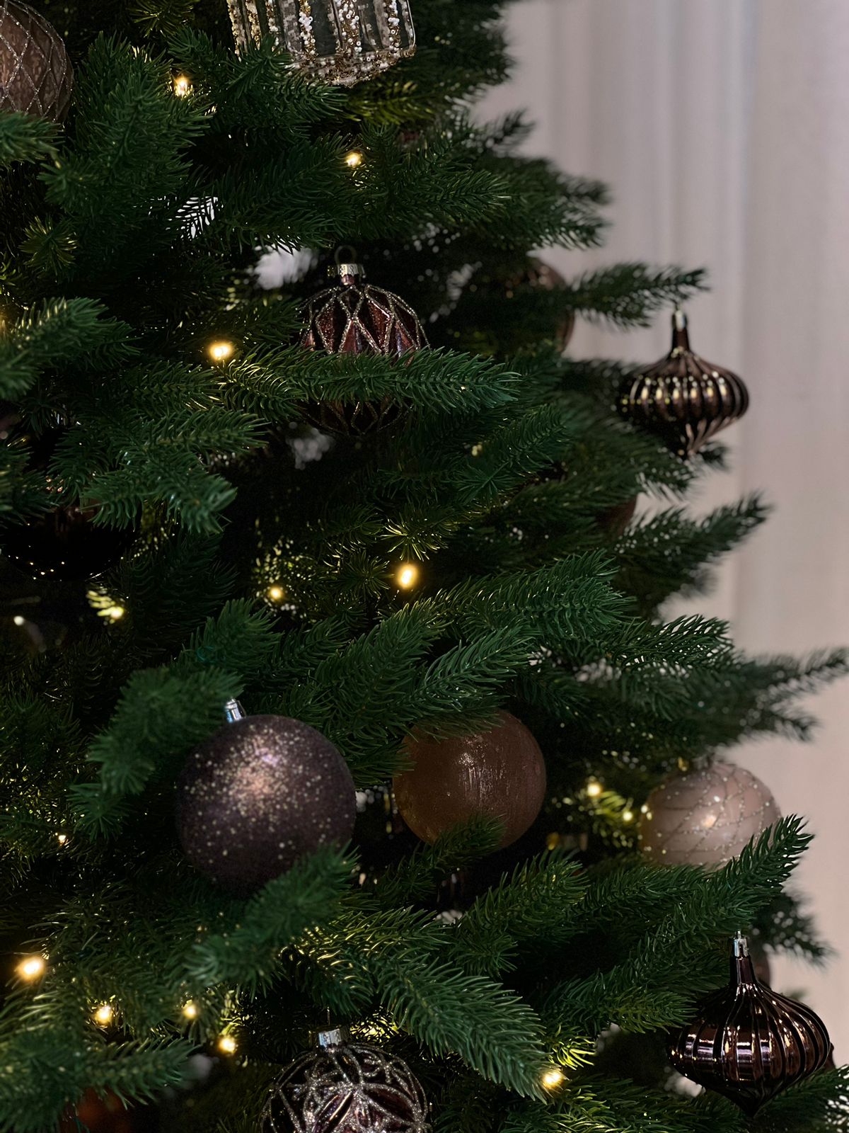 ✔ Комплект игрушек разных диаметров: 50% пластик, 25% стекло, 25% дизайнерские украшения и фигурки