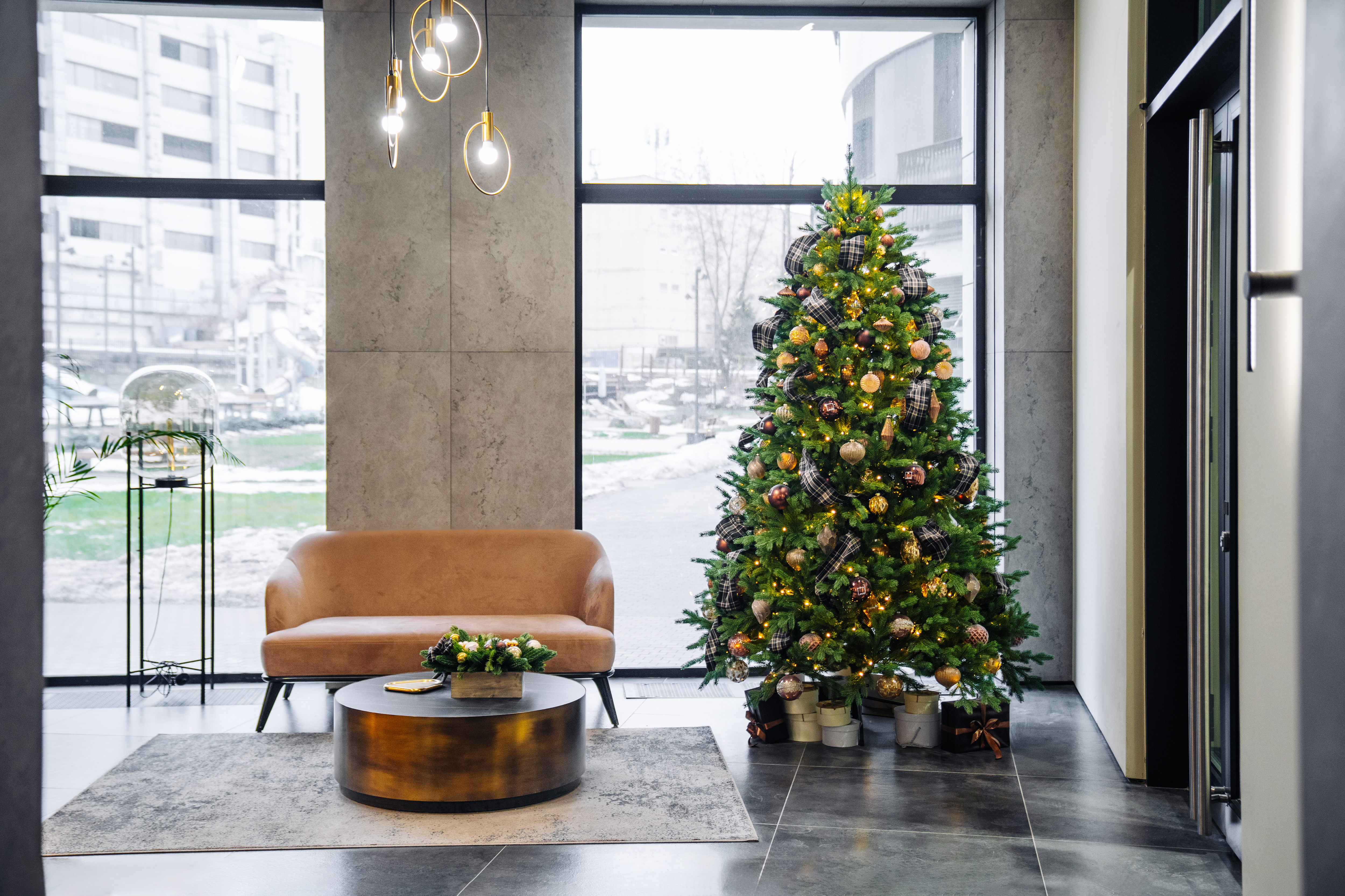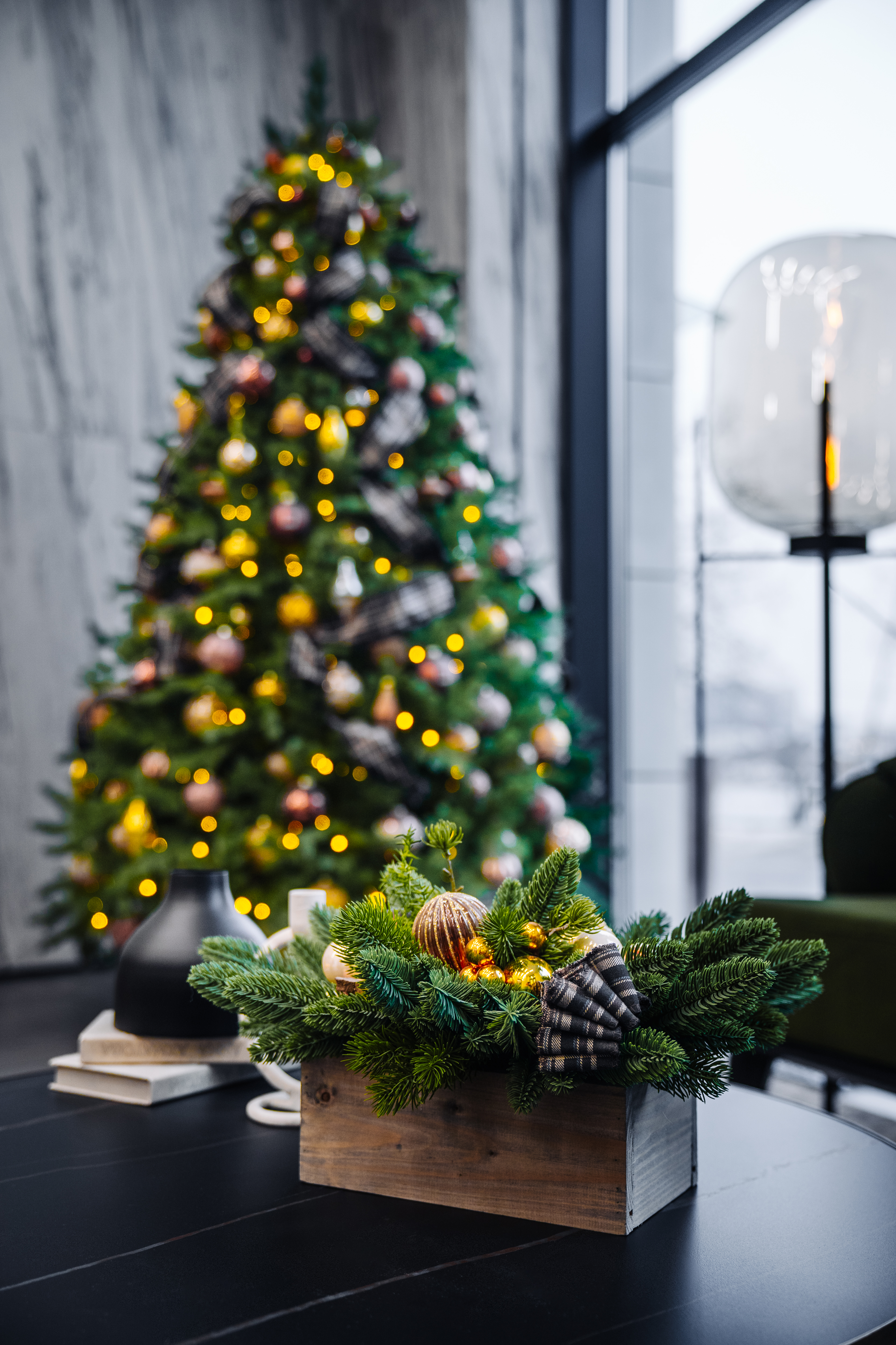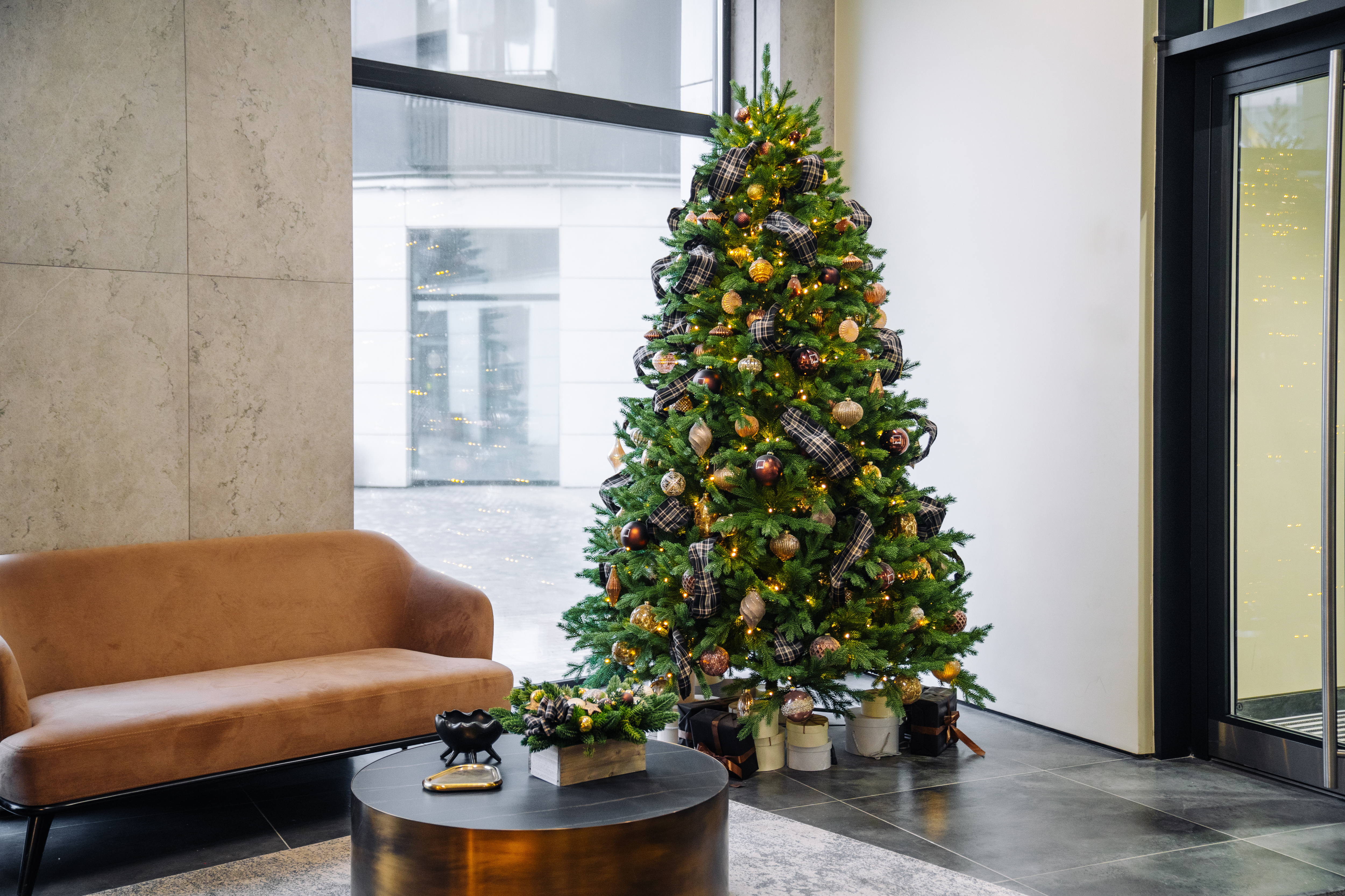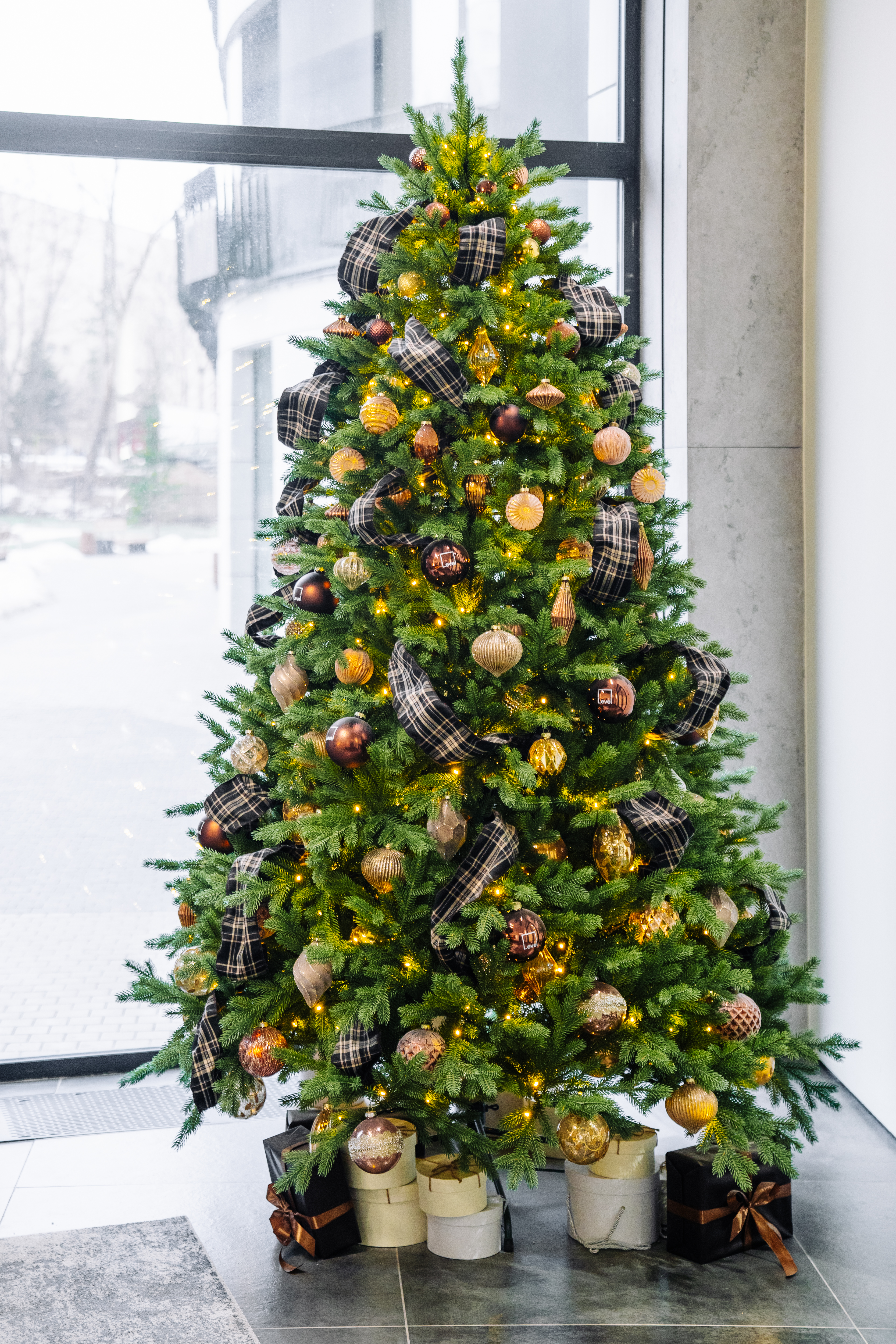 Эта ель — воплощение волшебства и элегантности. Её густая зелёная хвоя из литого материала оживает под сиянием встроенной гирлянды, а украшения в белых и глубоких красных оттенках наполняют интерьер теплом, уютом и атмосферой настоящего торжества. Под елью расположены декоративные подарки, завершающие образ и превращающие её в главный символ праздника.