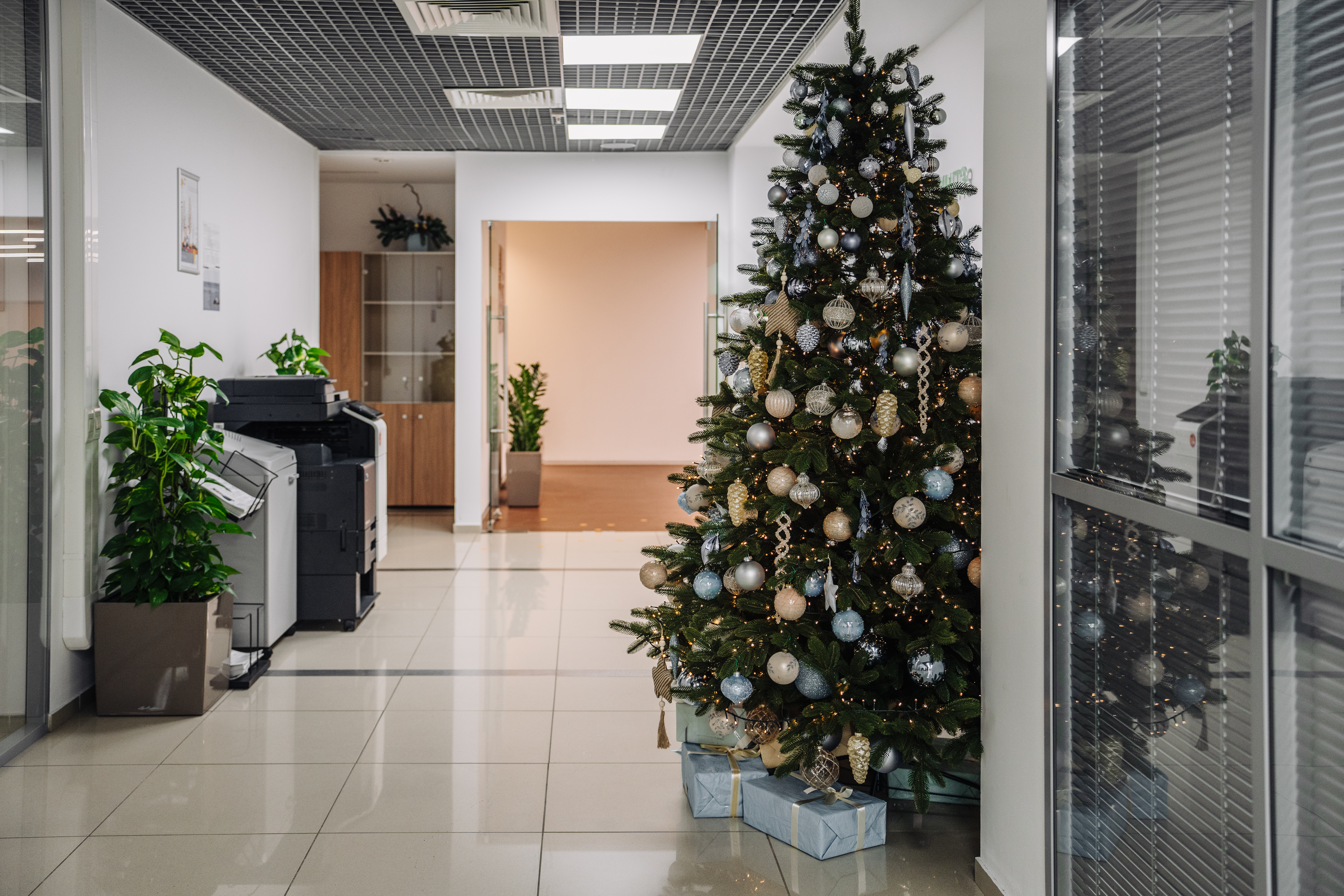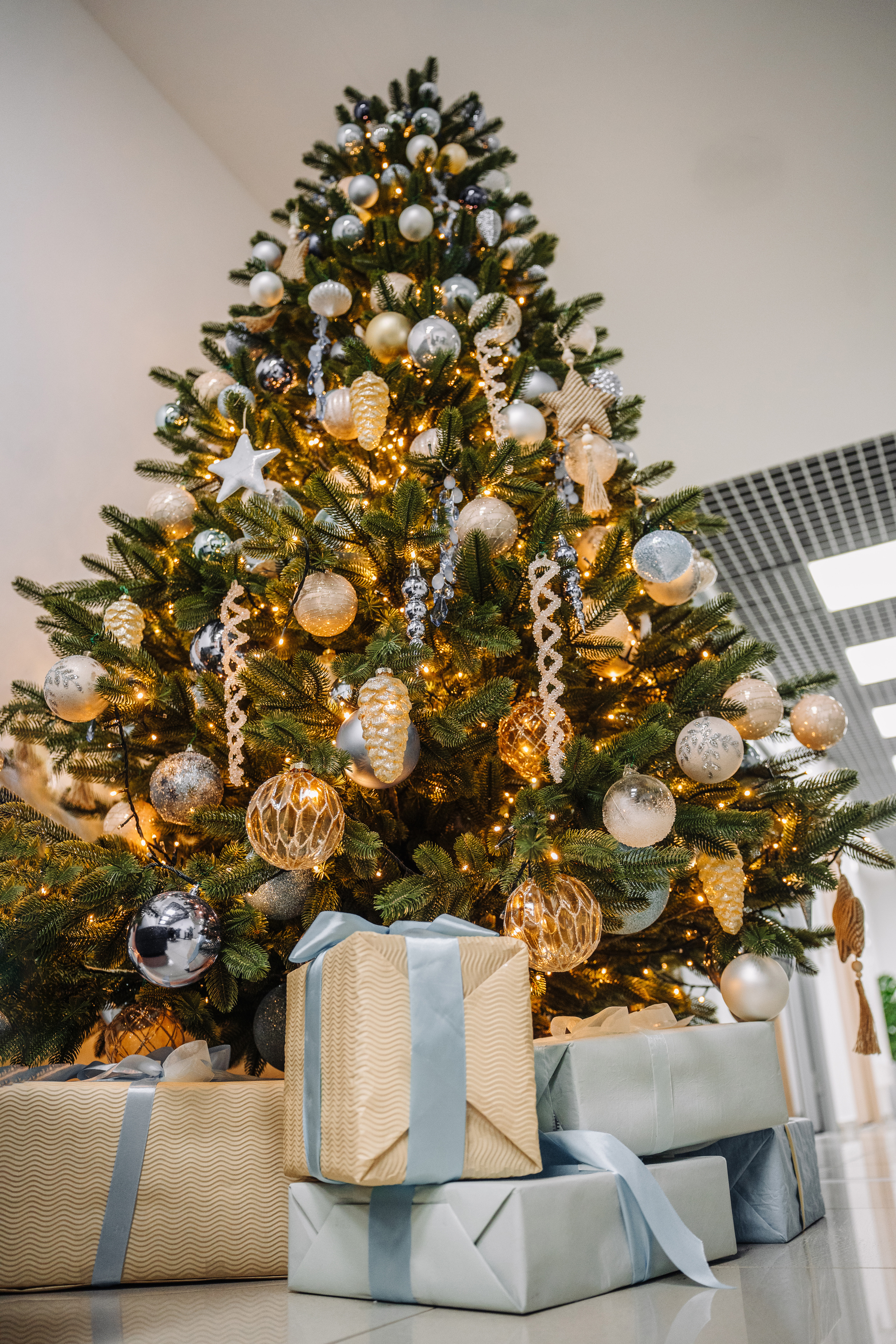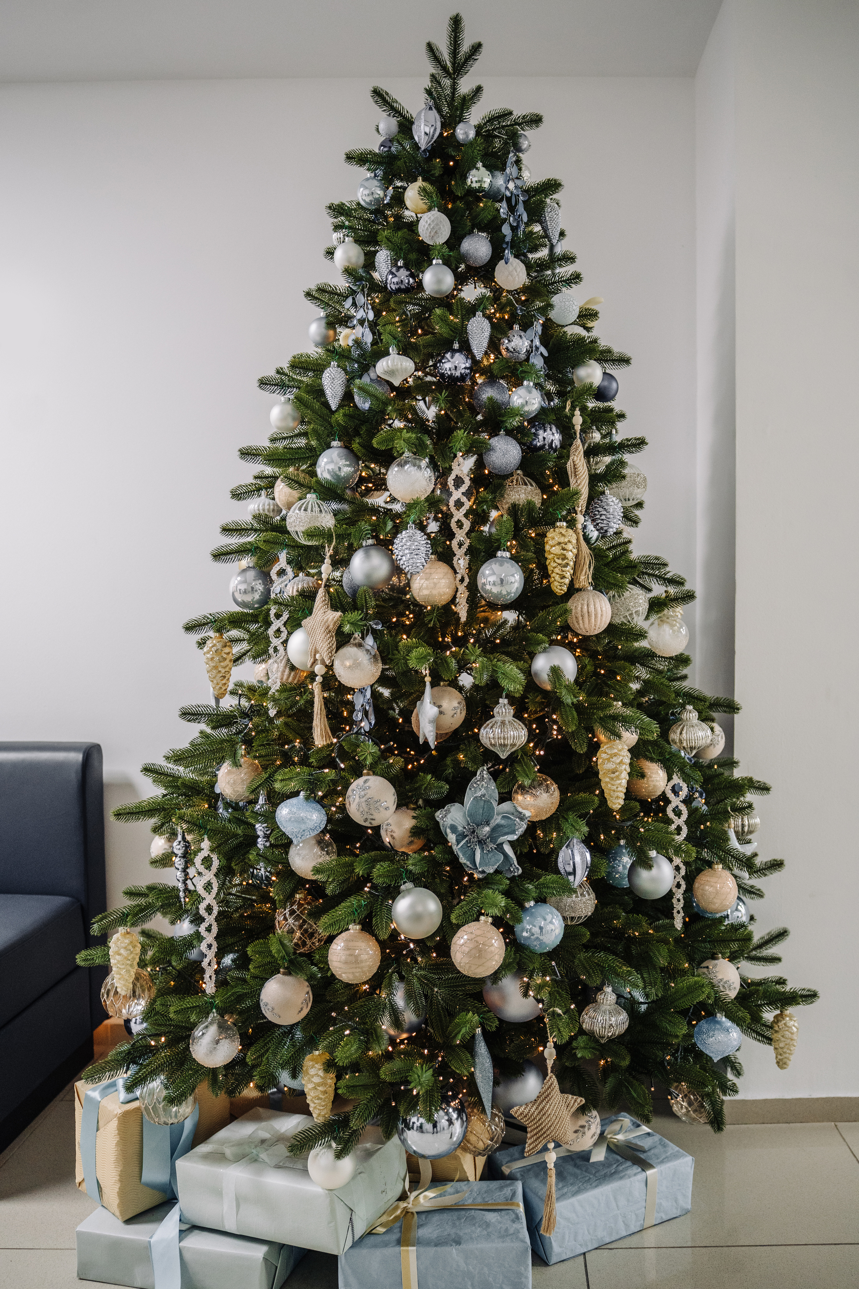 Эта ель — воплощение волшебства и элегантности. Её густая зелёная хвоя из литого материала оживает под сиянием встроенной гирлянды, а украшения в белых и глубоких красных оттенках наполняют интерьер теплом, уютом и атмосферой настоящего торжества. Под елью расположены декоративные подарки, завершающие образ и превращающие её в главный символ праздника.