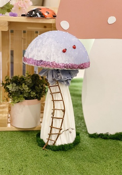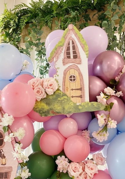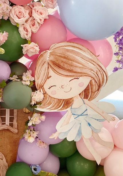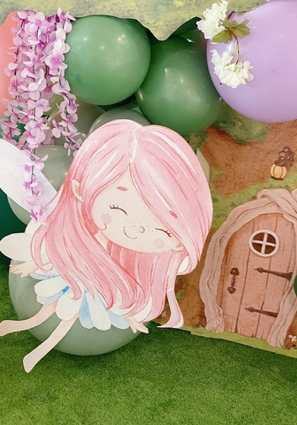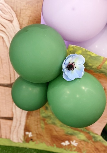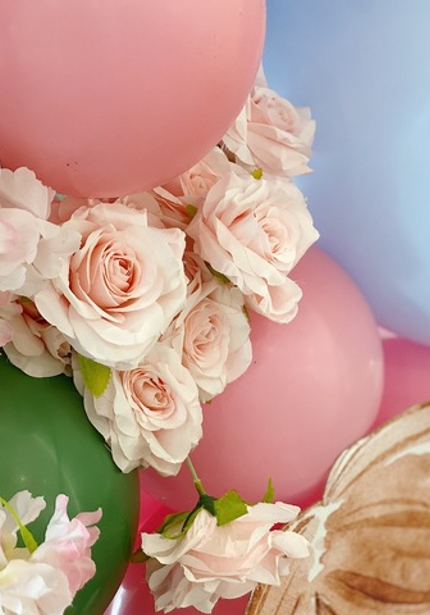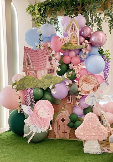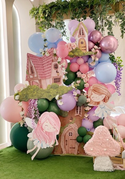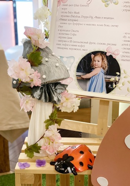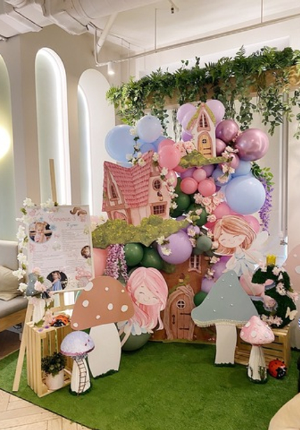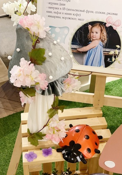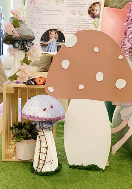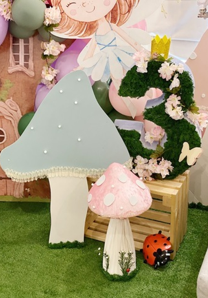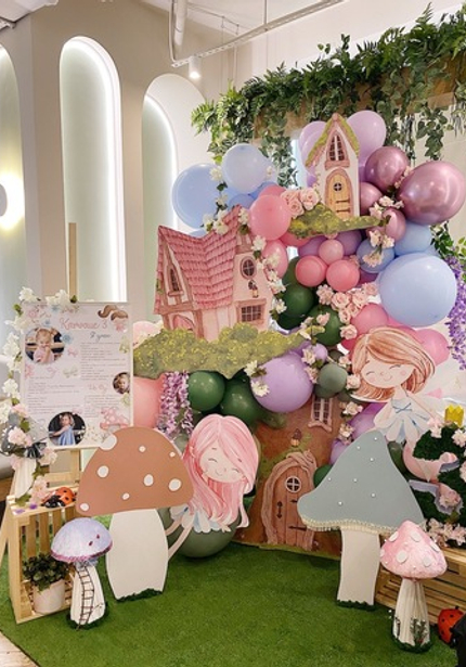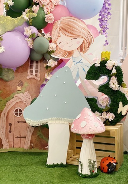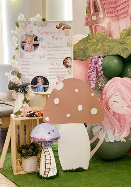 Волшебная фотозона, присыпанная фейской пыльцой — мы постарались добавить как можно больше сказочных деталей! В декоре зелень гармонично сочеталась с воздушными шарами, среди которых распускались чайнык розы. Но полянка не была бы такой волшебной без разноцветных огромных грибов — над ними мы особенно старались.