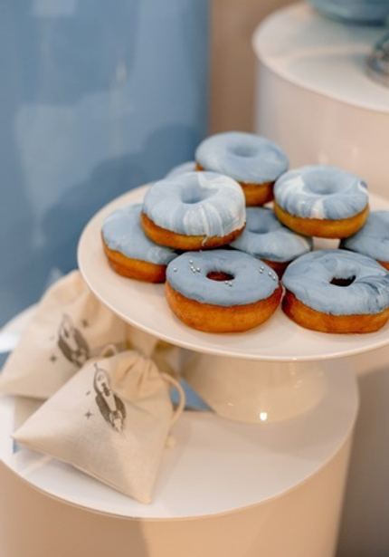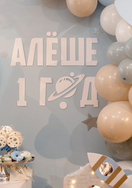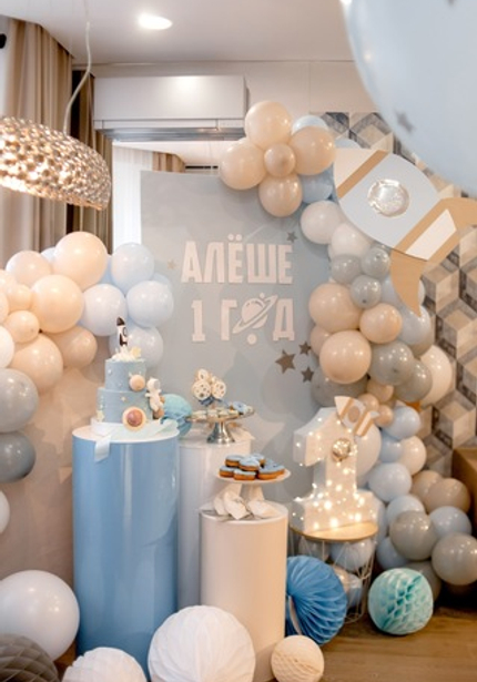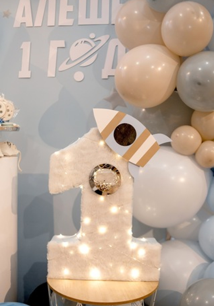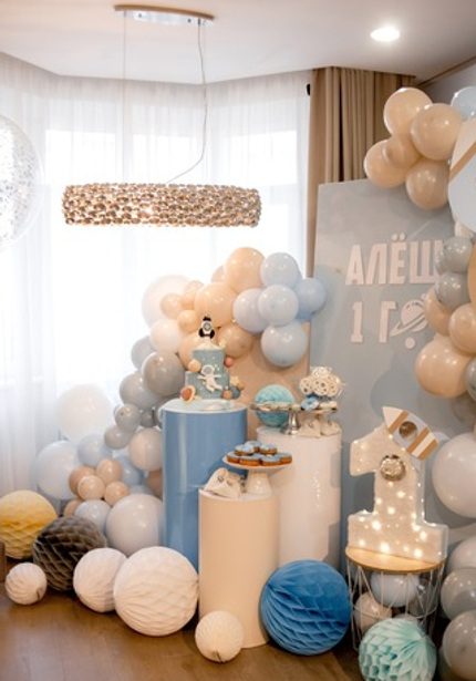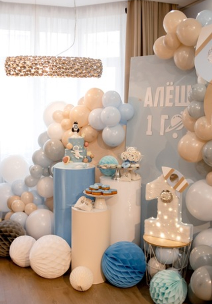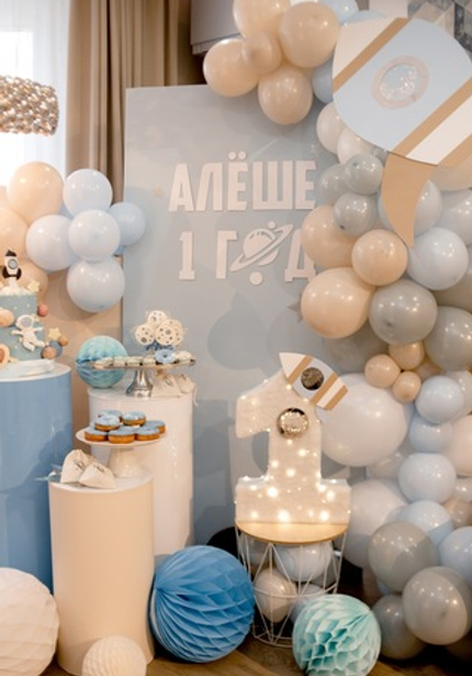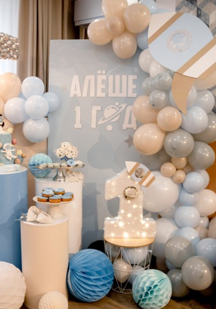 Этот день рождения украсили шарики в голубых и бежевых тонах и такие же угощения! Циферку 1 украсили огоньки и ракета — получилось очень красиво и волшебно.