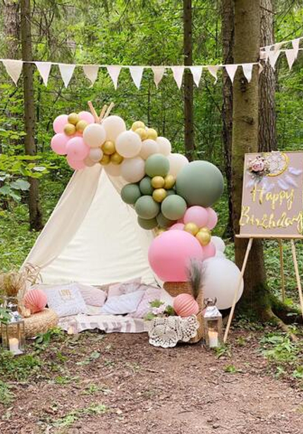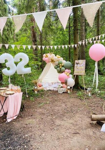 Сколько бы ни было лет девочке — 12 или 32, ей всегда хочется красивый и волшебный праздник! Например, для Даши мы устроили романтичный глэмпинг в лесу: с палаткой, воздушными шарами, гирляндами и в абсолютно сказочной атмосфере. Не бойтесь воплотить свои самые необычные идеи в день рождения, сколько бы лет вам ни было!