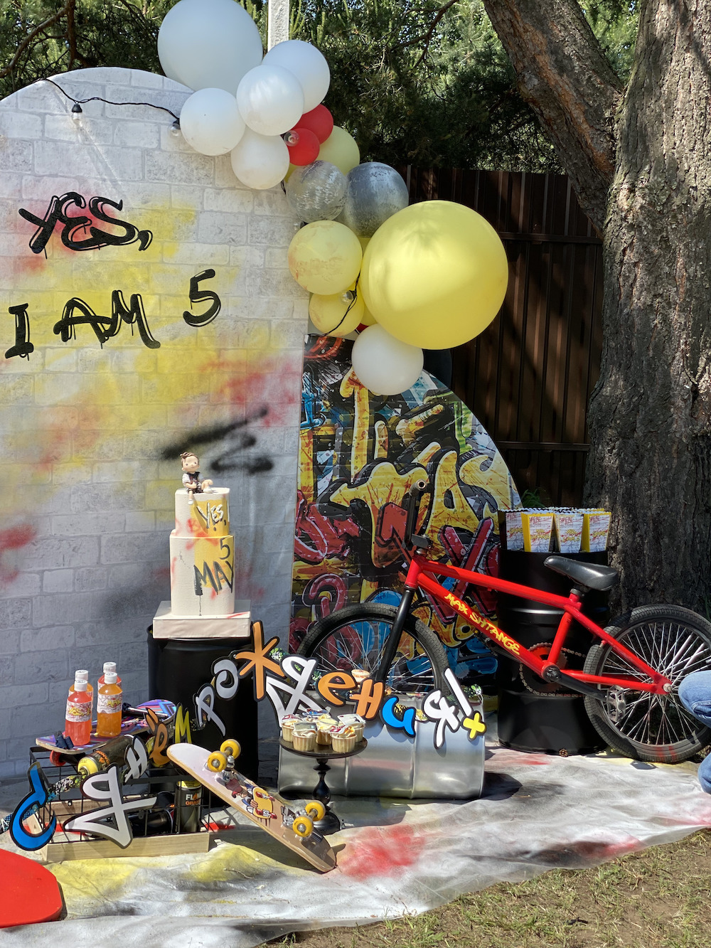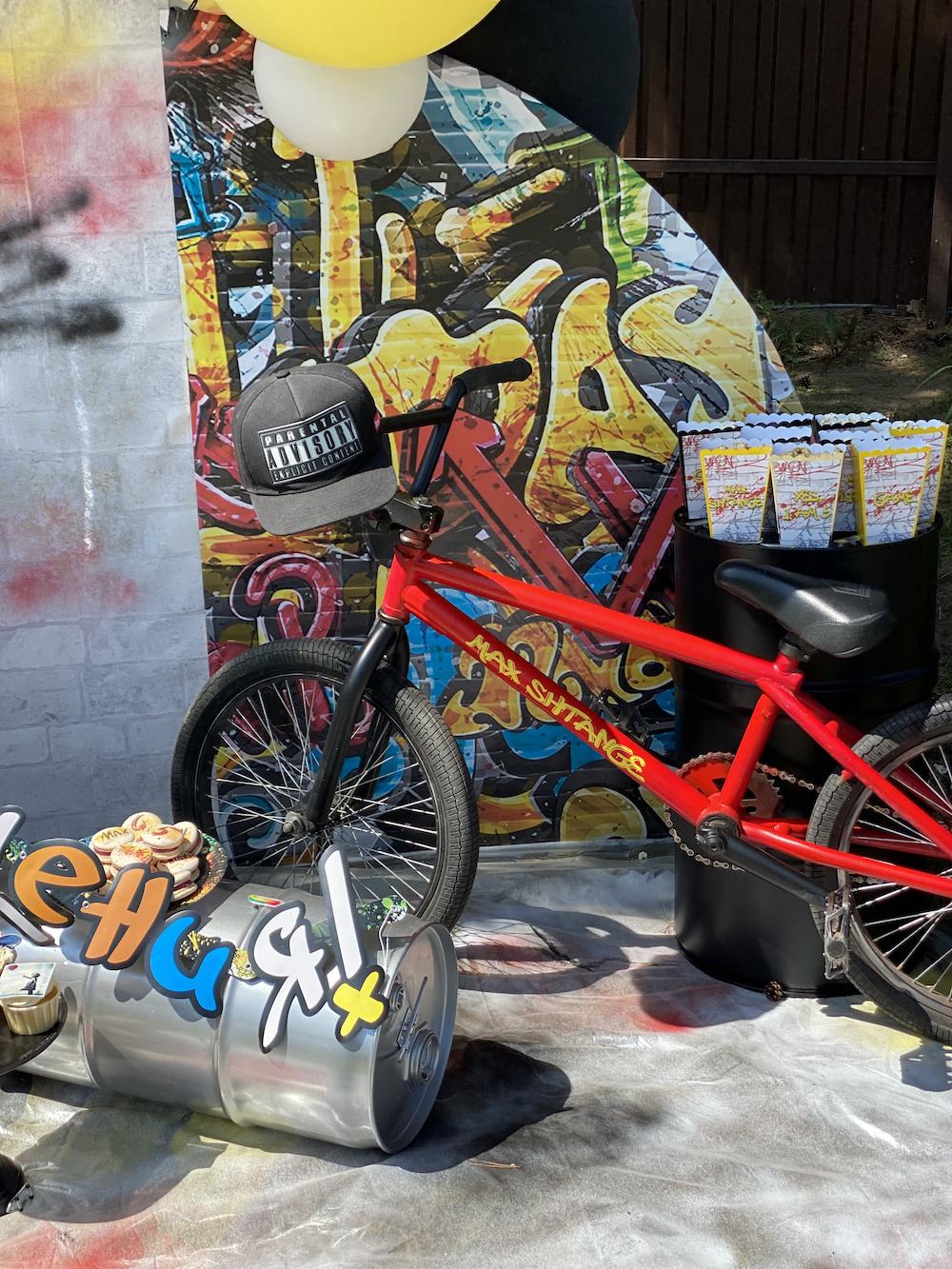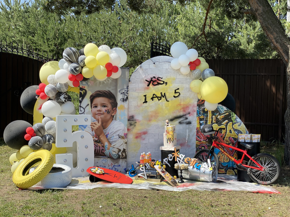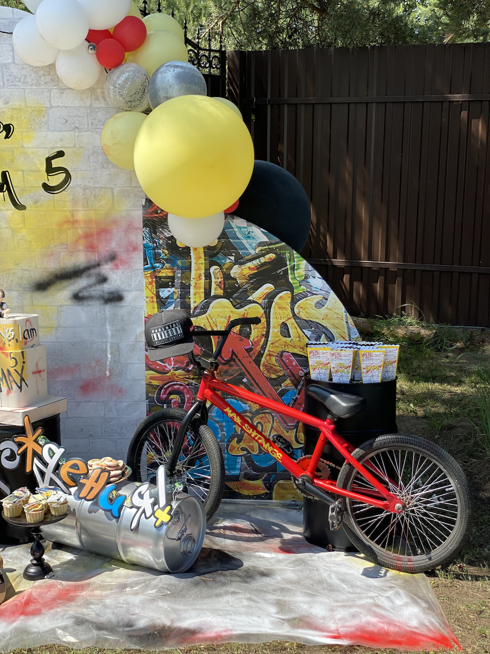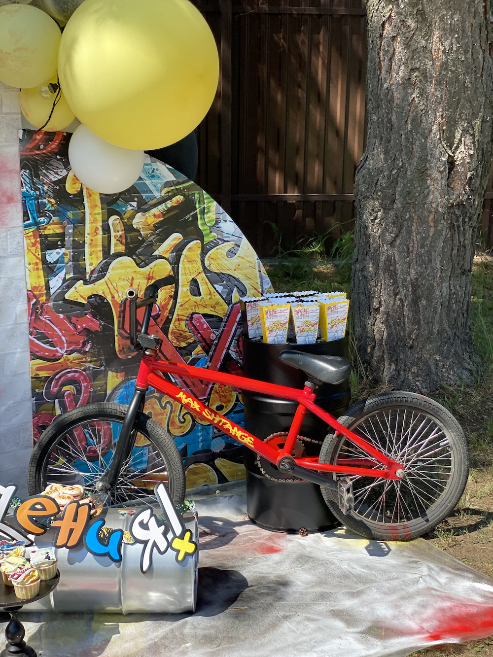 Крутая вечеринка для любителя спорта и стрит-арта! Наш декоратор даже смогла вписать подарки в созданную ей фотозону: скейт и трюковой велосипед. Специально для этого праздника были разработаны панно с граффити, этикетки для бутылочек и коробочки для попкорна.