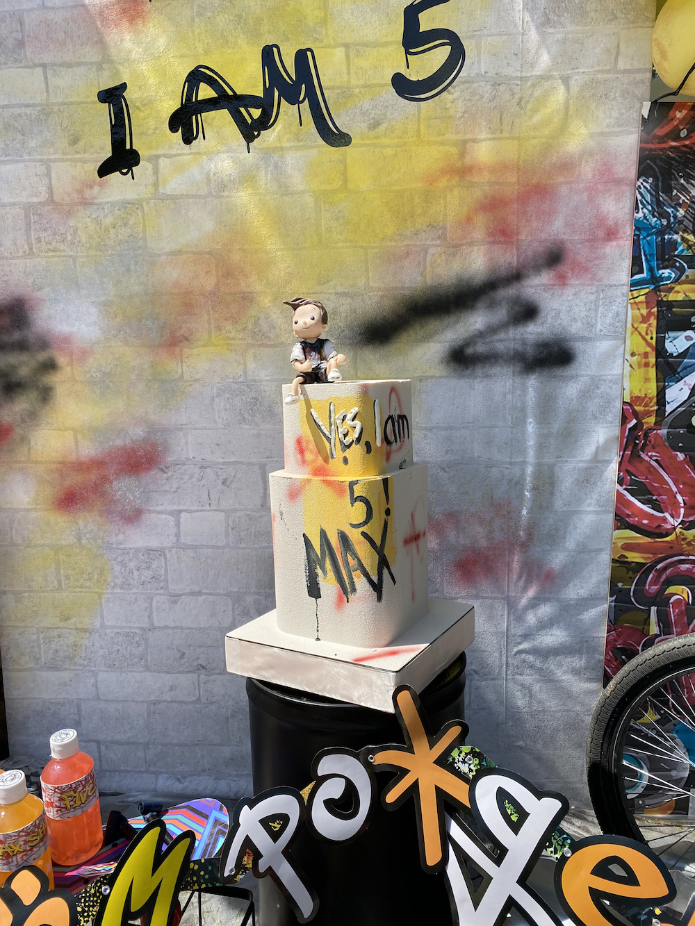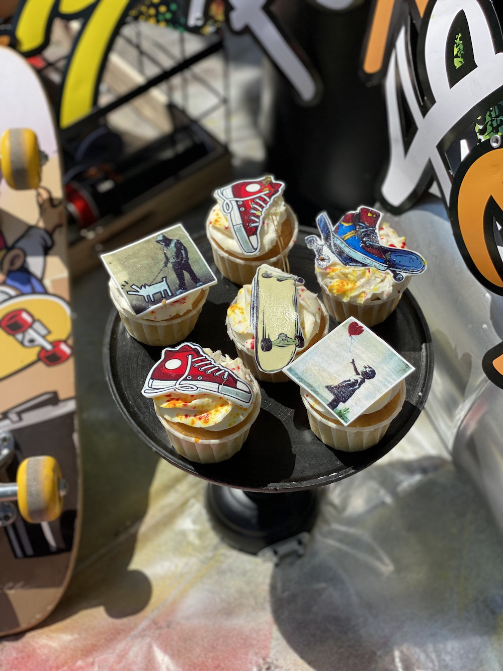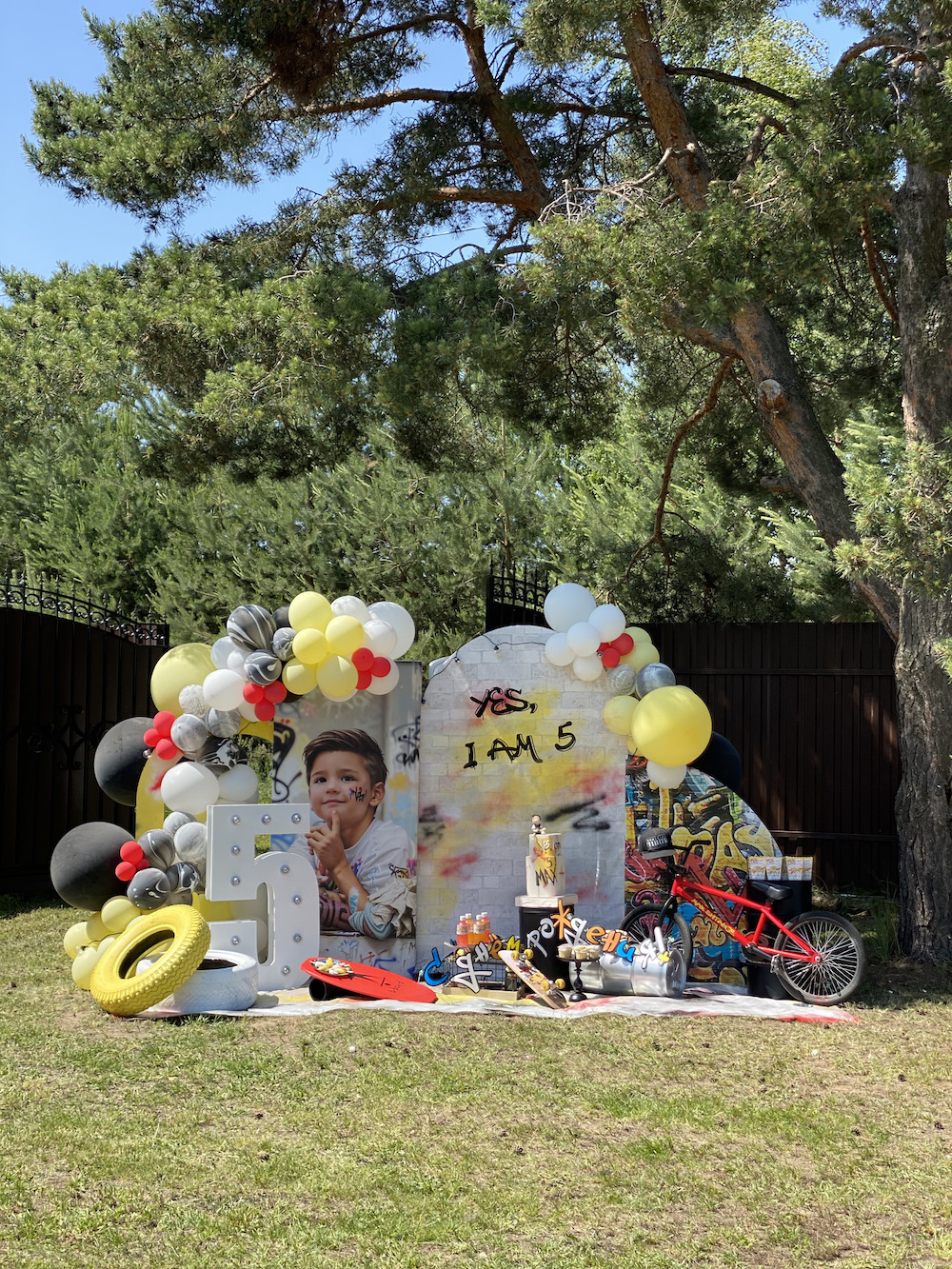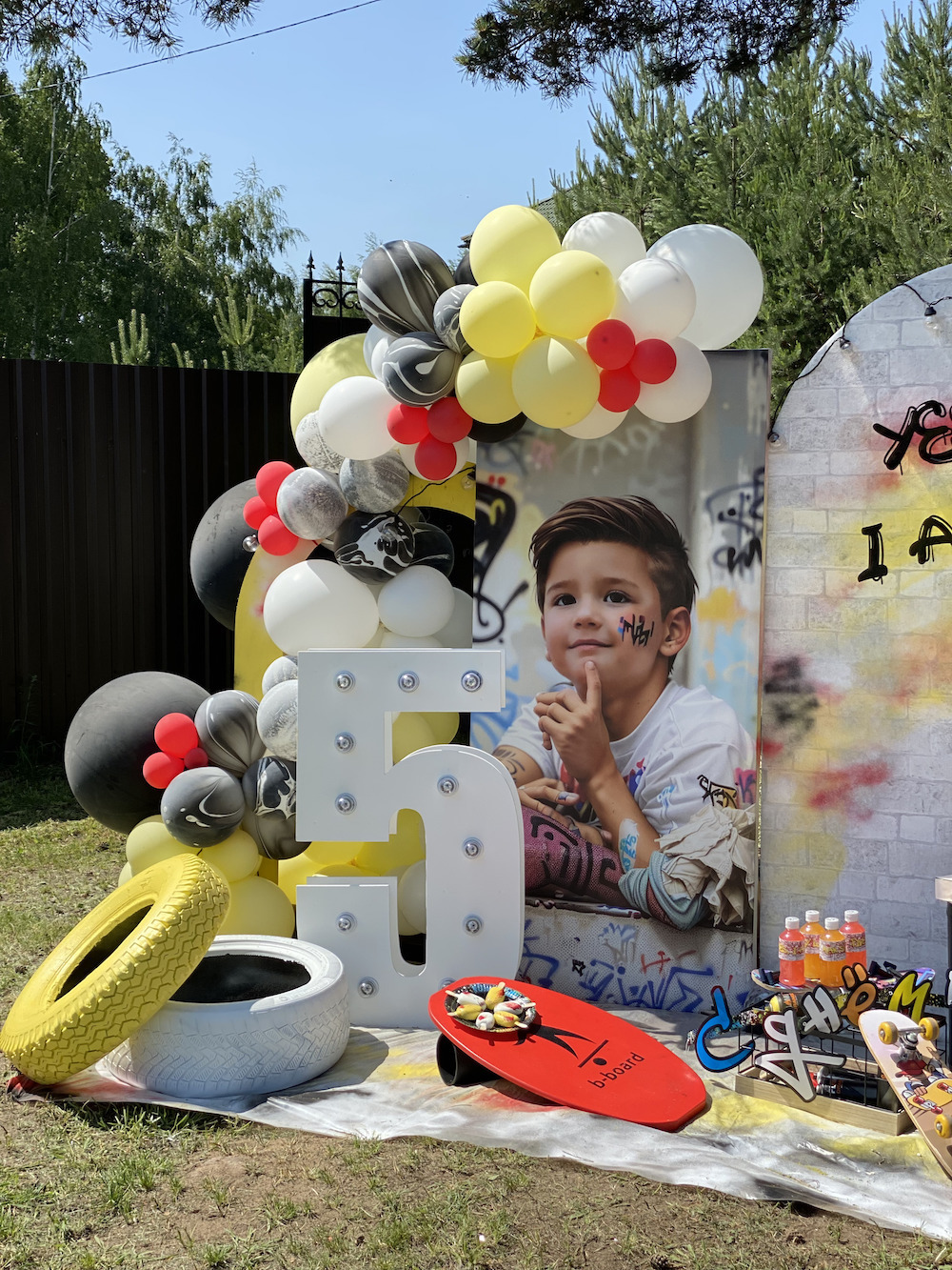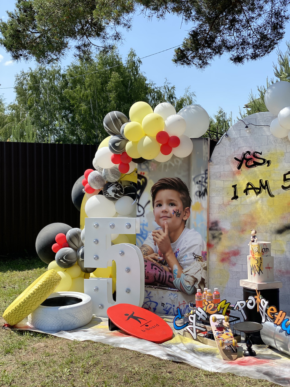 Крутая вечеринка для любителя спорта и стрит-арта! Наш декоратор даже смогла вписать подарки в созданную ей фотозону: скейт и трюковой велосипед. Специально для этого праздника были разработаны панно с граффити, этикетки для бутылочек и коробочки для попкорна.